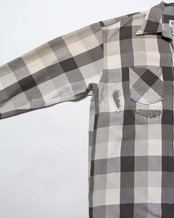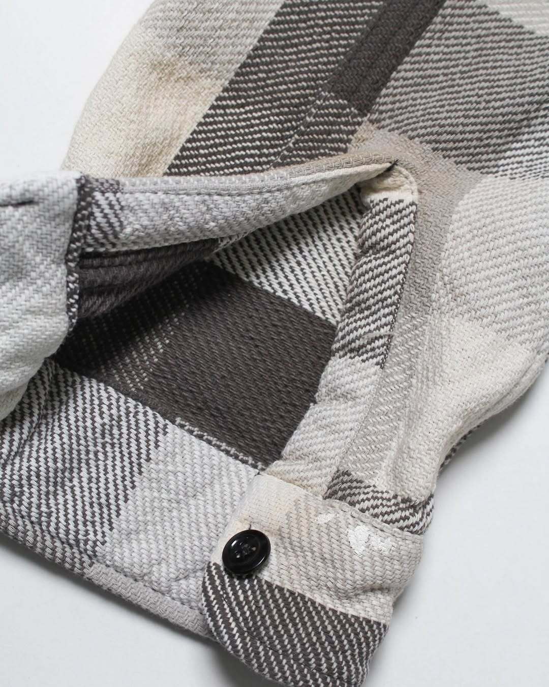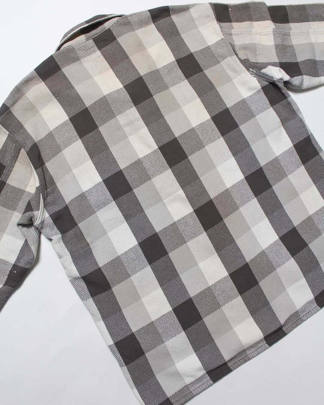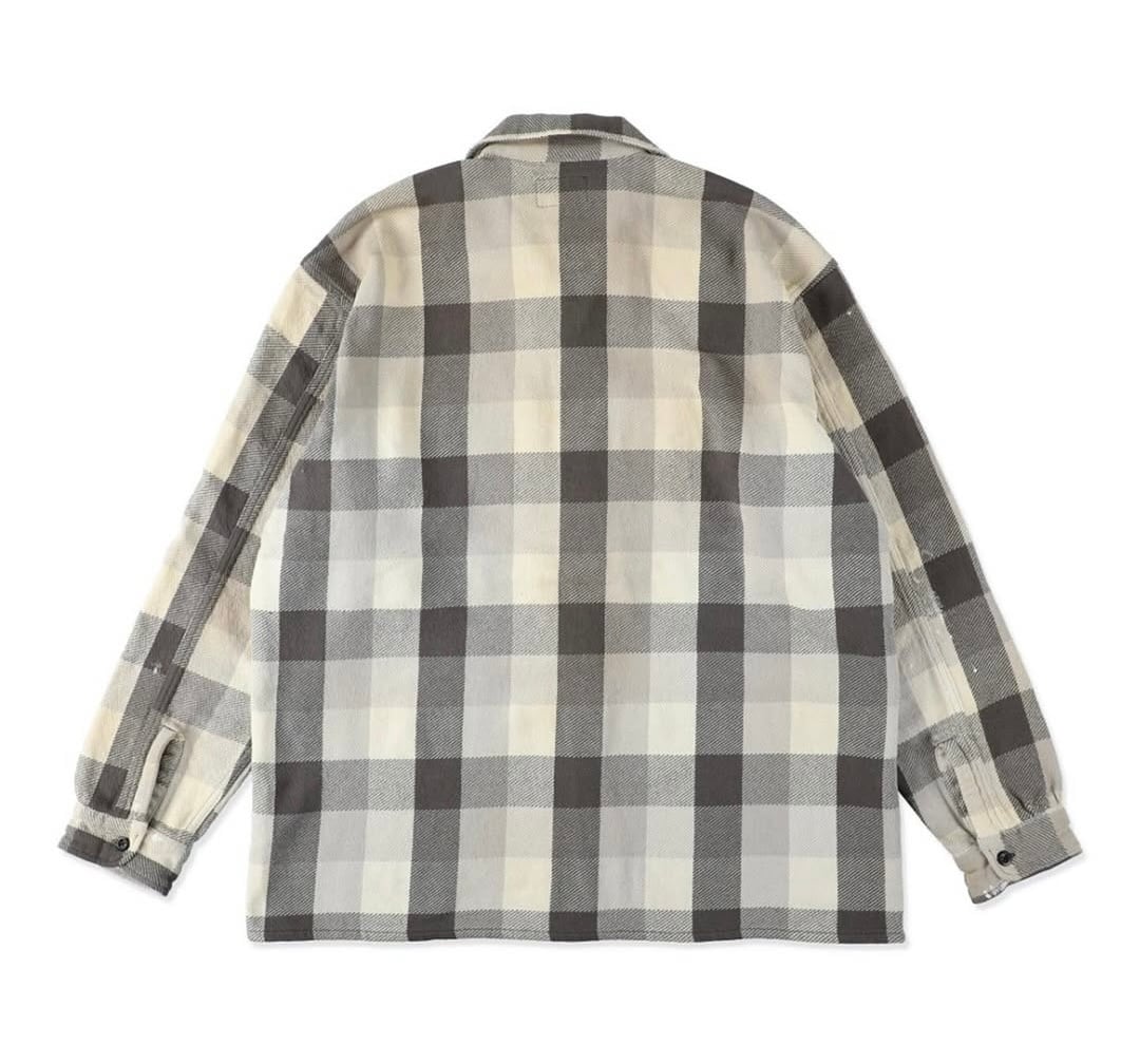 1940〜50年代、限られた有名ワークブランドだけが製作した厚地チェックネルの開襟シャツ。 寒冷地の伐採現場や鉄道作業、アウトドアユースなど、厳しい環境での防寒着として重宝された一着は、耐久性と保温性、そしてブランド独自のディティールが誇りを語っていた。 本作は、その時代特有の重厚なチェックネルをグレー×ホワイトの配色で再現。 肩や袖付けのステッチワーク、ポケット形状などの細部まで当時の意匠を踏襲しつつ、現代的なフィッティングへとアップデート。 着古し、リペアを加えた加工感表現が、ヴィンテージを思わせる存在感を