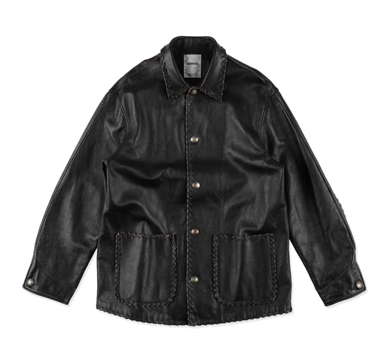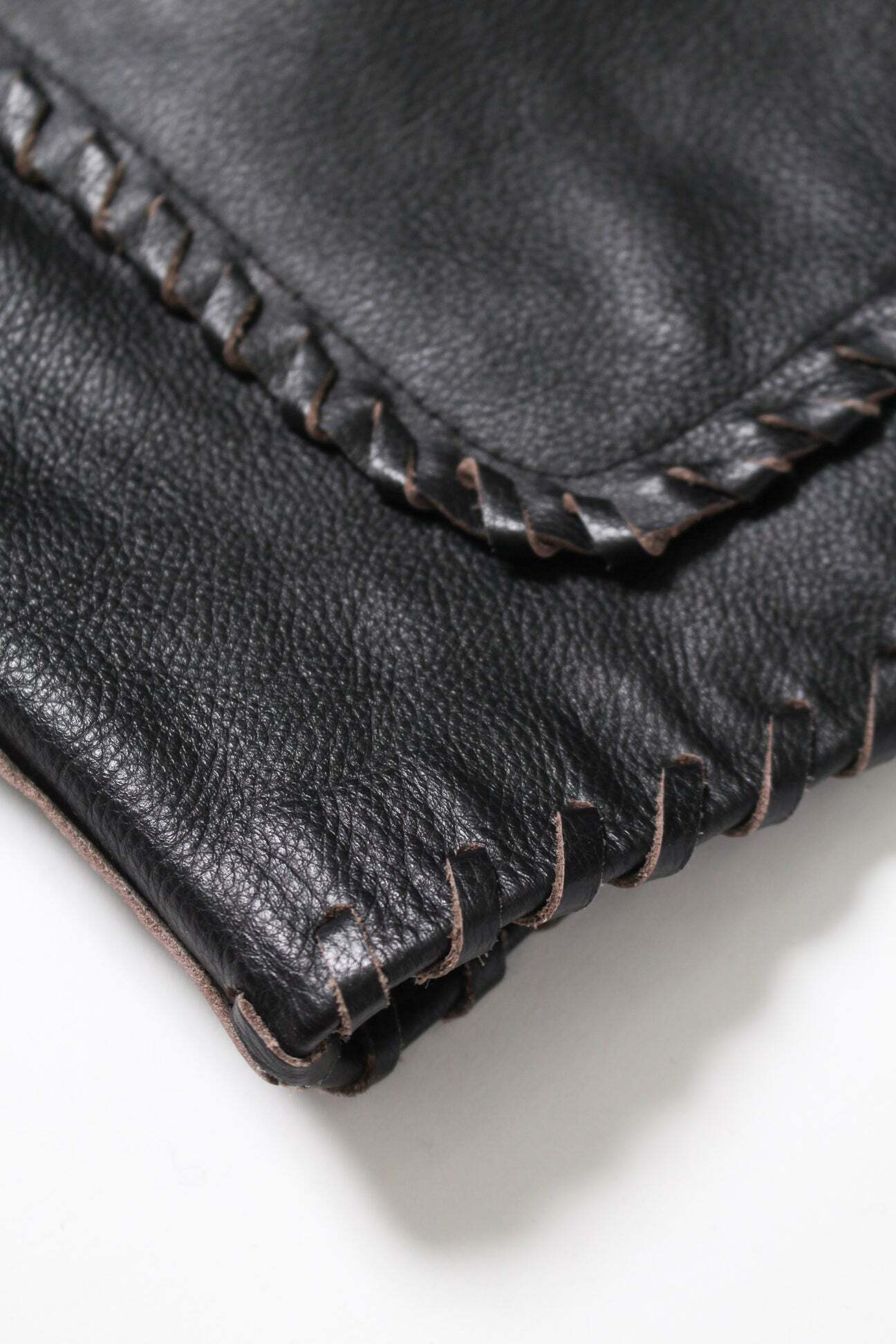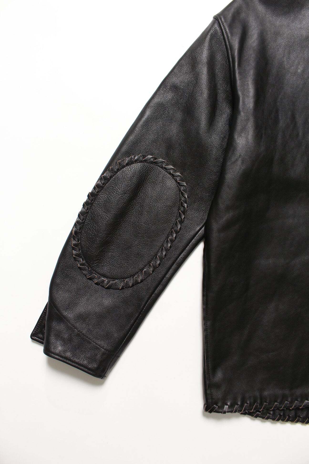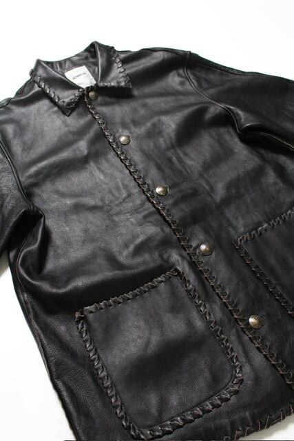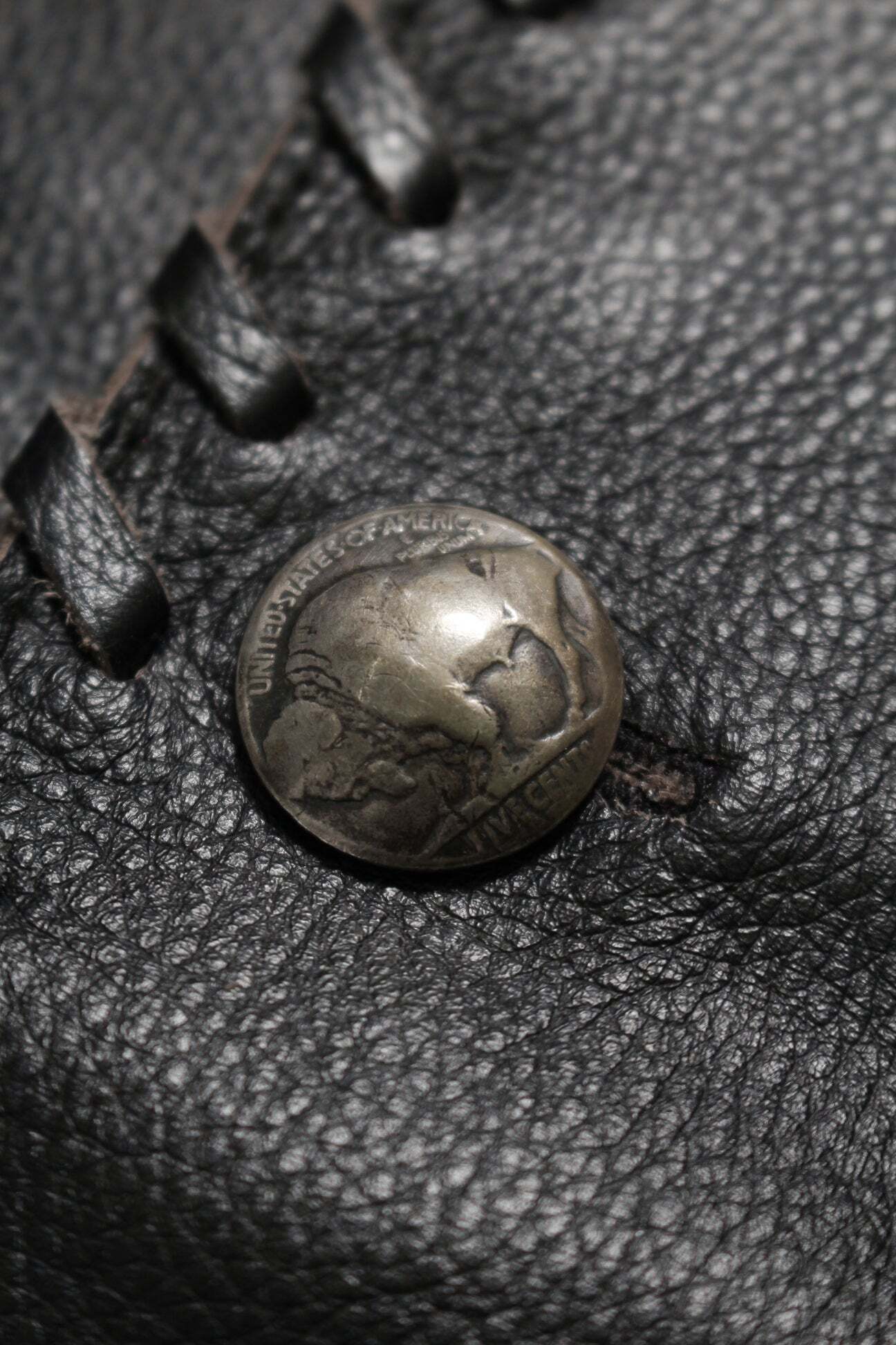 革端に平テープ状のレザーを巻いたカバーオール型が放つ、どこかオールドな佇まい。1900年代初頭の米セントコインを叩き出して仕立てたコンチョボタンがアクセントとなり、肘当て・ポケット・革端のレザーテープ(革紐)ワークが冴えるシンプルなジャケット。芯色を別色に設計した牛革は表面をブラックで仕上げ、着込むほどに擦れから芯色がのぞく——アメリカン・ヴィンテージ好きの心を射抜く一着。