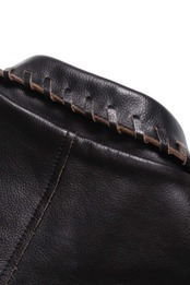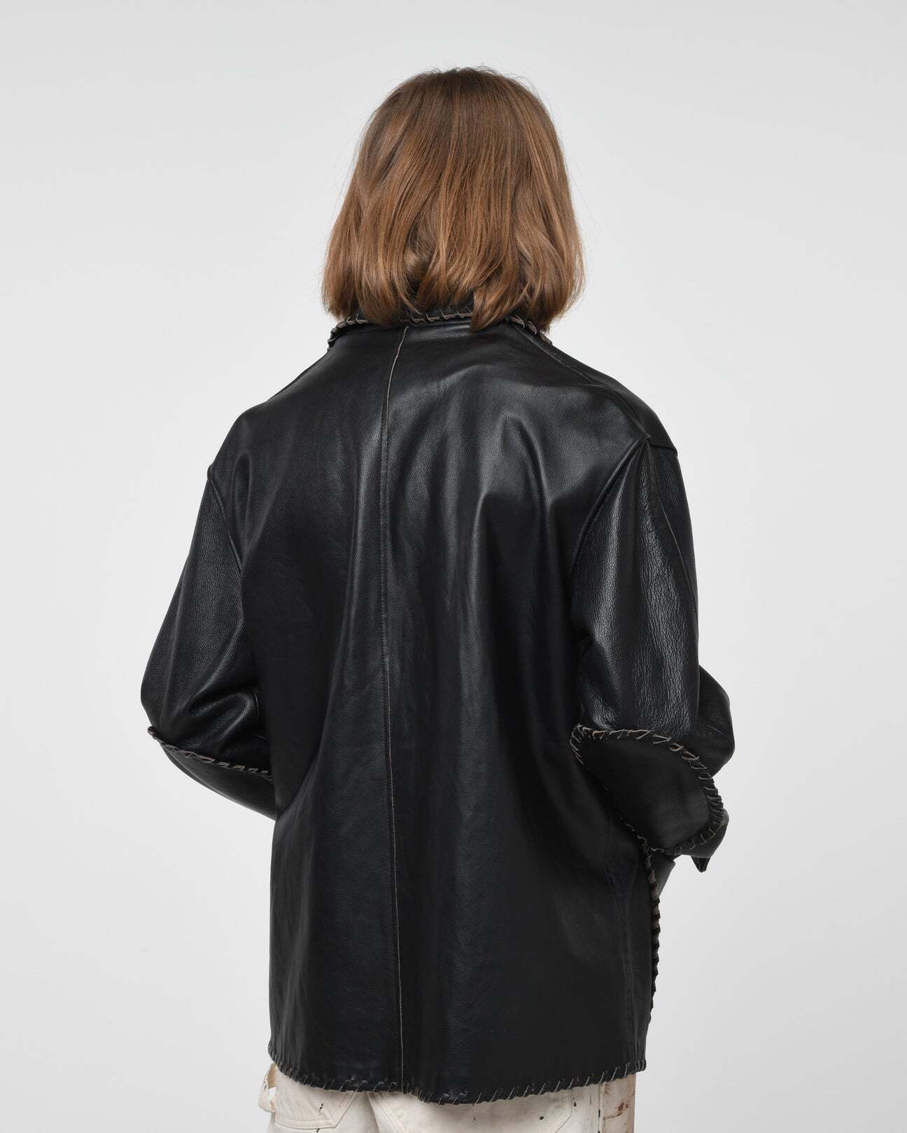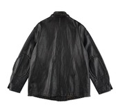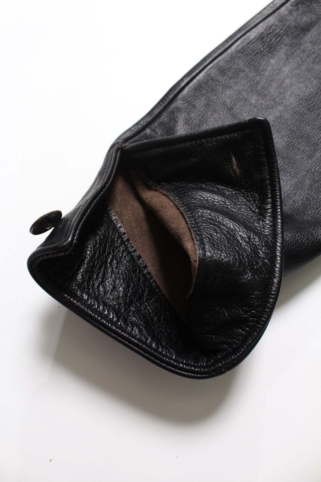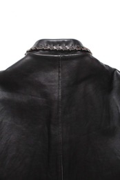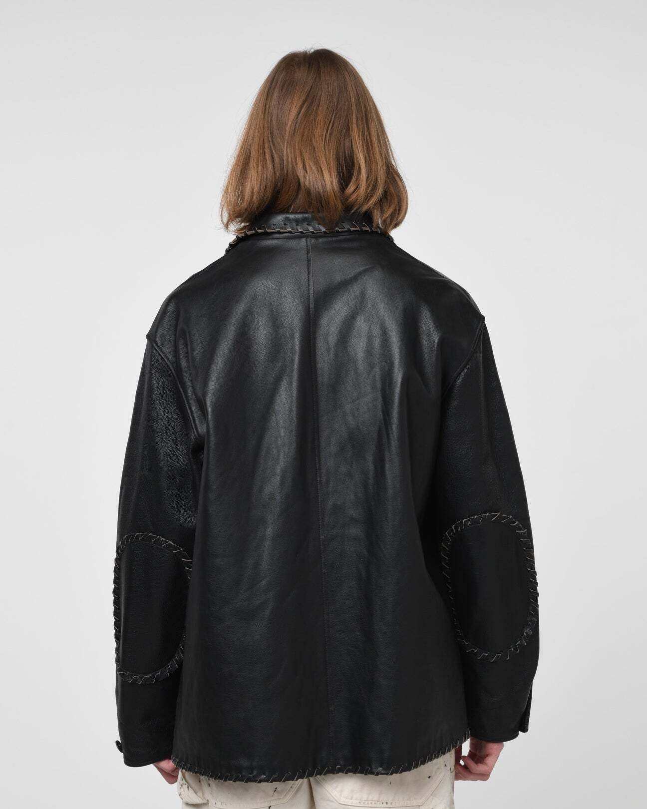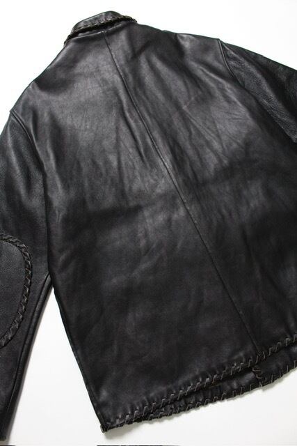 革端に平テープ状のレザーを巻いたカバーオール型が放つ、どこかオールドな佇まい。1900年代初頭の米セントコインを叩き出して仕立てたコンチョボタンがアクセントとなり、肘当て・ポケット・革端のレザーテープ(革紐)ワークが冴えるシンプルなジャケット。芯色を別色に設計した牛革は表面をブラックで仕上げ、着込むほどに擦れから芯色がのぞく——アメリカン・ヴィンテージ好きの心を射抜く一着。