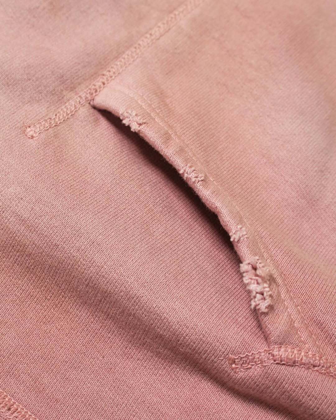 ボディには色褪せたピンクの裏毛スウェットを採用。長年の着用による退色や縮み、柔らかな生地の落ち感を再現し、まるで学生時代から愛用し続けたかのような佇まいに仕上げた。