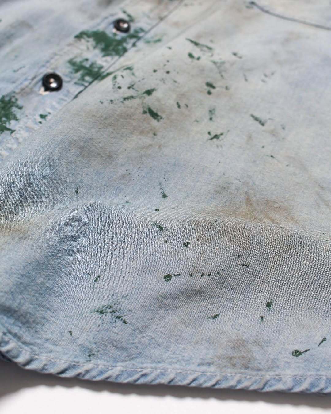 BOWWOW PAINT STAINED CHAMBRAY SHIRT, VENT HOLES AGED INDIGO