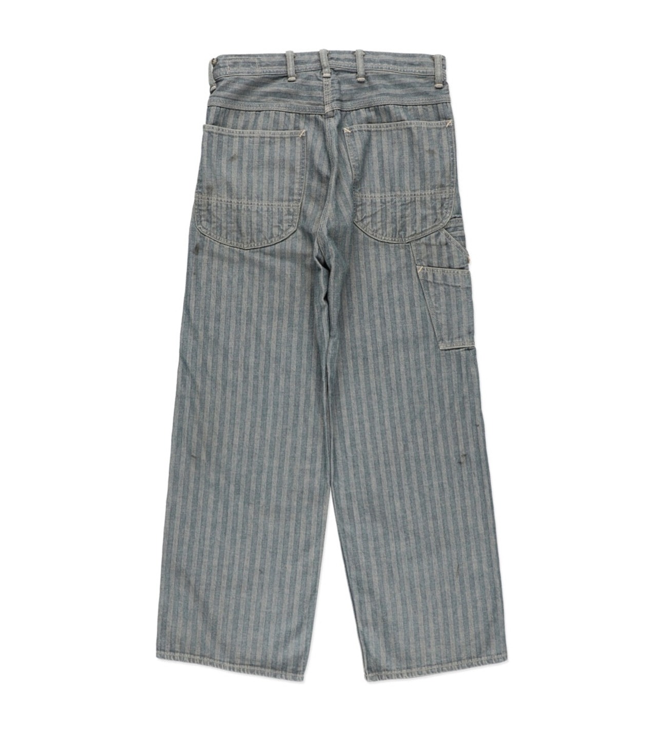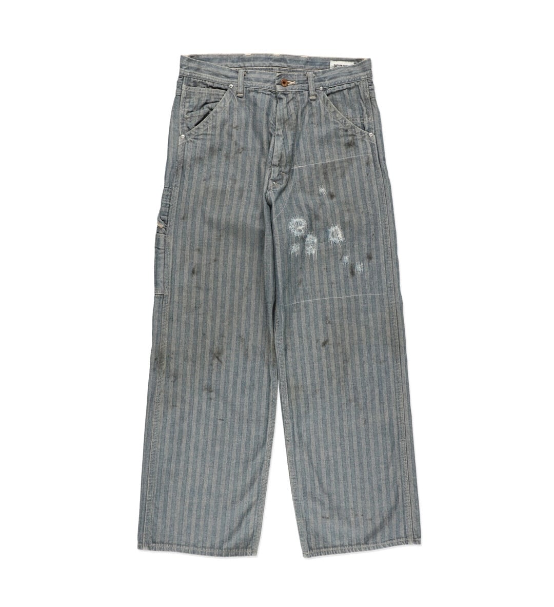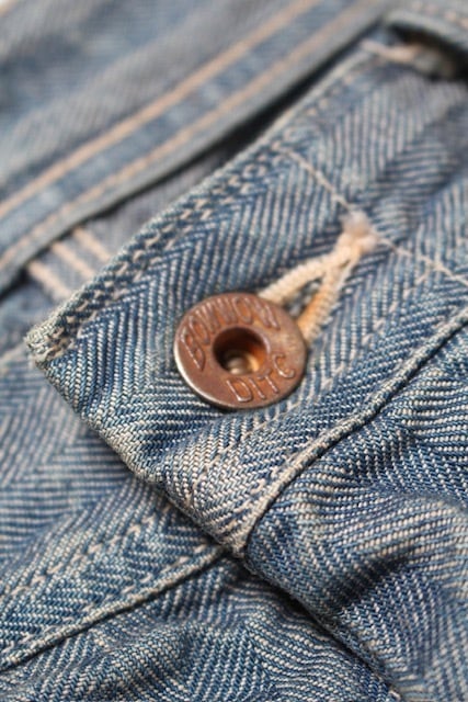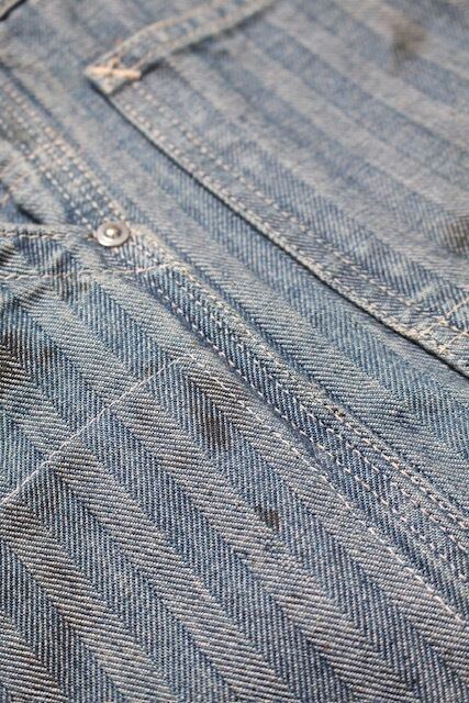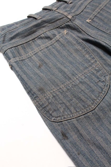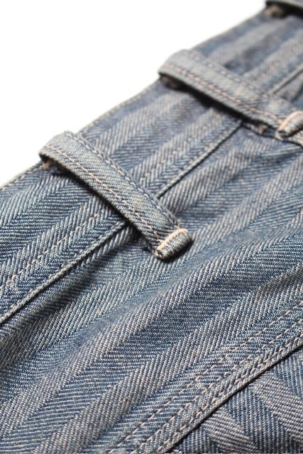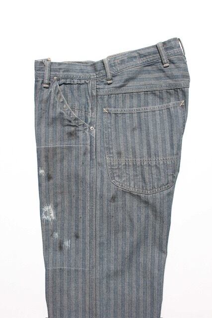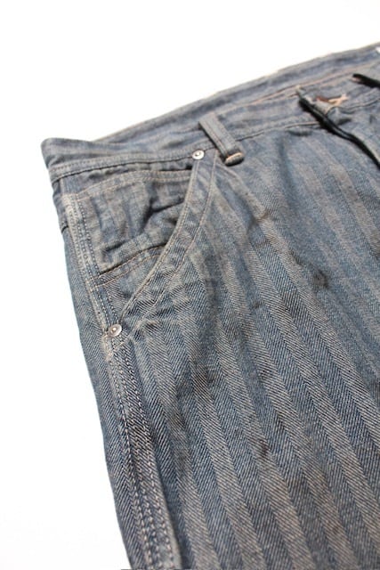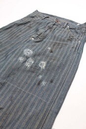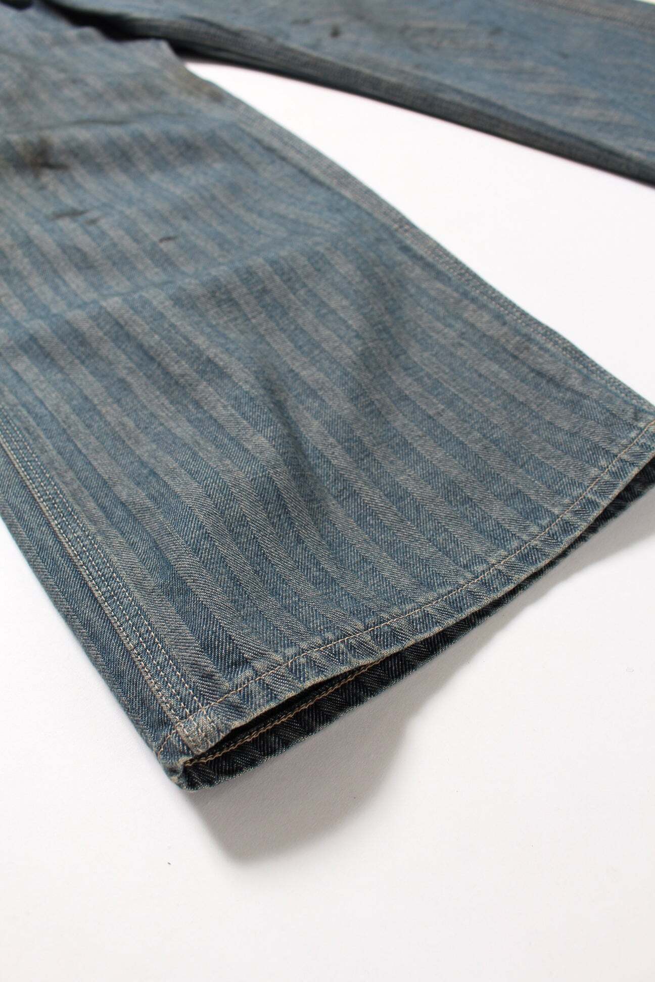 40〜50年代に見られるワークパンツの代表的なディティールを踏まえ、当時の無骨な構造とシルエットバランスをそのまま活かした一本。インディゴヘリンボーンならではの表情と、古い時代のワークウェアらしい実用性の匂いを残している。 リペアを繰り返しながら履き続けられてきた様子をイメージし、補修痕や擦れた表情までリアルに表現。オイル汚れや黒ずみなど、モーター関連企業の現場を思わせる汚れ加工を重ね、ガレージワークの空気感を色濃く残した仕上がりになっている。