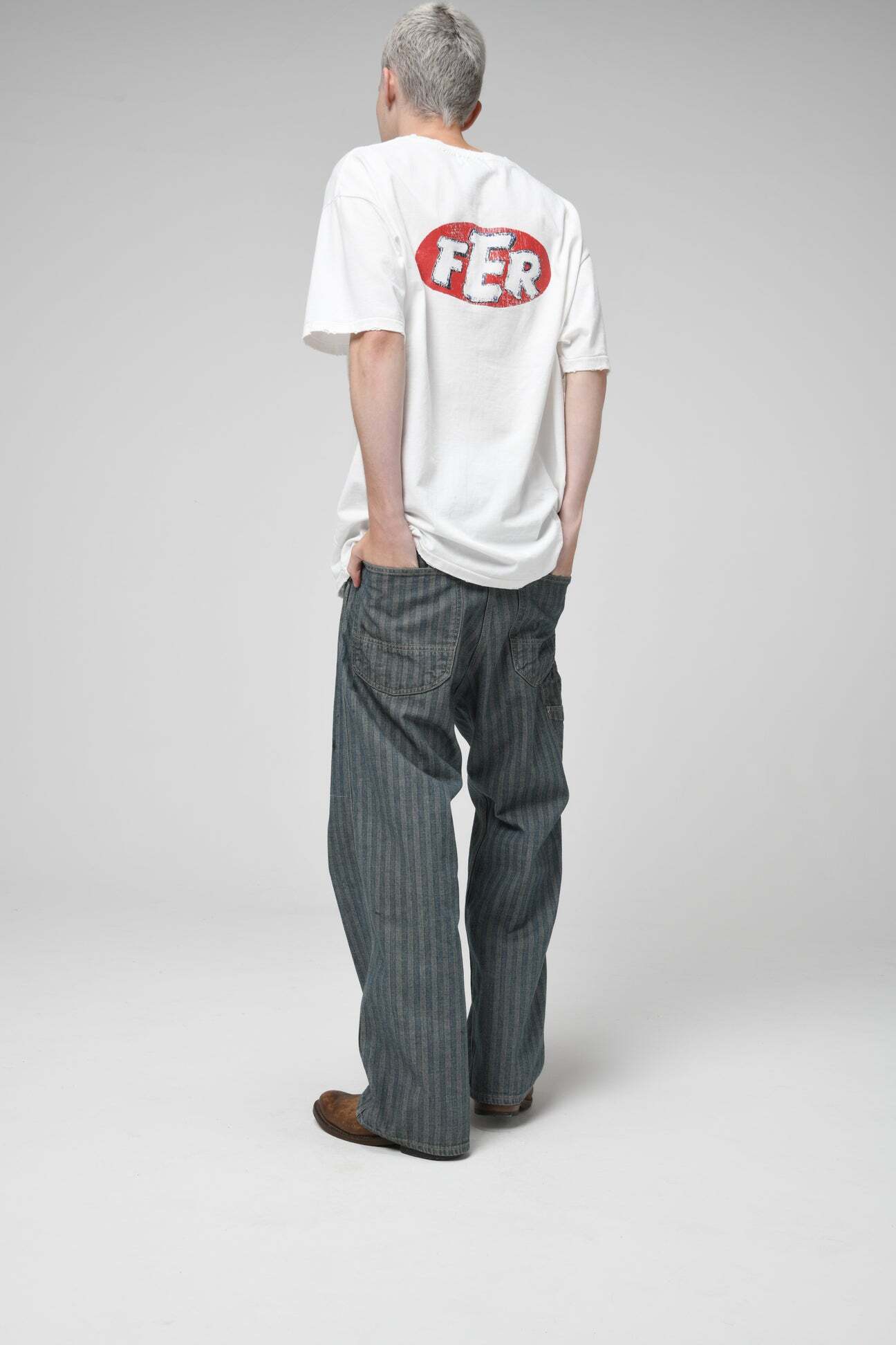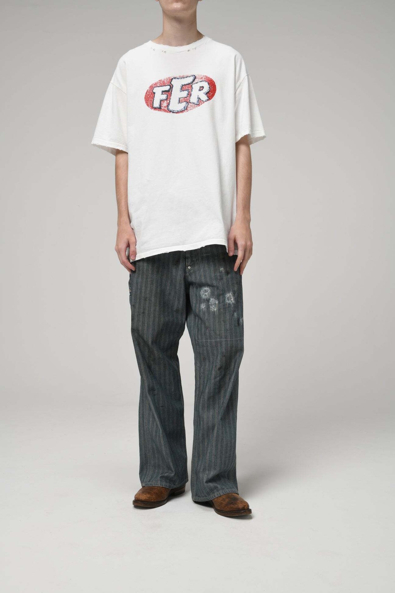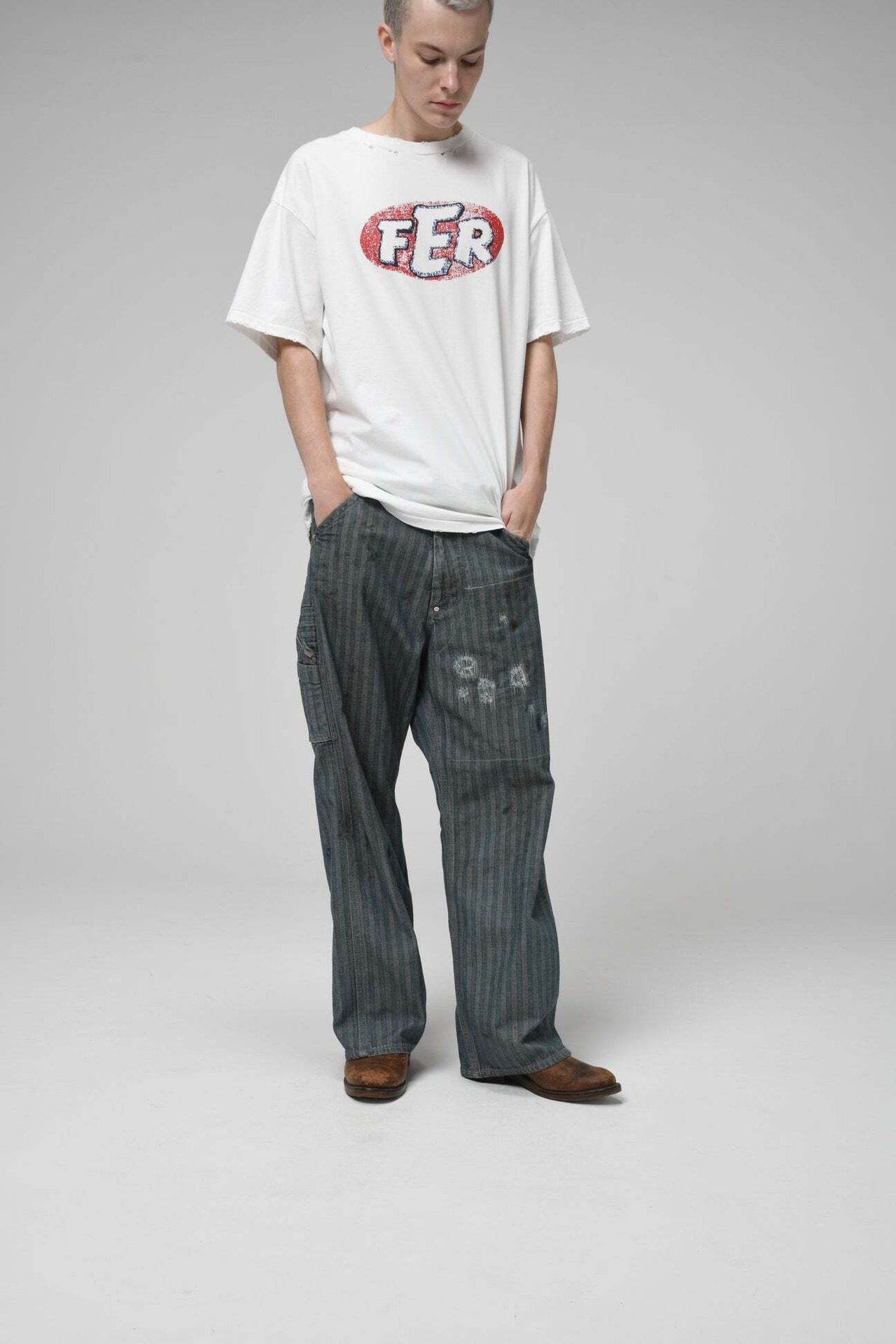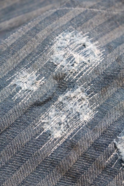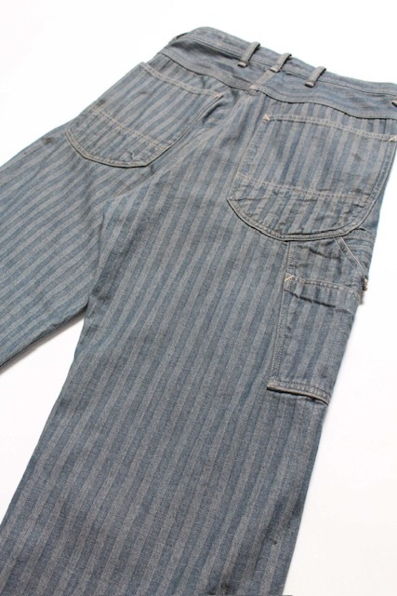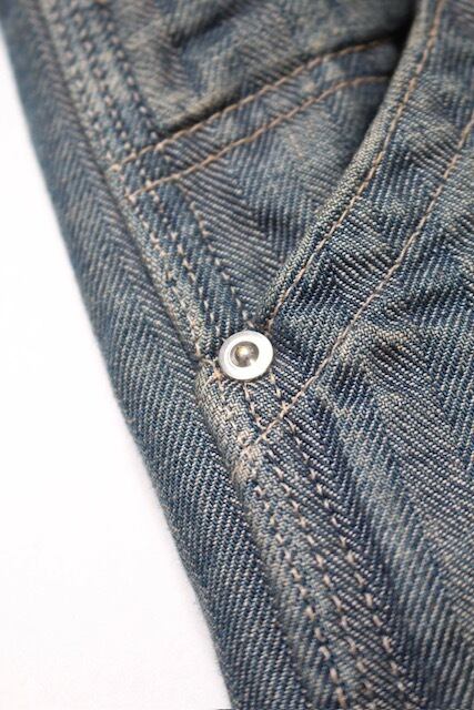 40〜50年代に見られるワークパンツの代表的なディティールを踏まえ、当時の無骨な構造とシルエットバランスをそのまま活かした一本。インディゴヘリンボーンならではの表情と、古い時代のワークウェアらしい実用性の匂いを残している。 リペアを繰り返しながら履き続けられてきた様子をイメージし、補修痕や擦れた表情までリアルに表現。オイル汚れや黒ずみなど、モーター関連企業の現場を思わせる汚れ加工を重ね、ガレージワークの空気感を色濃く残した仕上がりになっている。