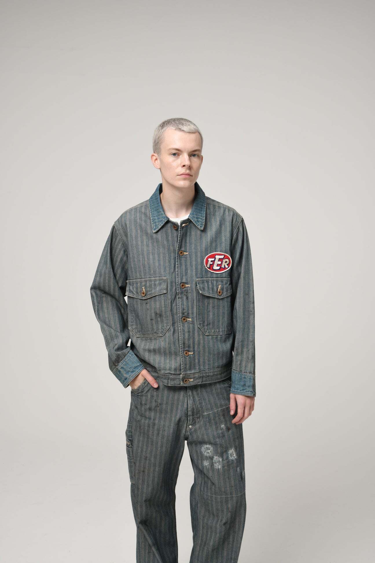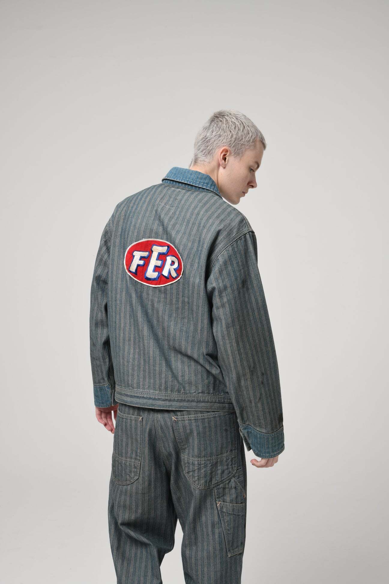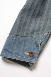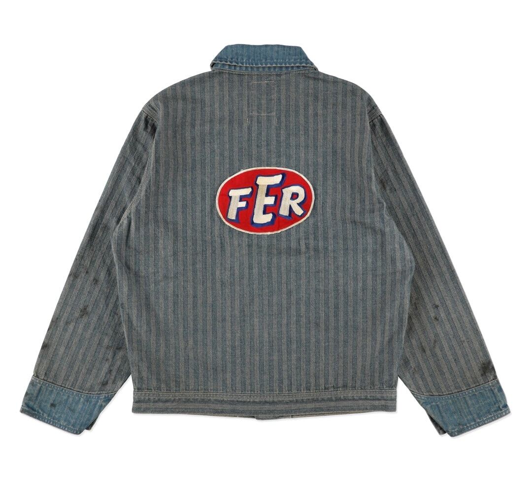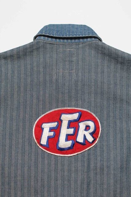 40〜50年代に見られるショートワークジャケットの代表的な形をベースに、インディゴヘリンボーン生地で製作。当時のワークウェアらしい無骨なバランスと、素材の表情をそのまま活かしている。 モーター関連メーカーをイメージして構成したロゴワッペンを配し、工業的で力強い空気感をプラス。オイル汚れや擦れを思わせるリアルな加工表現を重ね、ガレージで使い込まれてきたような佇まいに仕上げている。 実在していそうな企業ユニフォームのようなリアリティと、土臭さの残る表情が共存する一着になっている。