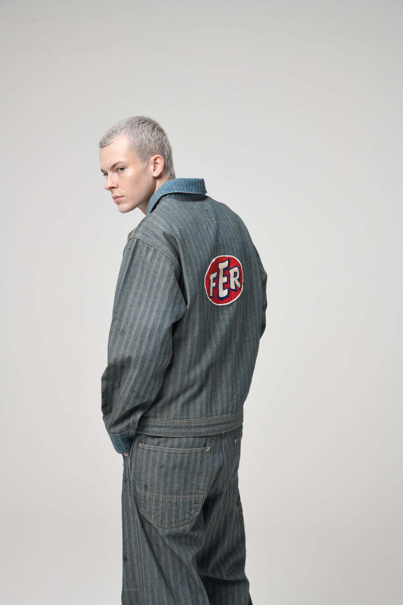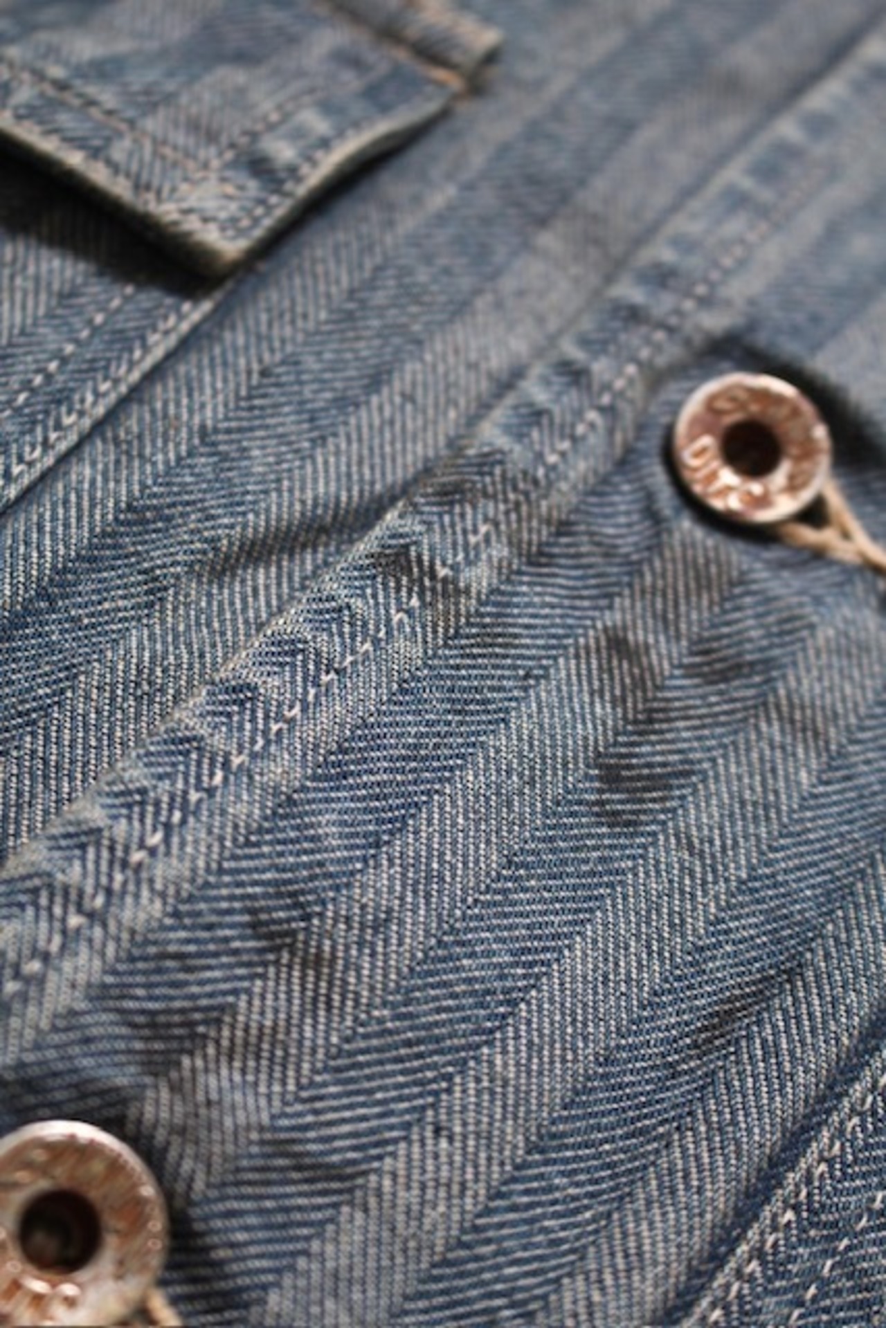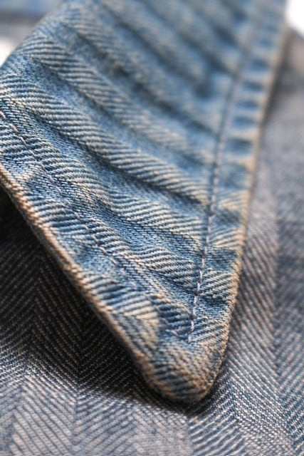 40〜50年代に見られるショートワークジャケットの代表的な形をベースに、インディゴヘリンボーン生地で製作。当時のワークウェアらしい無骨なバランスと、素材の表情をそのまま活かしている。 モーター関連メーカーをイメージして構成したロゴワッペンを配し、工業的で力強い空気感をプラス。オイル汚れや擦れを思わせるリアルな加工表現を重ね、ガレージで使い込まれてきたような佇まいに仕上げている。 実在していそうな企業ユニフォームのようなリアリティと、土臭さの残る表情が共存する一着になっている。