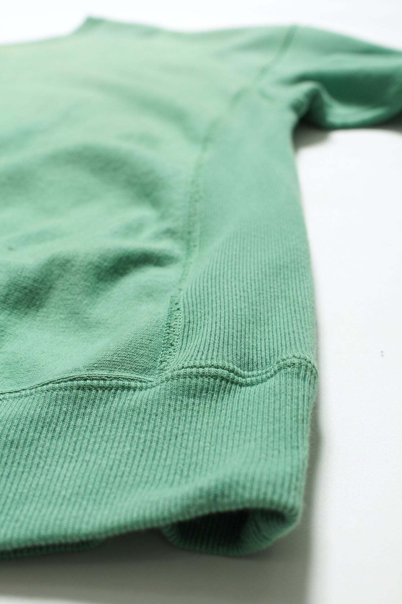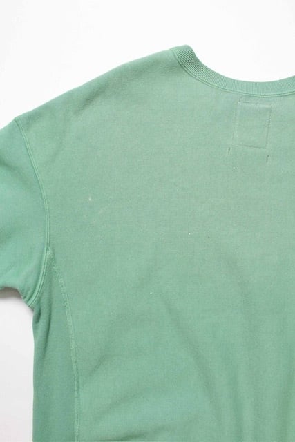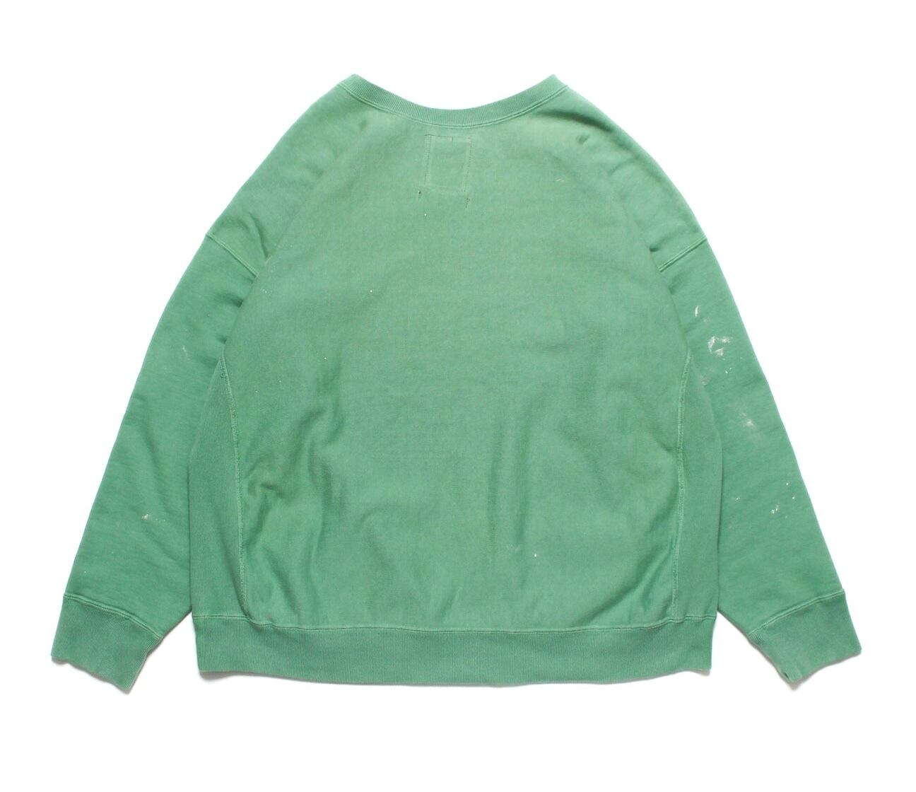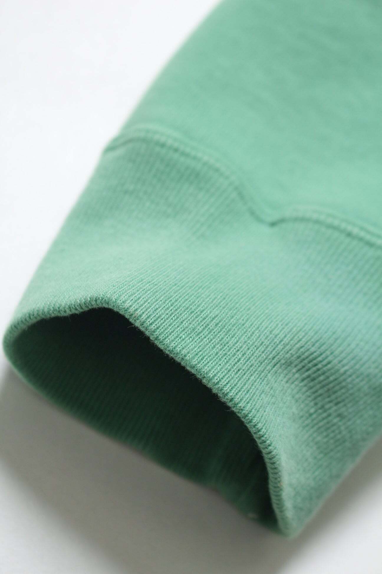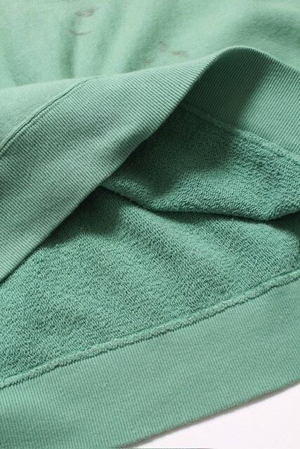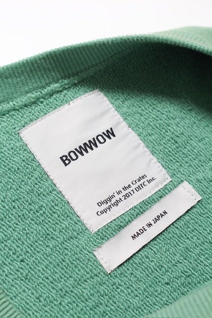 BOW WOWとしてはやや発色の良いグリーンをあえて採用し、リアルな経年変化表現を重ねることで、色の強さと使い込まれた表情が共存するバランスに仕上げている。 1960年代以前のヴィンテージクルースウェットに見られるシルエット、ディティール、縫製仕様を踏まえ、当時の空気感を活かした設計。独自に調整を重ねた縫製バランスにより、ステッチの表情やテンションまで細かくコントロールしている。 脇には可動域を考慮したガゼットを配置し、起毛無しのオールシーズン対応厚地裏毛を使用。特別な編み機が生み出すヴィンテージの質感をそのまま残した仕上がりになっている。