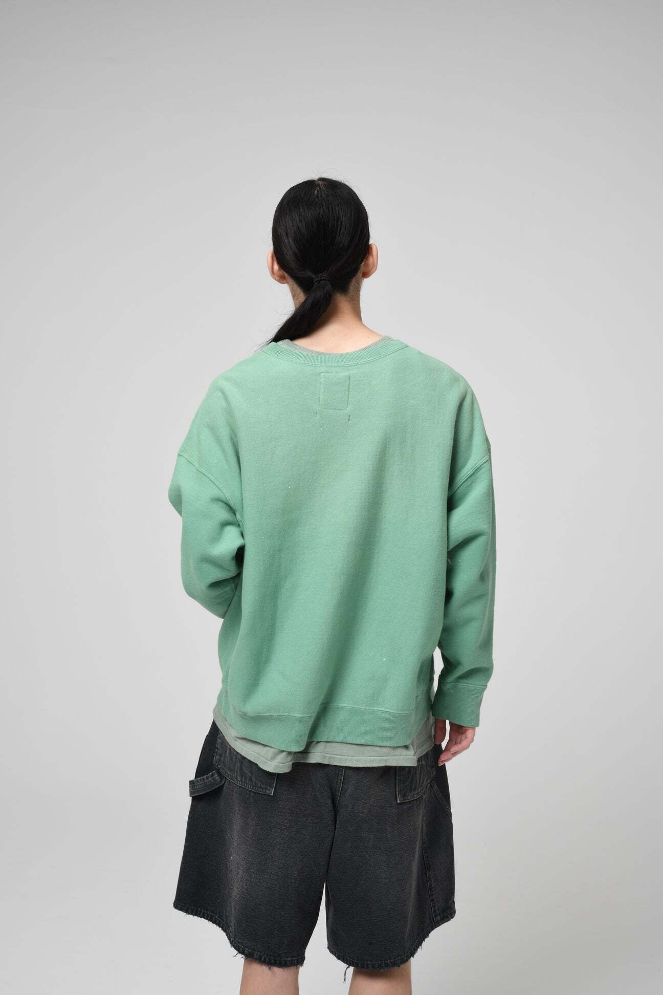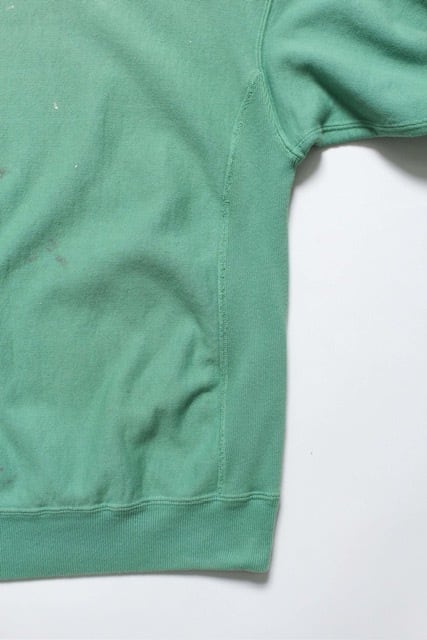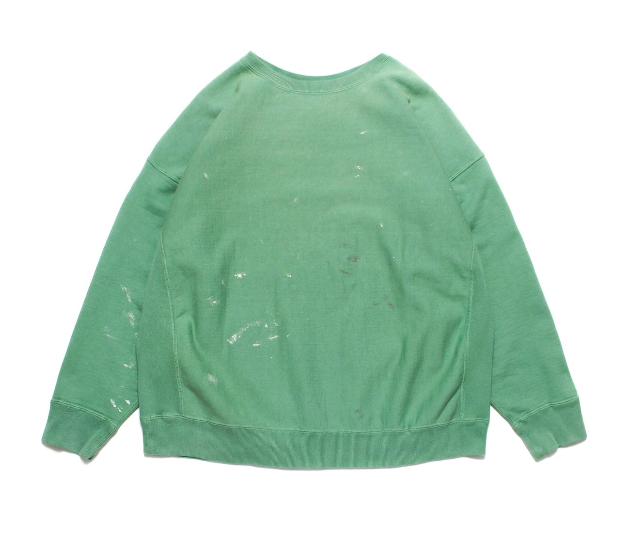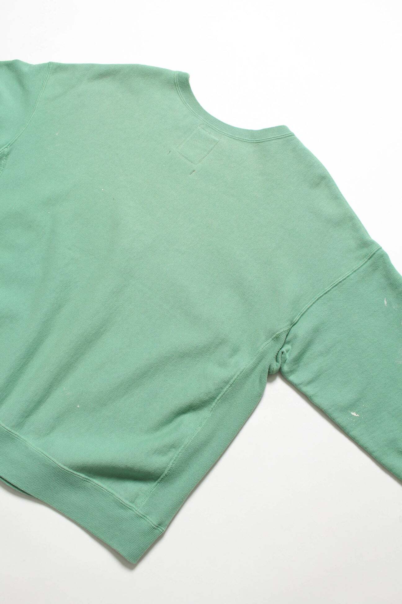 BOW WOWとしてはやや発色の良いグリーンをあえて採用し、リアルな経年変化表現を重ねることで、色の強さと使い込まれた表情が共存するバランスに仕上げている。 1960年代以前のヴィンテージクルースウェットに見られるシルエット、ディティール、縫製仕様を踏まえ、当時の空気感を活かした設計。独自に調整を重ねた縫製バランスにより、ステッチの表情やテンションまで細かくコントロールしている。 脇には可動域を考慮したガゼットを配置し、起毛無しのオールシーズン対応厚地裏毛を使用。特別な編み機が生み出すヴィンテージの質感をそのまま残した仕上がりになっている。