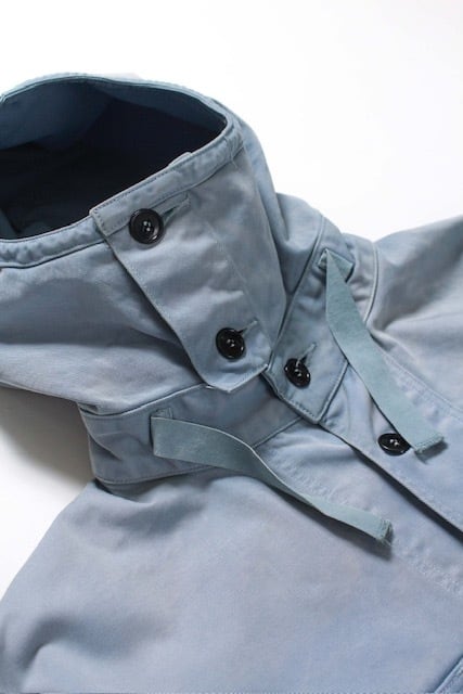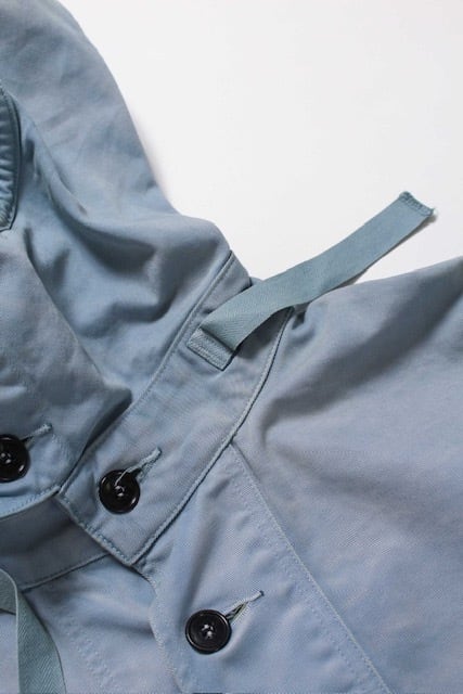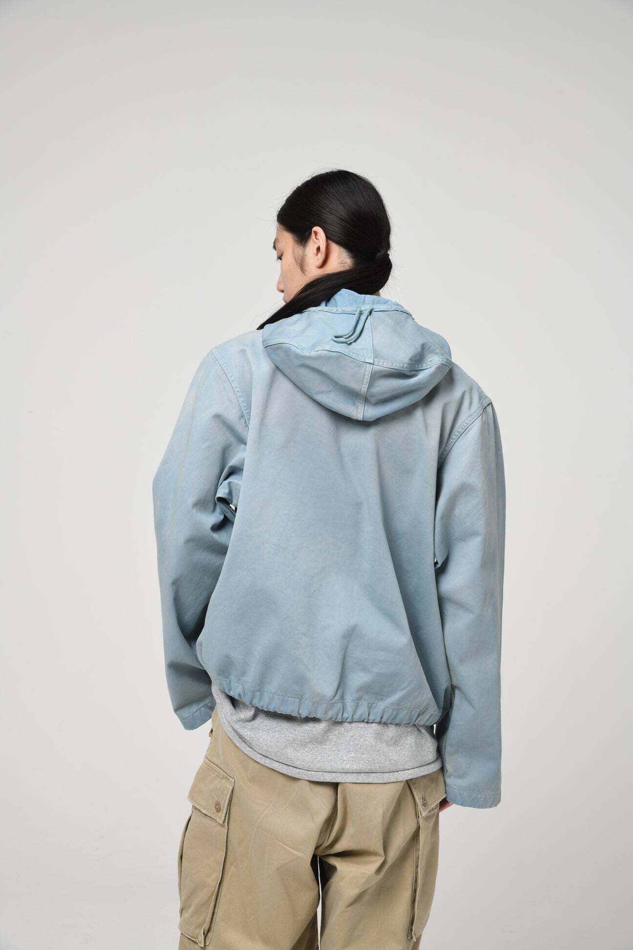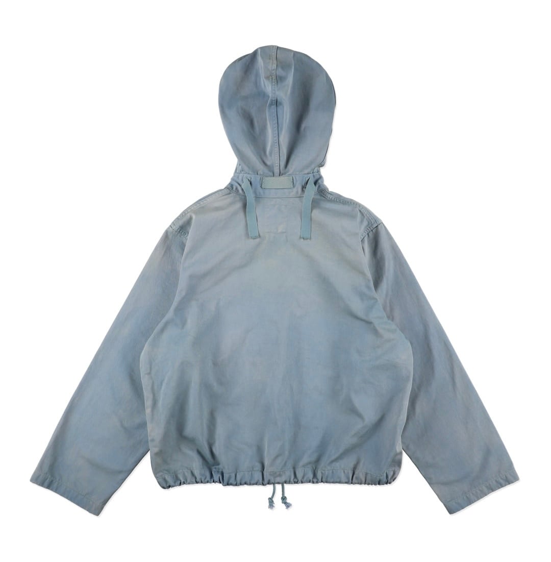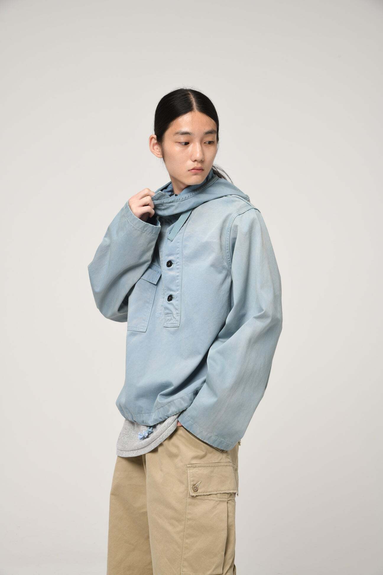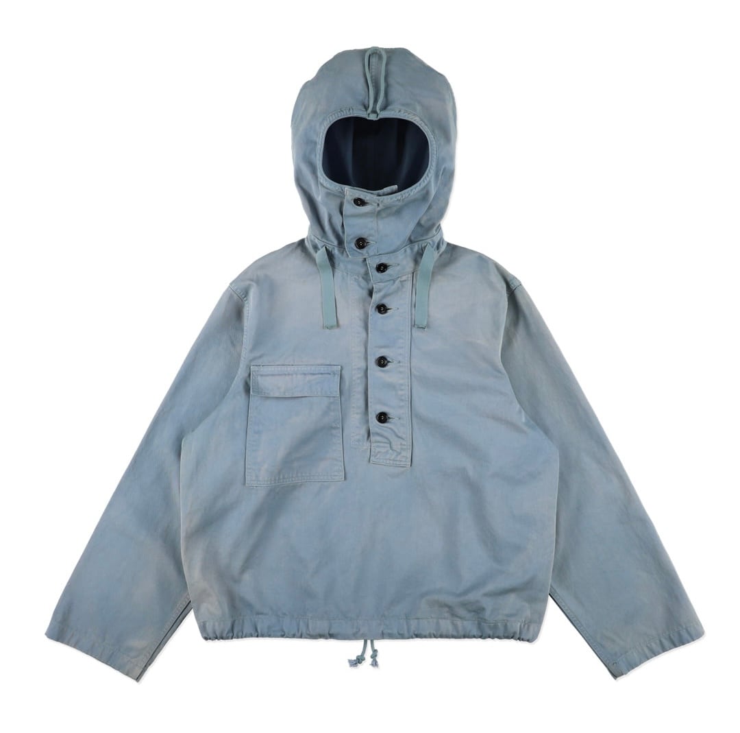 Based on the earliest US NAVY salvage parka, recreating uneven dye character derived from period protective, stain-resistant fabric treatments. Designed as protective wear intended to be used with work/protective equipment. Blue-toned dye and processing create irregular depth, evoking real-world jobsite wear. Features the early-spec single chest pocket front, with a stripped-down build and raw presence unique to this model.