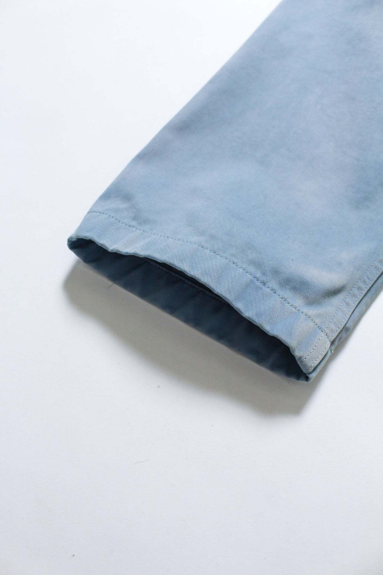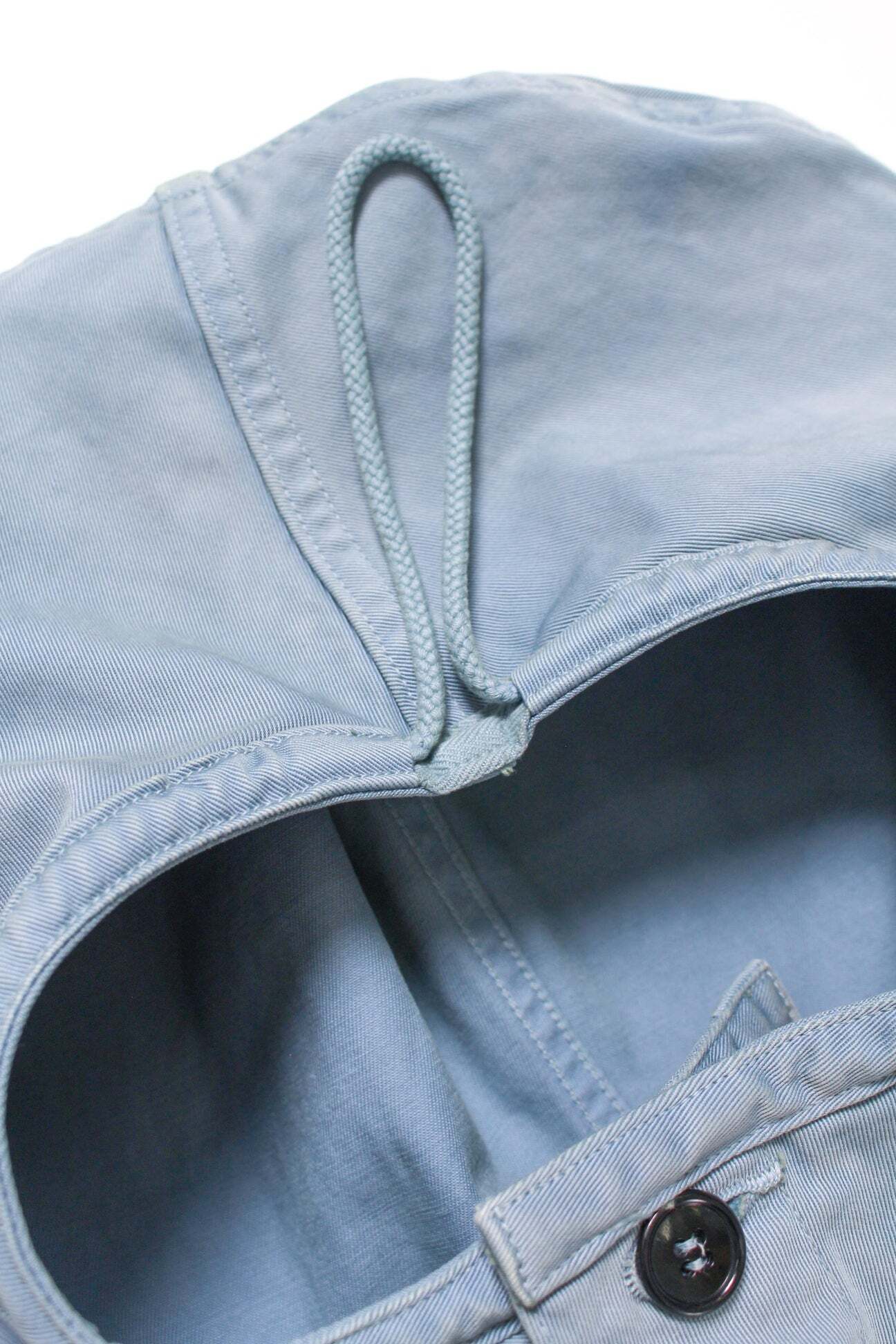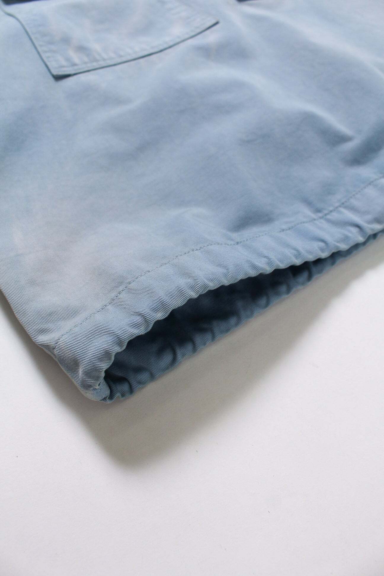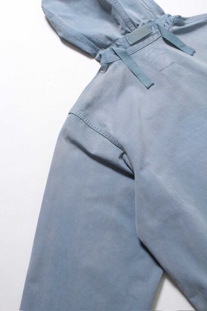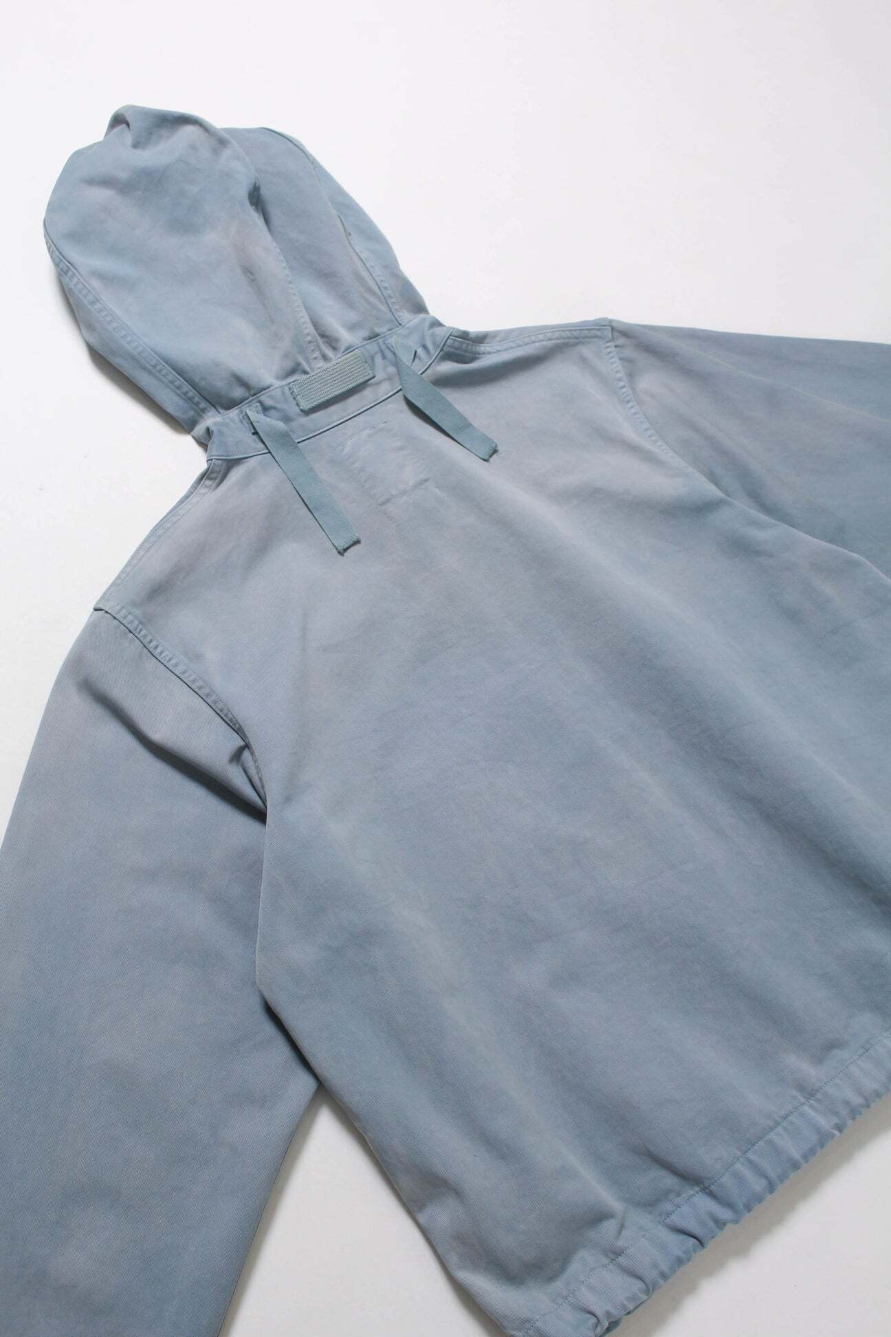 Based on the earliest US NAVY salvage parka, recreating uneven dye character derived from period protective, stain-resistant fabric treatments. Designed as protective wear intended to be used with work/protective equipment. Blue-toned dye and processing create irregular depth, evoking real-world jobsite wear. Features the early-spec single chest pocket front, with a stripped-down build and raw presence unique to this model.