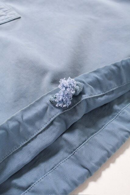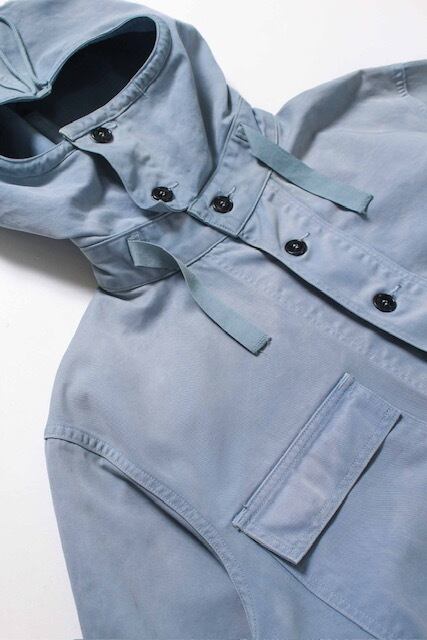 US NAVYのサルベージパーカ最初期型を背景に、当時の防汚性を考慮した特殊生地加工によるムラのある染め感を再現している。プロテクティブ装備と共に着用される前提で設計された、防護服としての役割を持つ一着。 青系の染料と加工による不均一な表情が、実際の作業現場で使い込まれたようなリアリティを生み出している。 フロントは胸一ポケットのみの最初期仕様を踏襲し、無駄を削ぎ落とした構成と荒さの残る佇まいが、このモデルならではの空気感を形作っている。