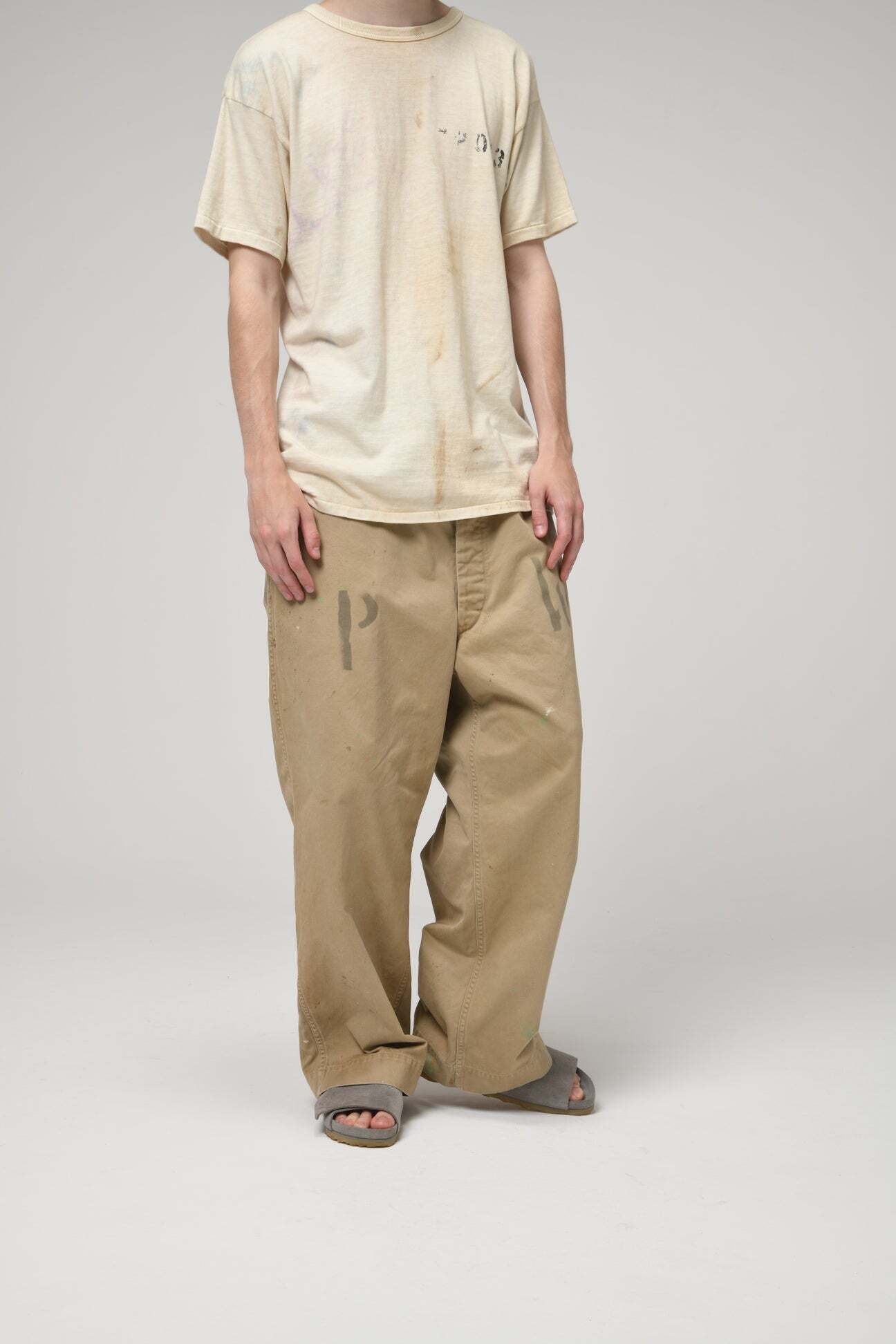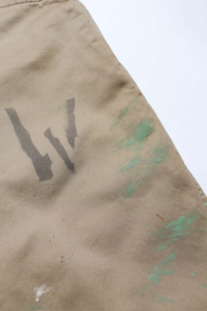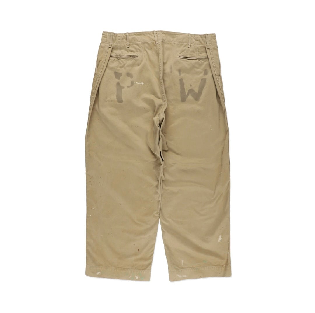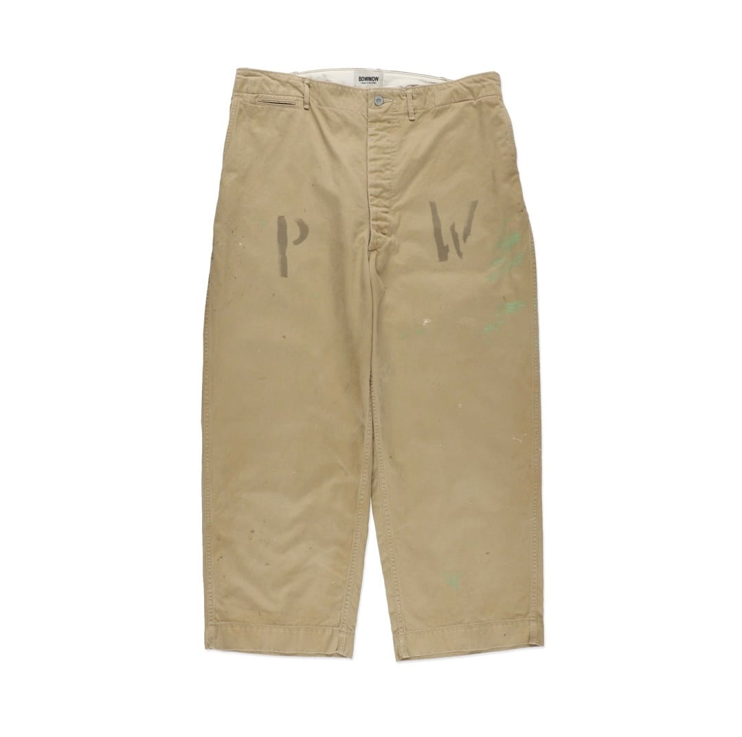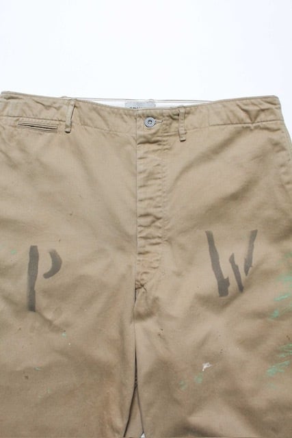 1941年モデルのKHAKI TROUSERSをベースに、当時の仕様やバランスを崩さず、そのままの佇まいを再現している。1930年代から使用されているARMYメタルボタンを採用し、無骨な表情や質感もオリジナルに忠実に踏襲している。 PWの文字を、戦時中に支給品へ直接記されていた識別表示のような感覚で配置し、ヴィンテージで発見された個体をそのまま写し取ったかのようなリアリティを意識。整えすぎず、荒さや歪みを残した表情で、当時の緊張感を伝えている。 XXXL表記のみとし、ビッグサイズのウエストサイドを摘まむことで、実際の個体に見られる着用変化を再現。シルエットの動きや歪みまで含め、当時のままの空気感を残した仕上がりになっている。