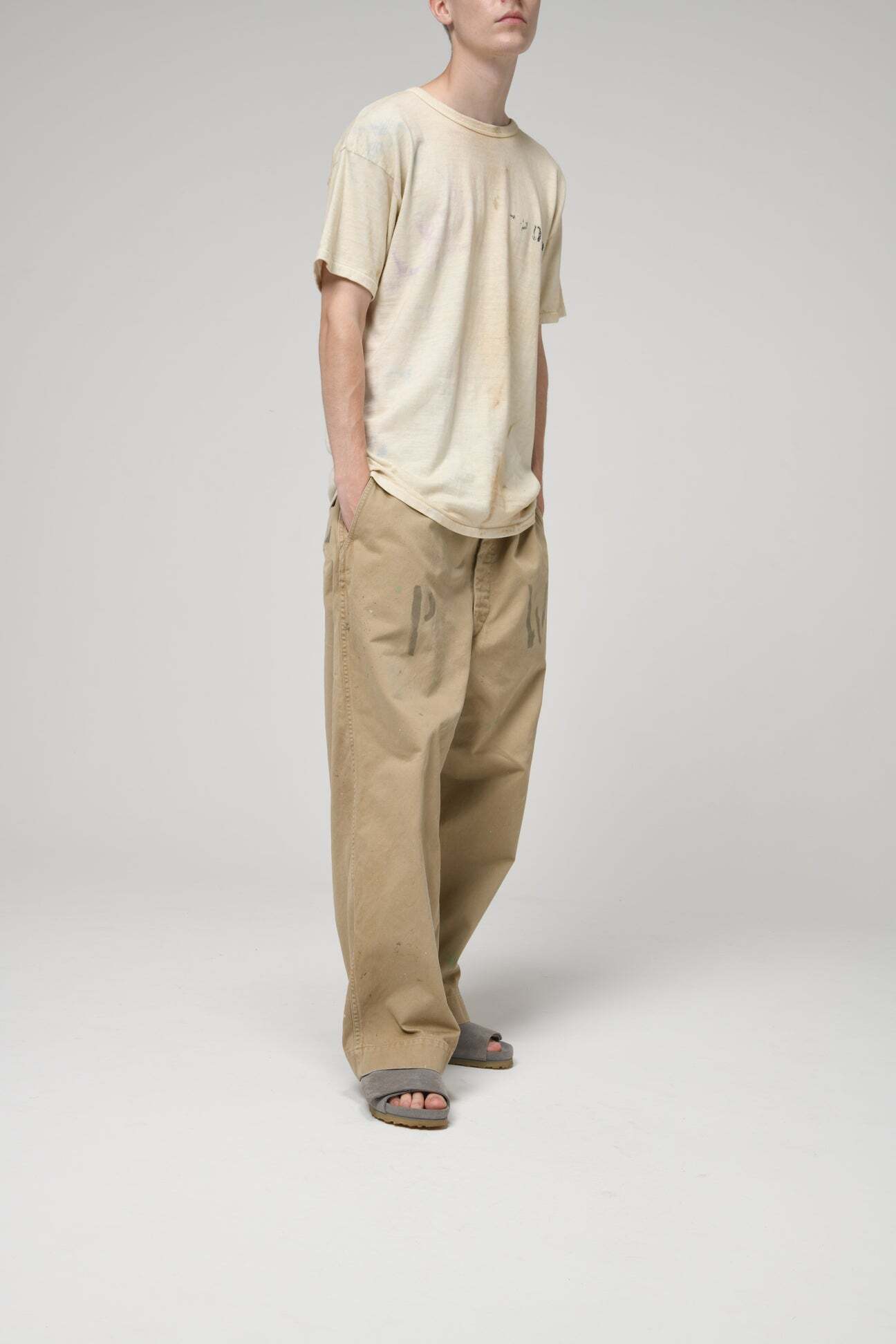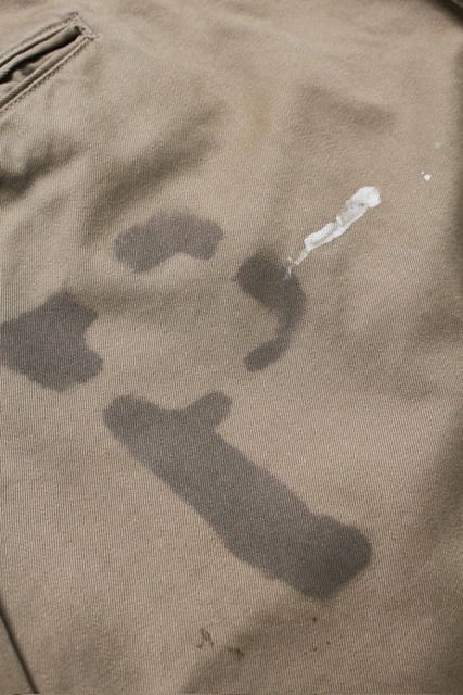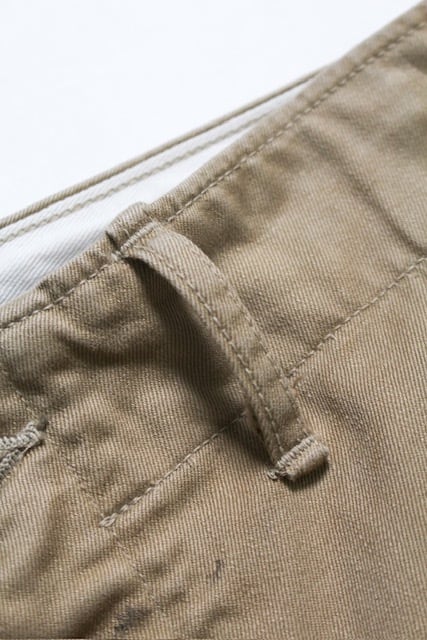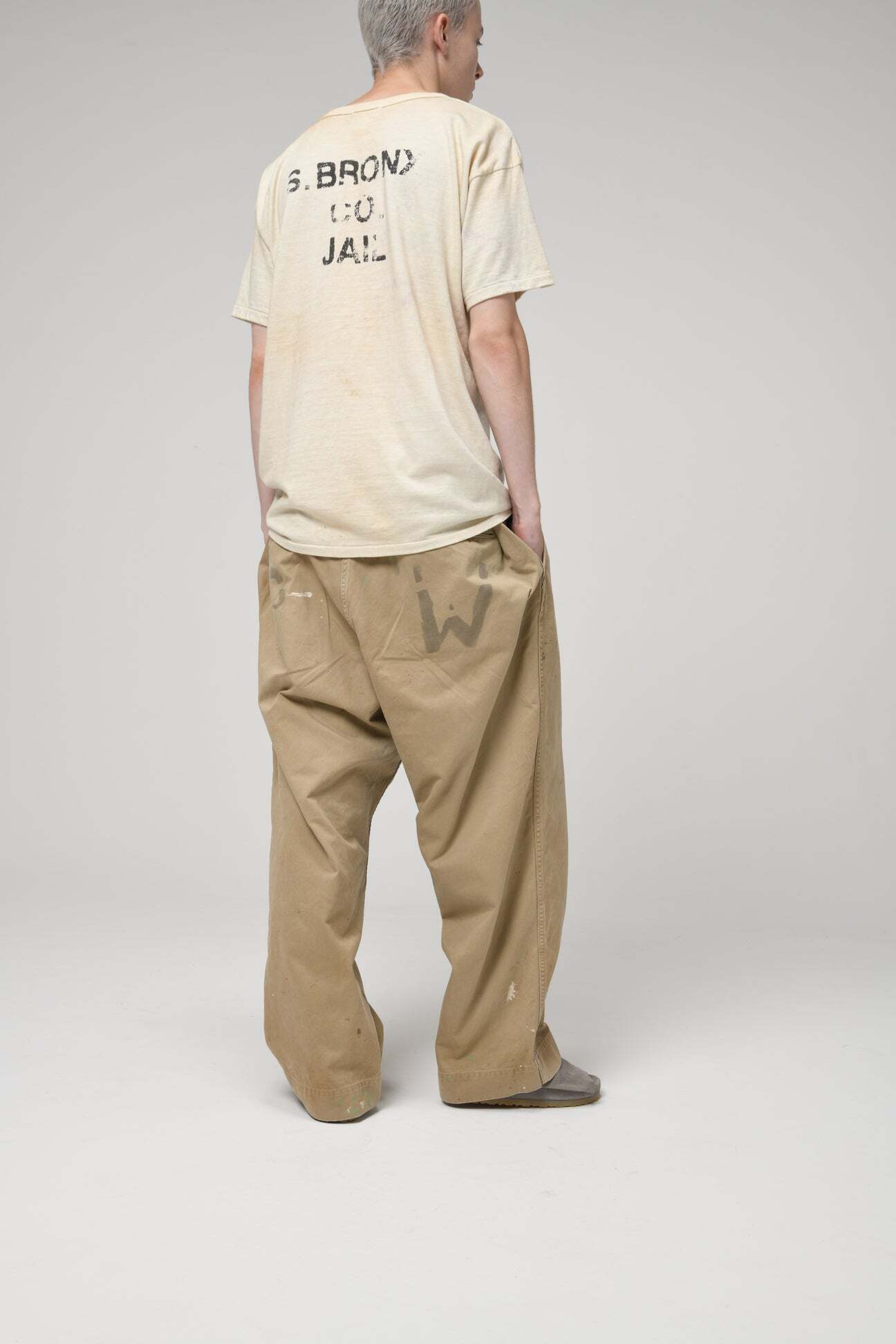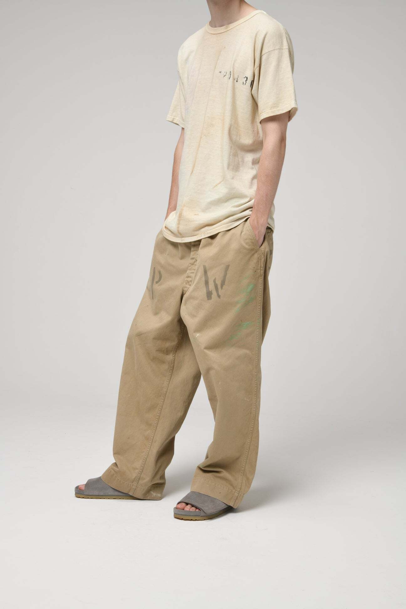 1941年モデルのKHAKI TROUSERSをベースに、当時の仕様やバランスを崩さず、そのままの佇まいを再現している。1930年代から使用されているARMYメタルボタンを採用し、無骨な表情や質感もオリジナルに忠実に踏襲している。 PWの文字を、戦時中に支給品へ直接記されていた識別表示のような感覚で配置し、ヴィンテージで発見された個体をそのまま写し取ったかのようなリアリティを意識。整えすぎず、荒さや歪みを残した表情で、当時の緊張感を伝えている。 XXXL表記のみとし、ビッグサイズのウエストサイドを摘まむことで、実際の個体に見られる着用変化を再現。シルエットの動きや歪みまで含め、当時のままの空気感を残した仕上がりになっている。
