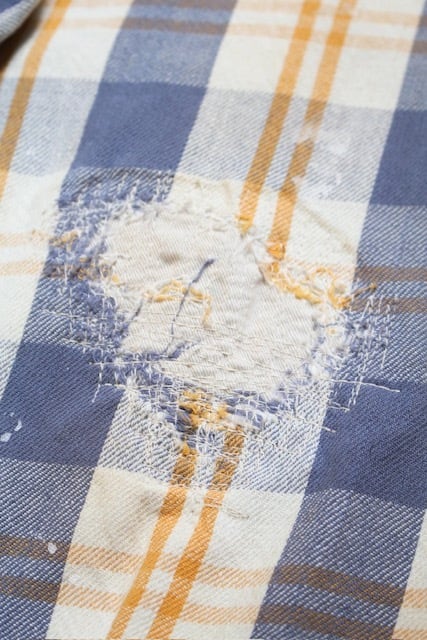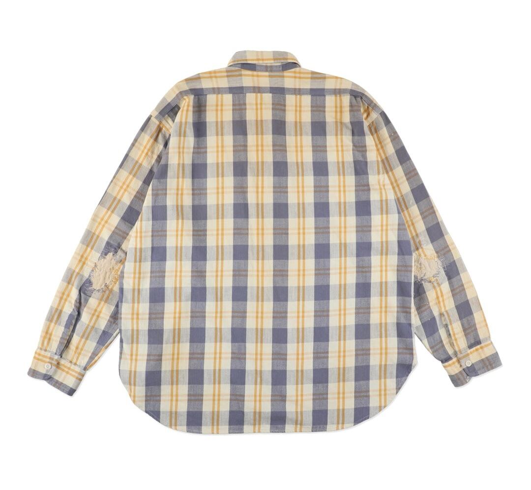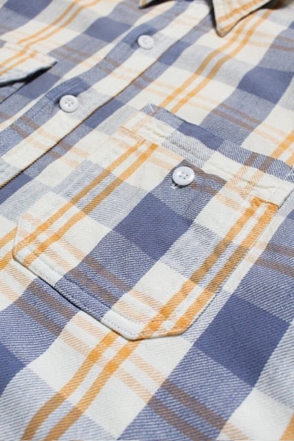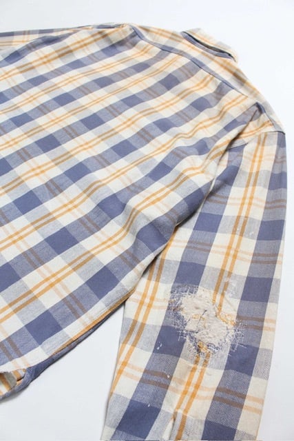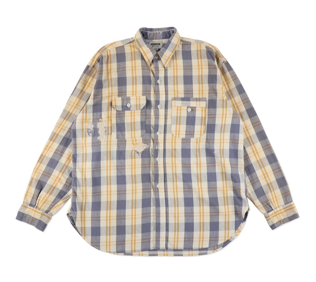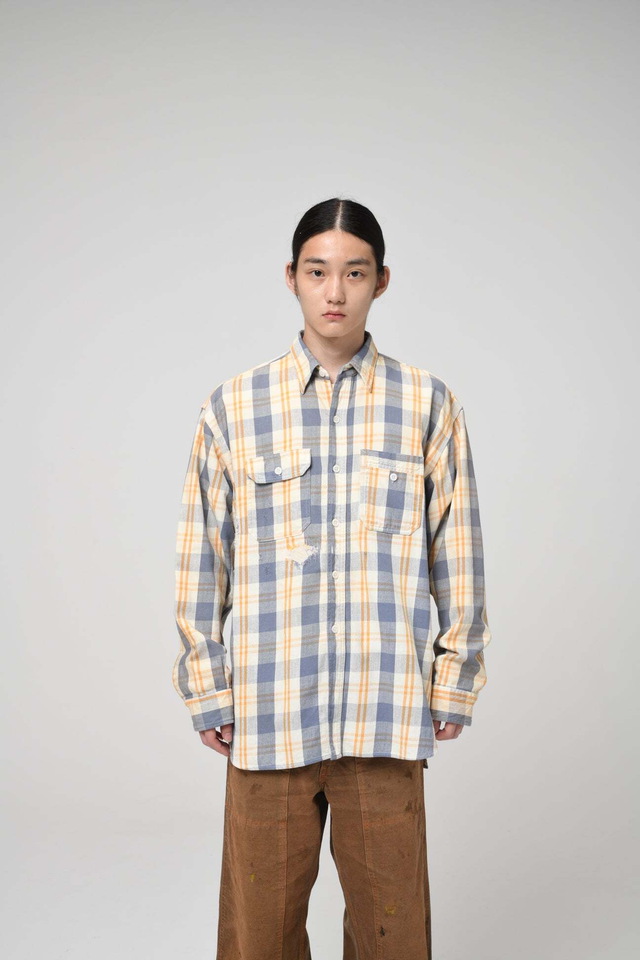ヴィンテージを彷彿とさせるチェックネル生地を使用し、古い時代のワークシャツの空気感をそのまま落とし込んだ一着。起毛感や色の出方まで含め、当時の表情を意識して仕上げている。 最大の特徴は、40年代のワークシャツに見られるユニークな紙たばこ用ポケット。実用性から生まれたこのディティールが、時代背景と労働の匂いを色濃く感じさせるポイントになっている。 作業による汚れや擦れをリアルに表現し、破れた箇所をリペアしながら着続けてきた様子まで加工で再現。現場で使い込まれてきたリアルな佇まいを残した仕上がりになっている。