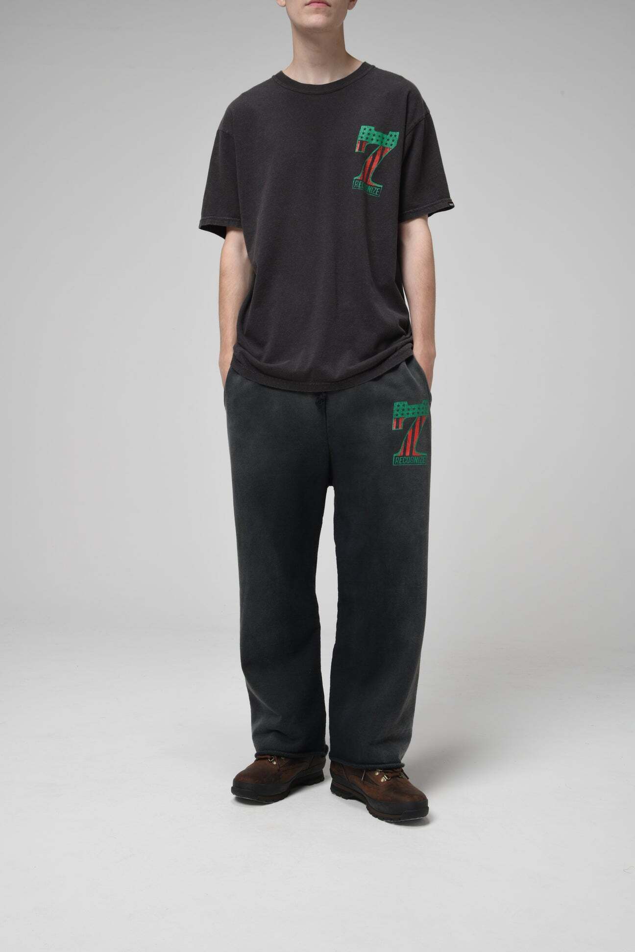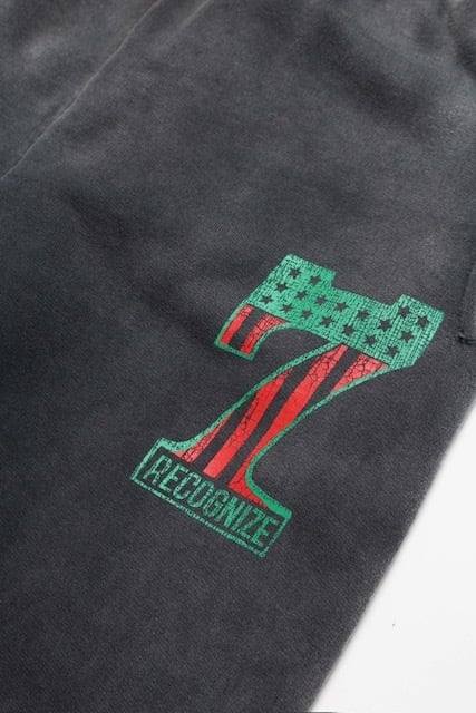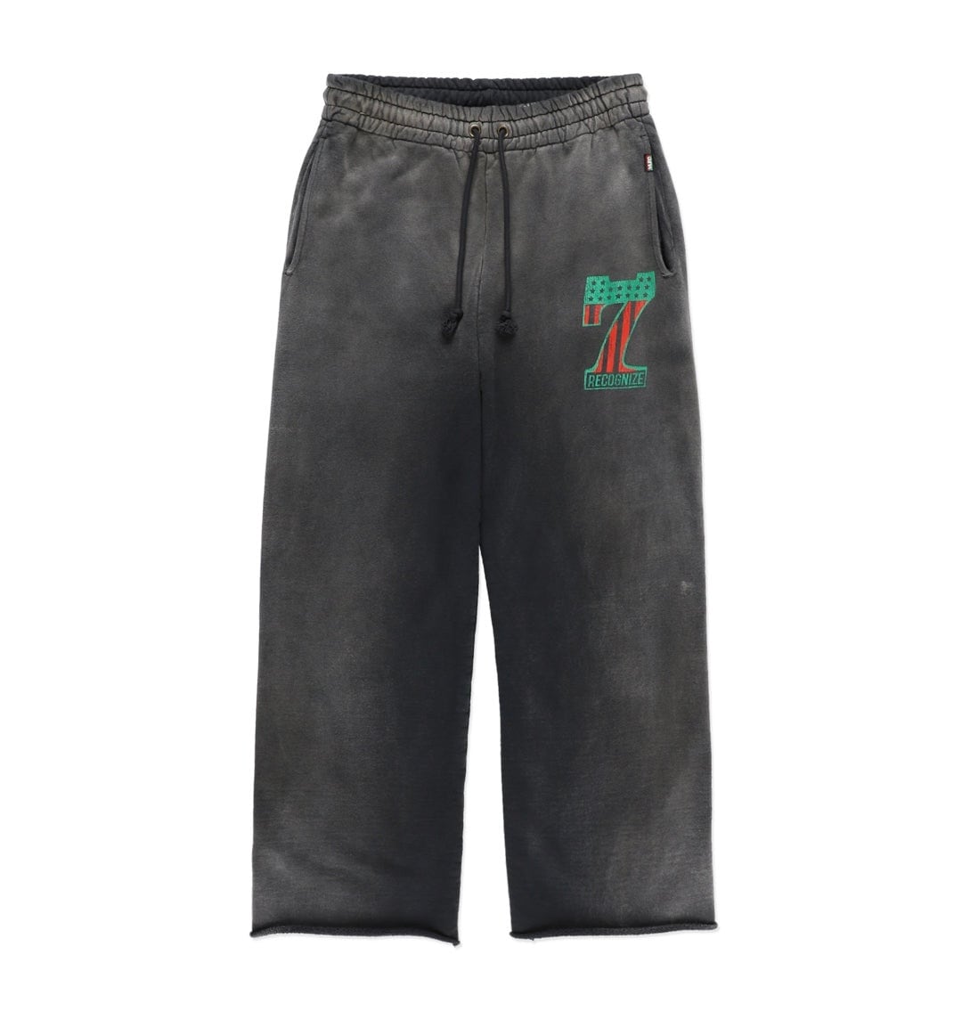 DJ MUROプロデュースのRECOGNIZEとのコラボレーションアイテム。No.1ロゴを7インチレコードを意味する「7」と、MUROのイメージカラーであるアフリカンアメリカンフラッグ配色で構成している。 SAVAGE時代のショップウェアをイメージした世界観を落とし込み、リアルな時代感を表現。 起毛無しの厚地裏毛を使用したスウェットパンツに、BOW WOWが得意とするリアルなヴィンテージ加工を重ね、長年穿き込まれてきたような表情に仕上げている。股上を深く取ったスラックスライクなシルエットと、切りっ放しの裾が古いスウェットの空気感を残している。