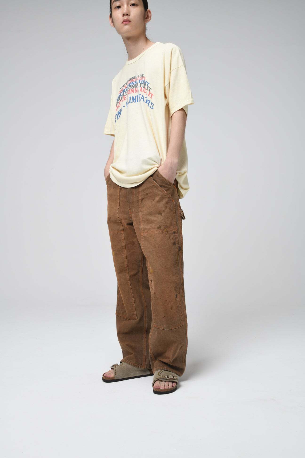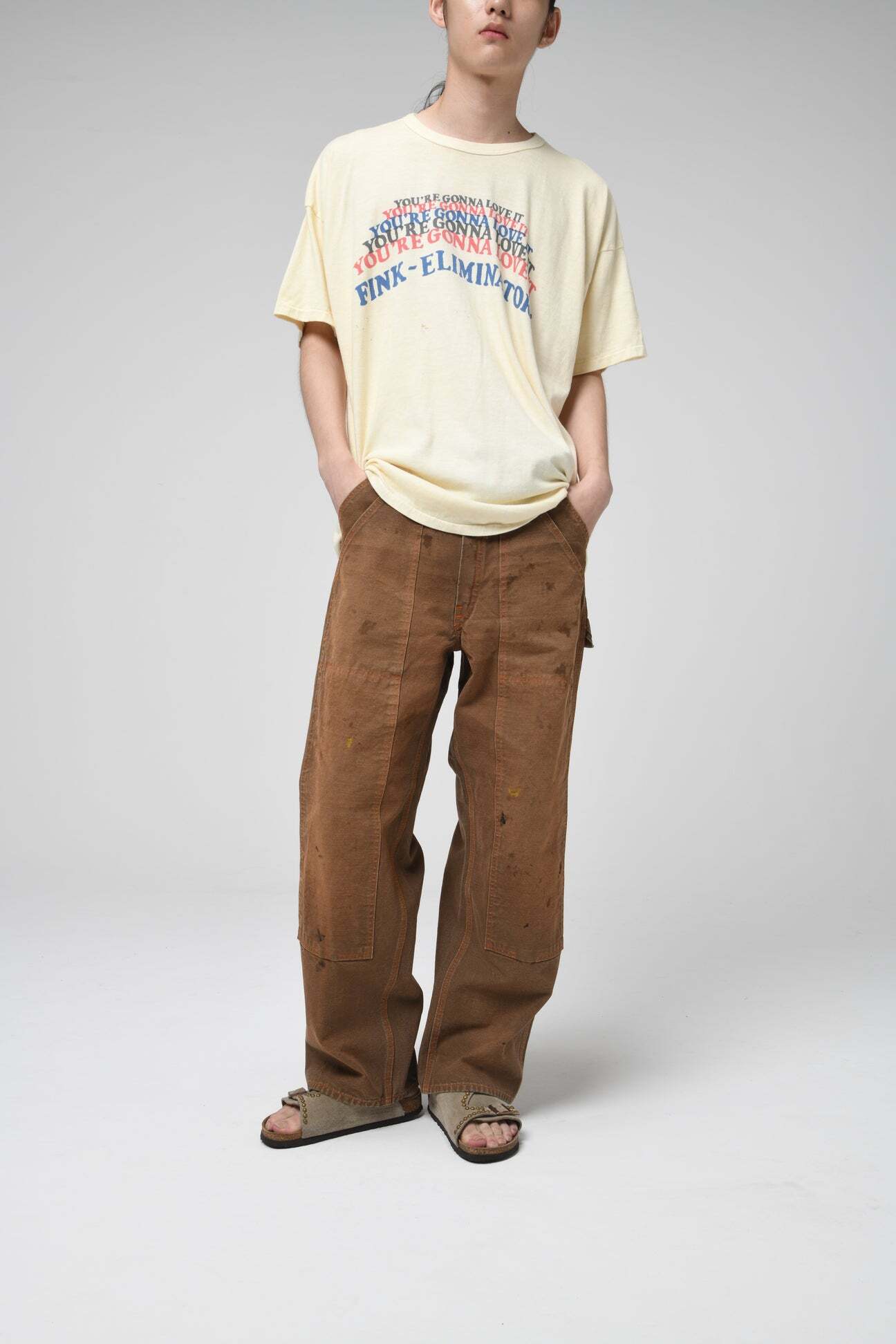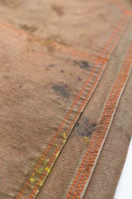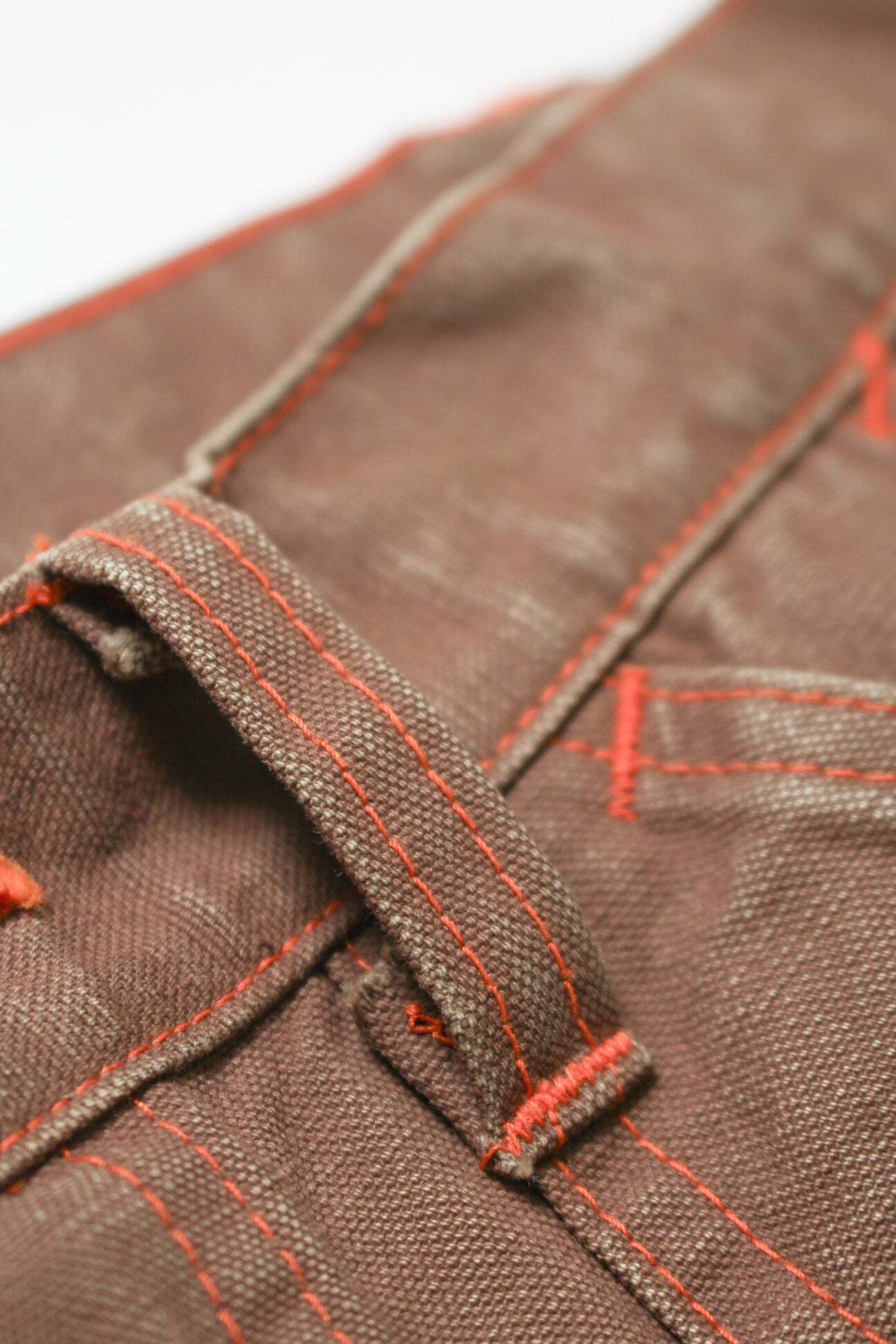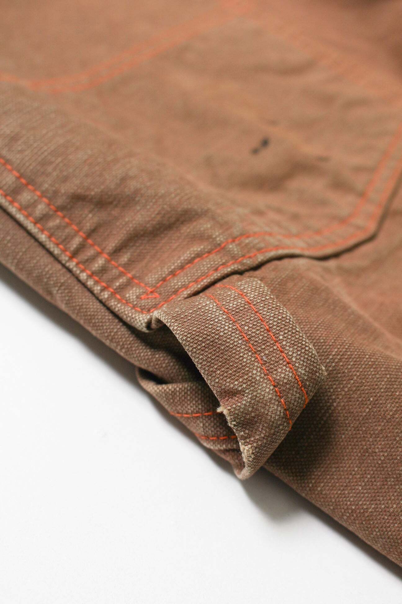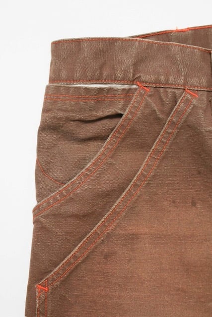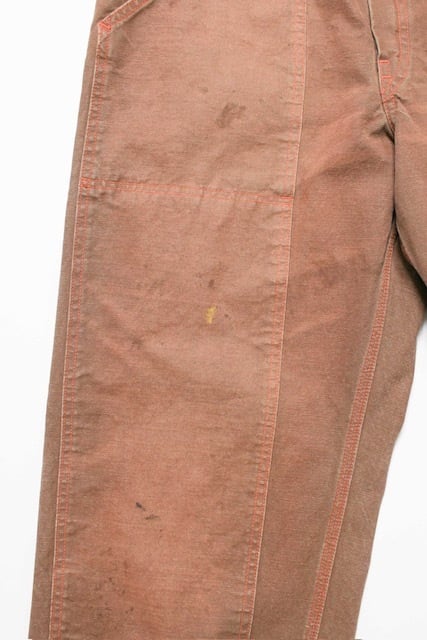 ブラウンダックのワークパンツを、40年代初頭に見られるフロントポケットまで一体で補強されたダブルニー仕様を背景に製作。前身頃全体を覆うような構造が特徴で、重労働向けならではの無骨な設計をそのまま踏襲している。 極厚ダック生地を使用し、擦れや汚れ、退色の重なりまで踏み込んだリアルな加工表現をプラス。現場で使い倒されてきたかのような重量感と迫力を備えた佇まいに仕上げている。