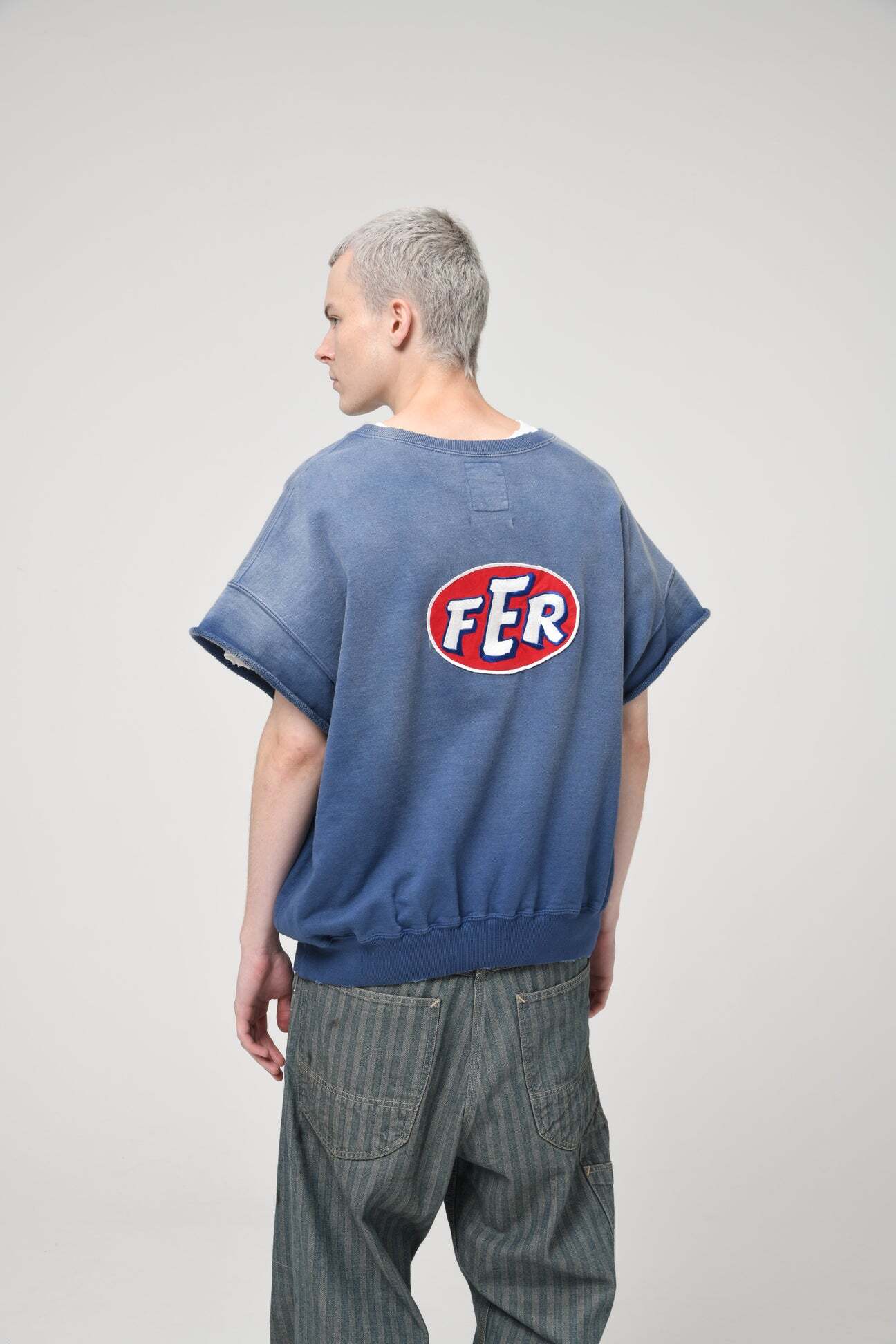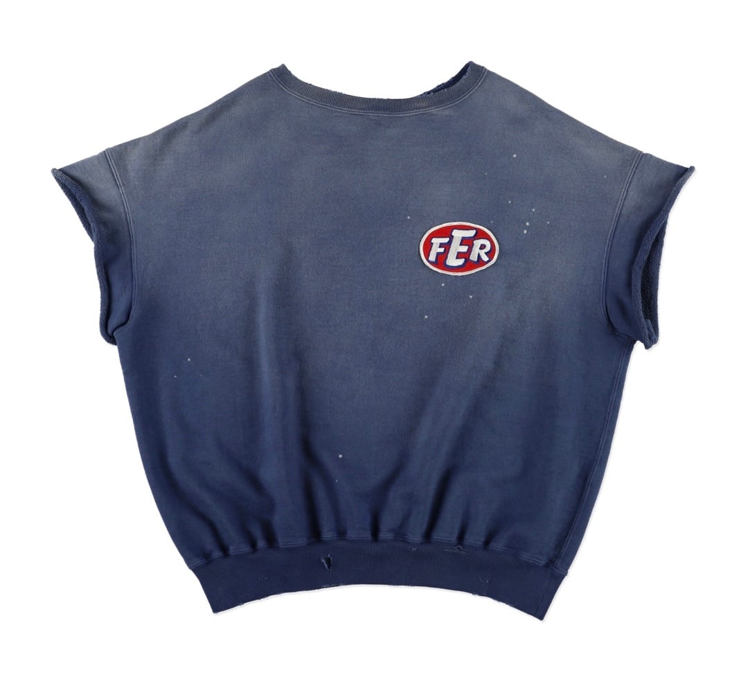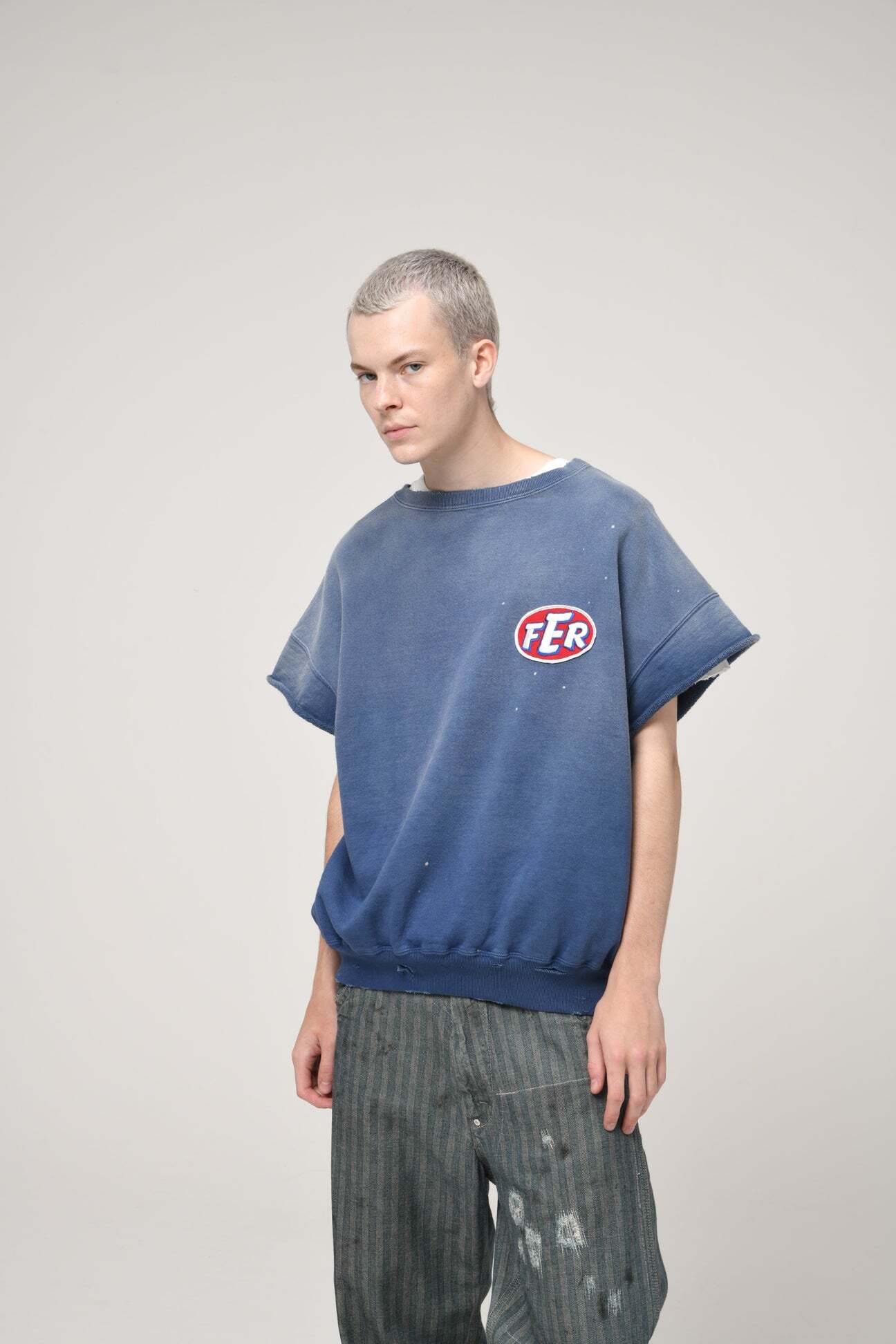 モーター関連メーカーをイメージしたロゴパッチを配し、工業的で力強いムードを加えた半袖スウェット。ガレージユニフォームのような佇まいを意識し、無骨で実用的な空気感を前面に出している。 1950〜60年代にクルースウェットの袖をカットオフして着用されていた個体を背景に、そのラフな改変を一つのスタイルとして捉えたデザイン。現場で生まれたリアルなバランスをそのまま落とし込んでいる。 起毛無しの厚地裏毛を使用し、古い時代の質感と実用性をそのまま残し、リアルな加工表現もデザインとしている。