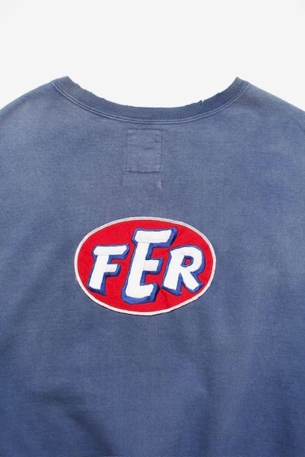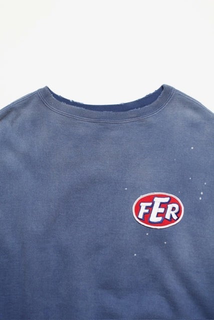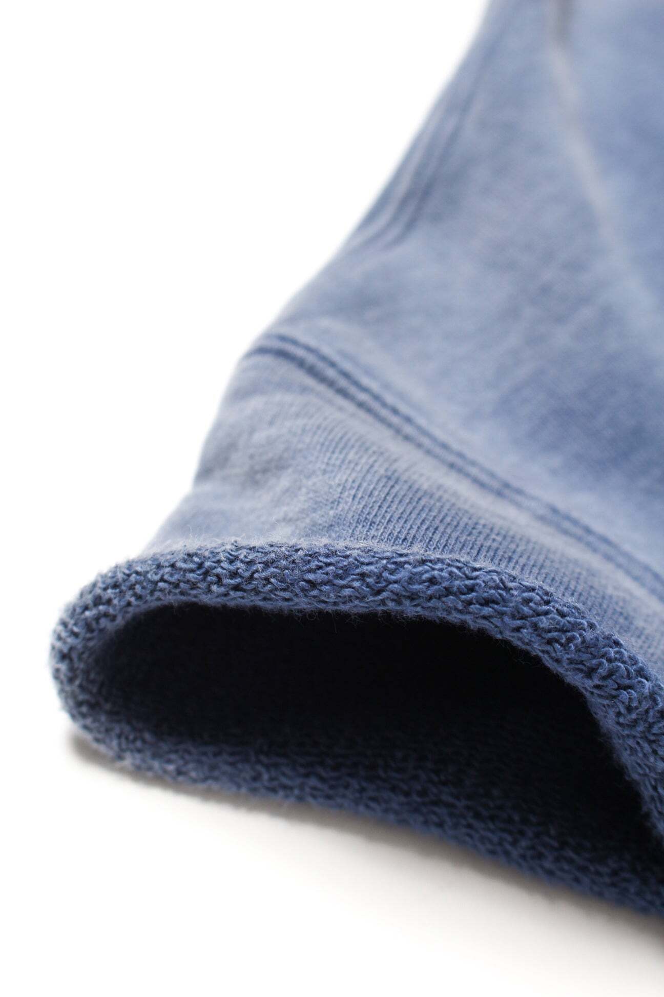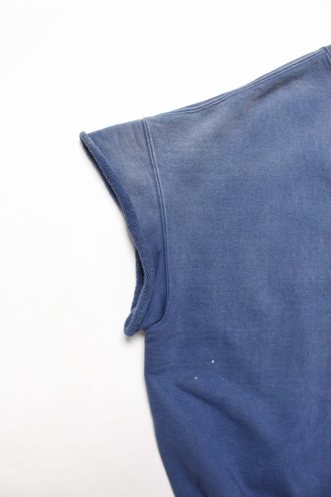 モーター関連メーカーをイメージしたロゴパッチを配し、工業的で力強いムードを加えた半袖スウェット。ガレージユニフォームのような佇まいを意識し、無骨で実用的な空気感を前面に出している。 1950〜60年代にクルースウェットの袖をカットオフして着用されていた個体を背景に、そのラフな改変を一つのスタイルとして捉えたデザイン。現場で生まれたリアルなバランスをそのまま落とし込んでいる。 起毛無しの厚地裏毛を使用し、古い時代の質感と実用性をそのまま残し、リアルな加工表現もデザインとしている。
