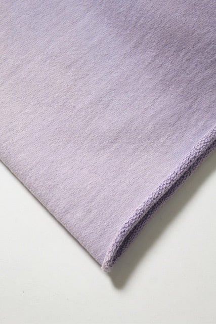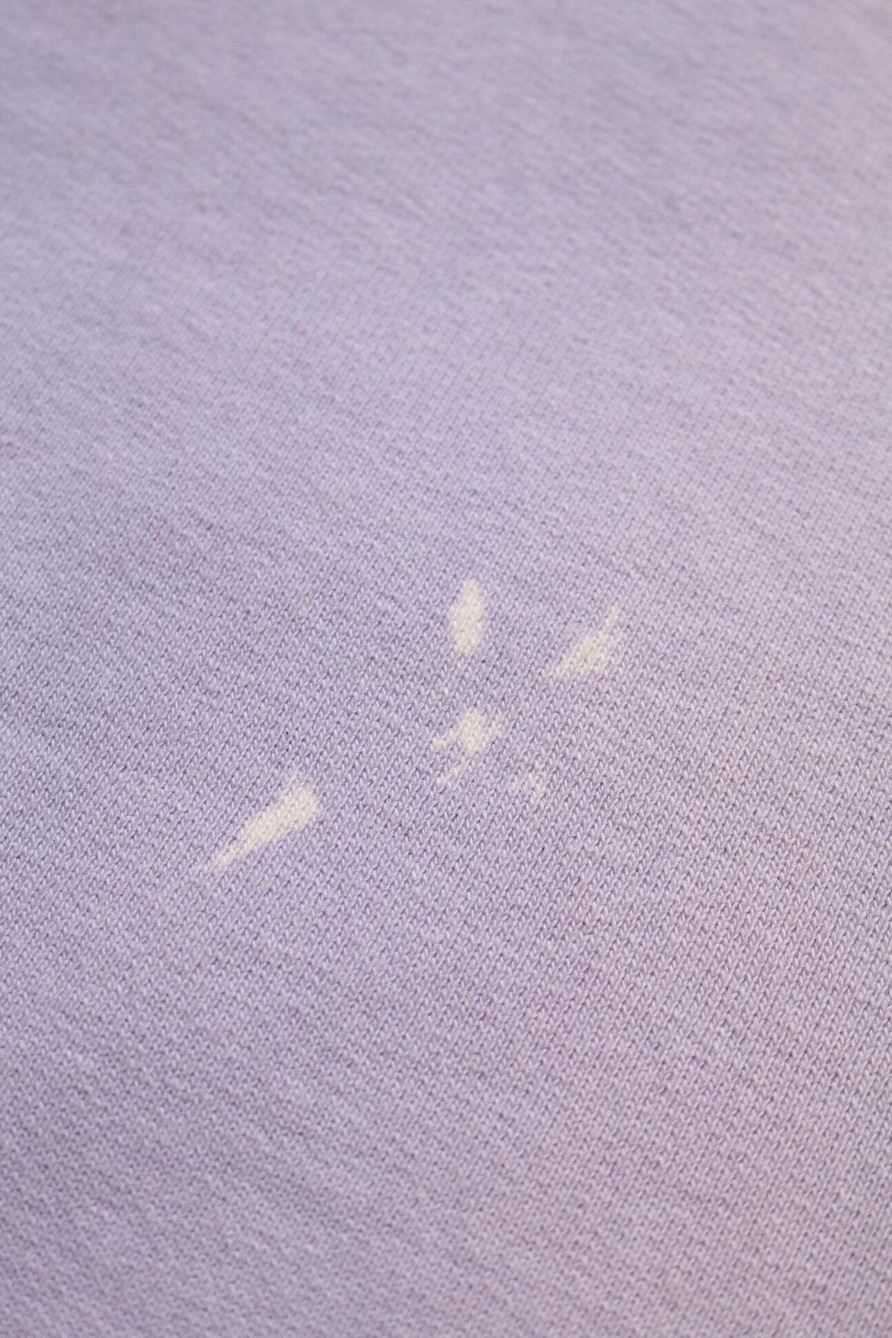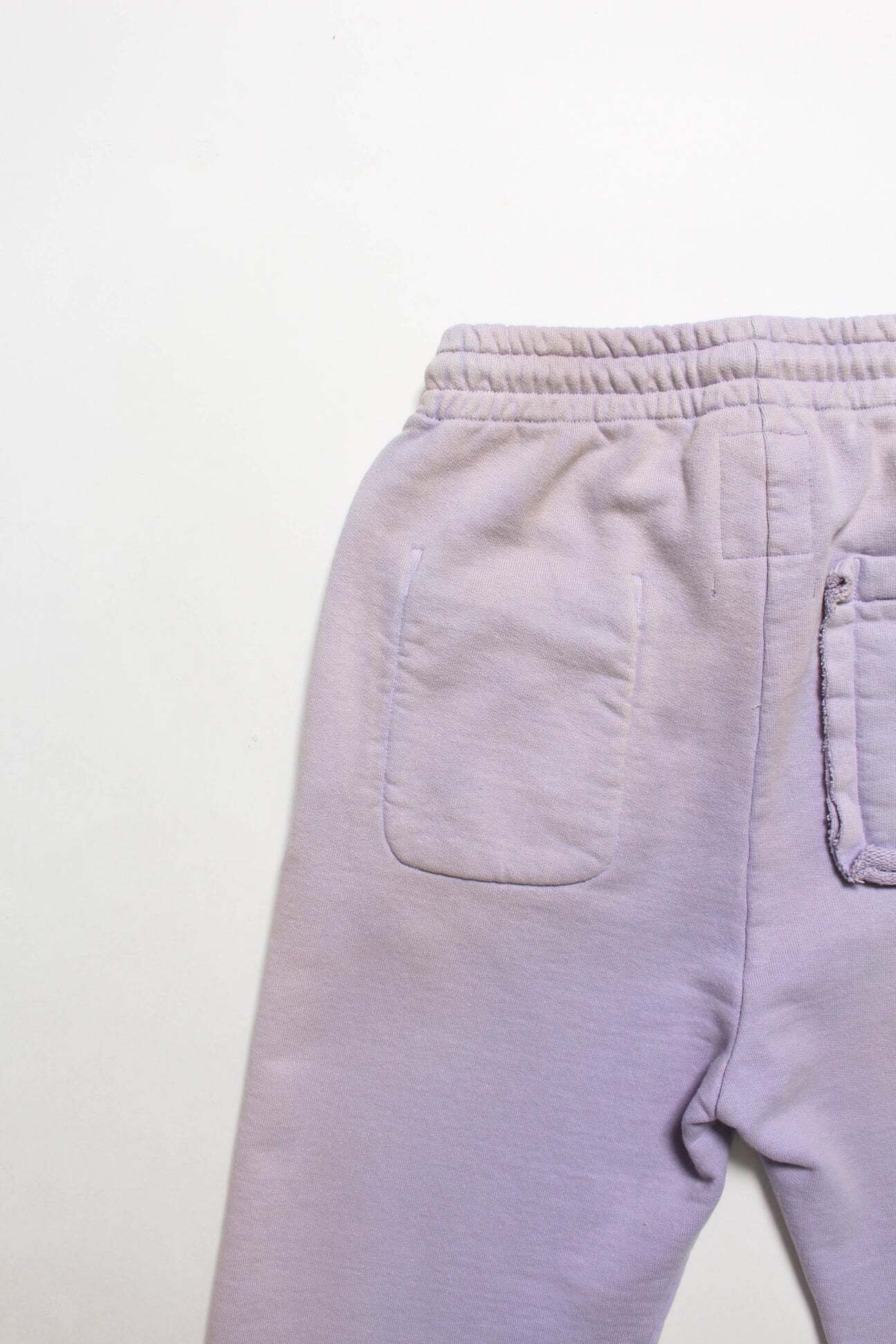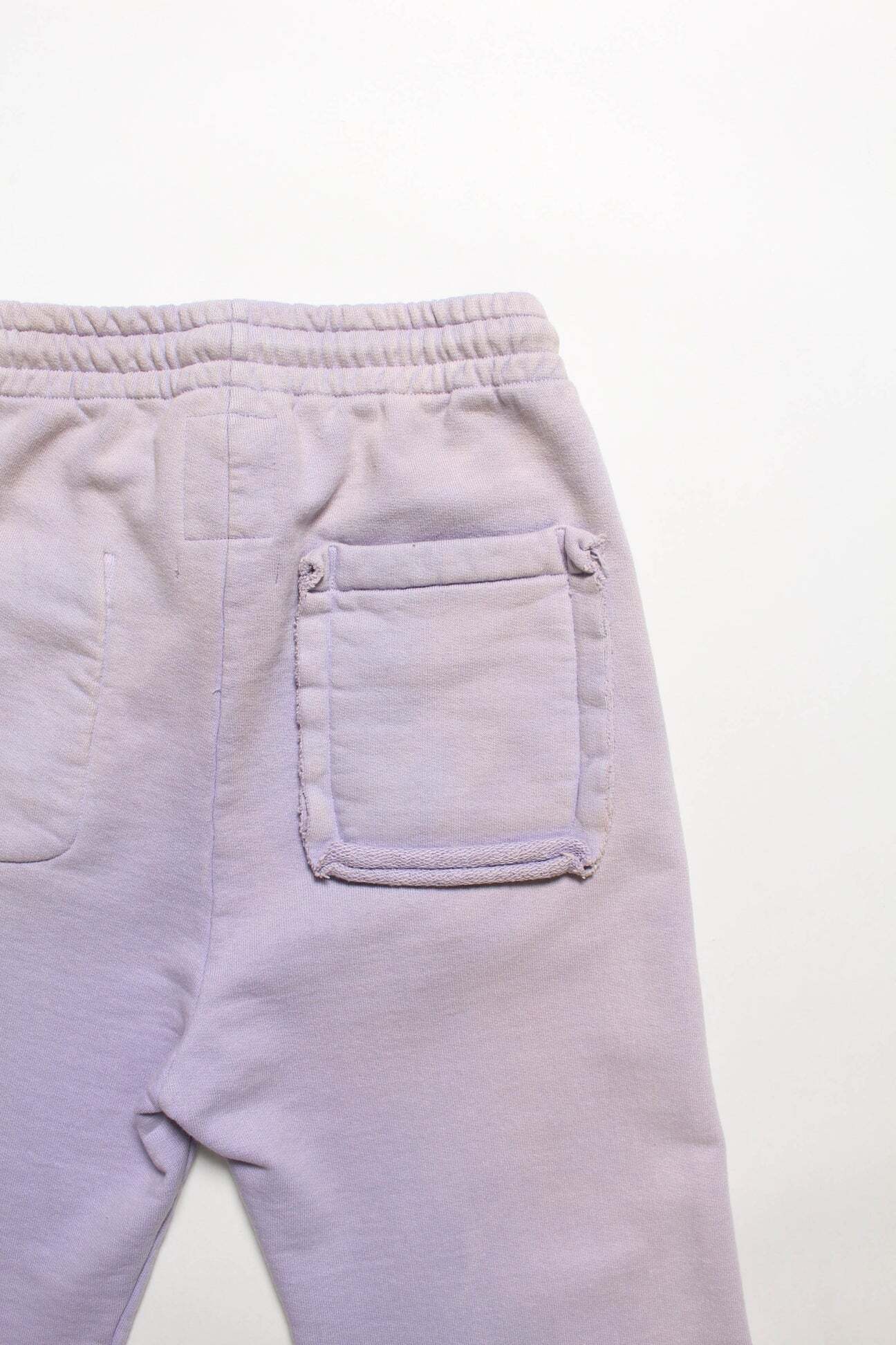 1990年代スウェットの中でも評価の高いラベンダーカラーを再現し、リアルな経年変化表現を重ねたスウェットパンツ。着用と洗いを繰り返してきたかのようなフェードや色ムラまで丁寧に作り込み、時間の積なりを感じさせる佇まいに仕上げている。 起毛無しのオールシーズン対応厚地裏毛を使用し、特別な編み機が生み出すヴィンテージの質感を活かした仕上がり。ラフさの中に芯のある表情を残している。 股上を深く取り、スラックスのようなラインを意識したシルエットで設計。裾は切りっ放し仕様とし、未完成感と荒さをあえて残すことで、古いスウェット特有の空気感と違和感を表現している。