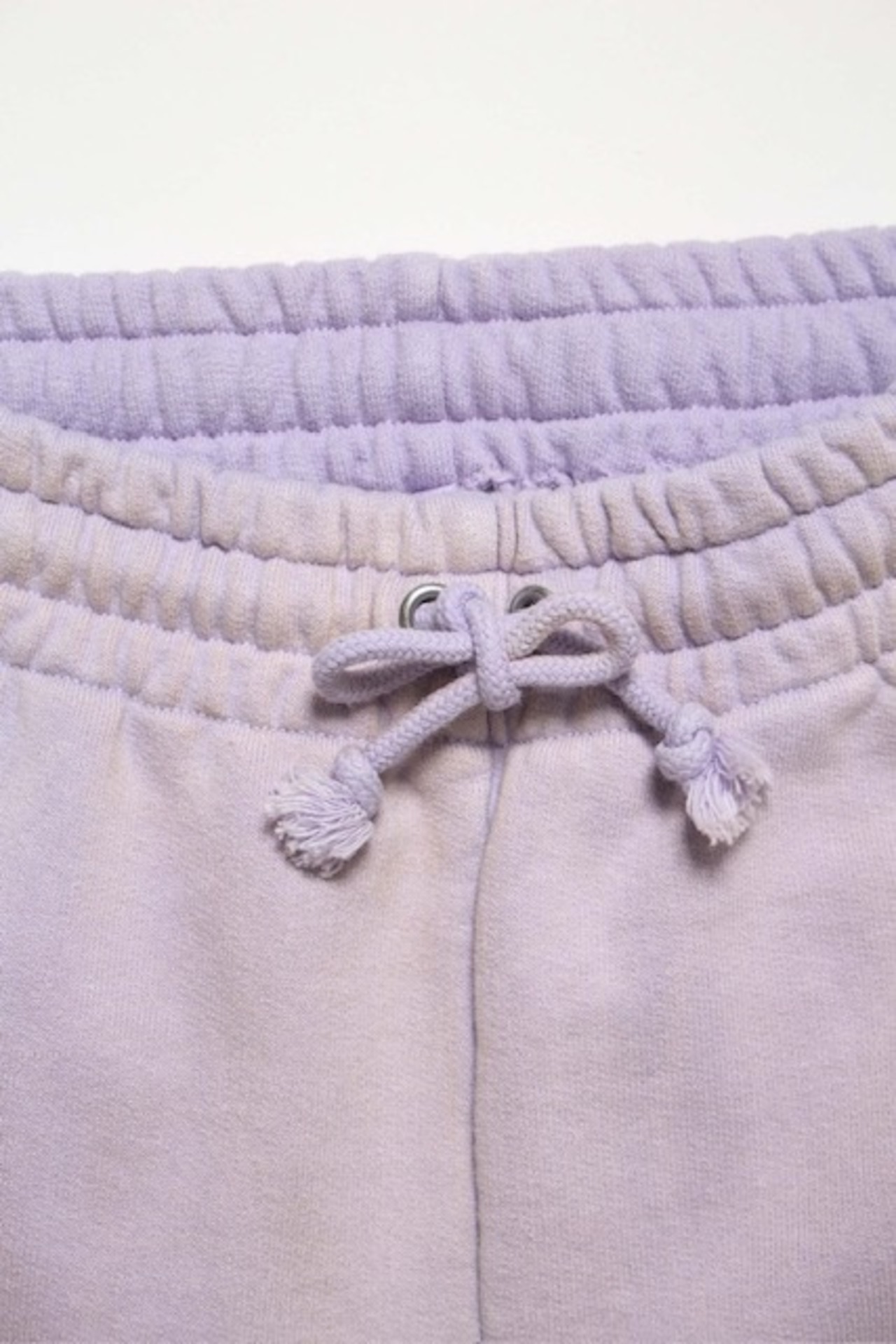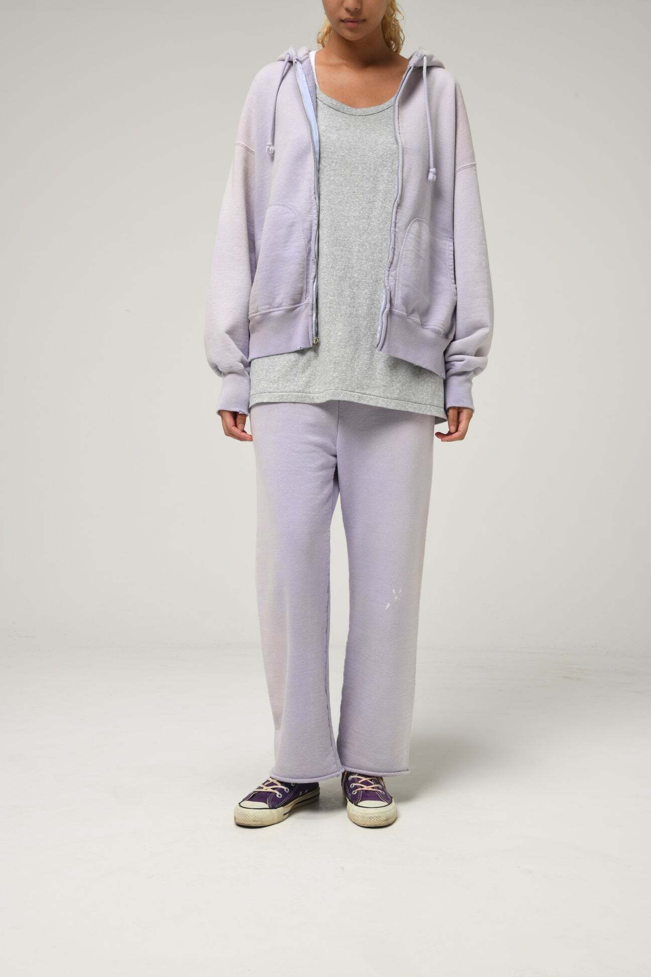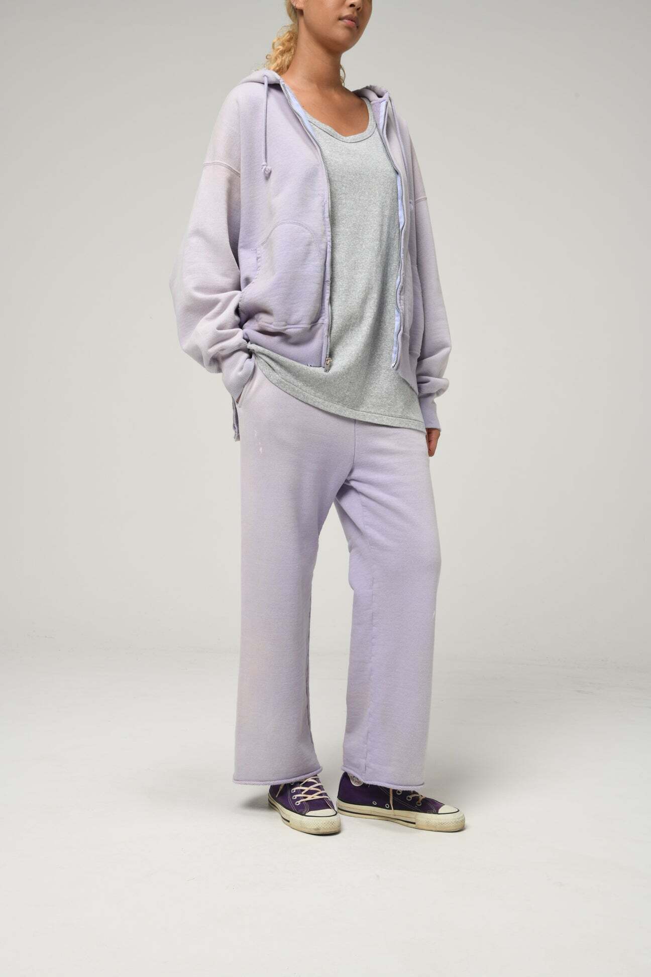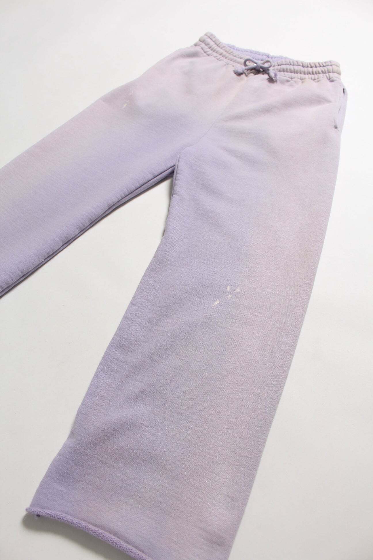 1990年代スウェットの中でも評価の高いラベンダーカラーを再現し、リアルな経年変化表現を重ねたスウェットパンツ。着用と洗いを繰り返してきたかのようなフェードや色ムラまで丁寧に作り込み、時間の積なりを感じさせる佇まいに仕上げている。 起毛無しのオールシーズン対応厚地裏毛を使用し、特別な編み機が生み出すヴィンテージの質感を活かした仕上がり。ラフさの中に芯のある表情を残している。 股上を深く取り、スラックスのようなラインを意識したシルエットで設計。裾は切りっ放し仕様とし、未完成感と荒さをあえて残すことで、古いスウェット特有の空気感と違和感を表現している。