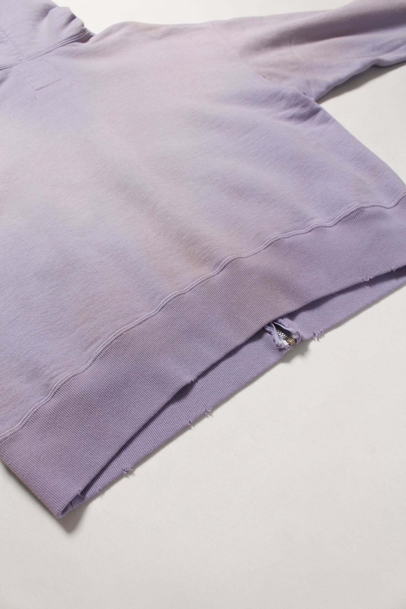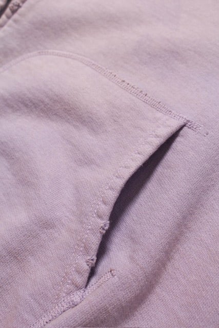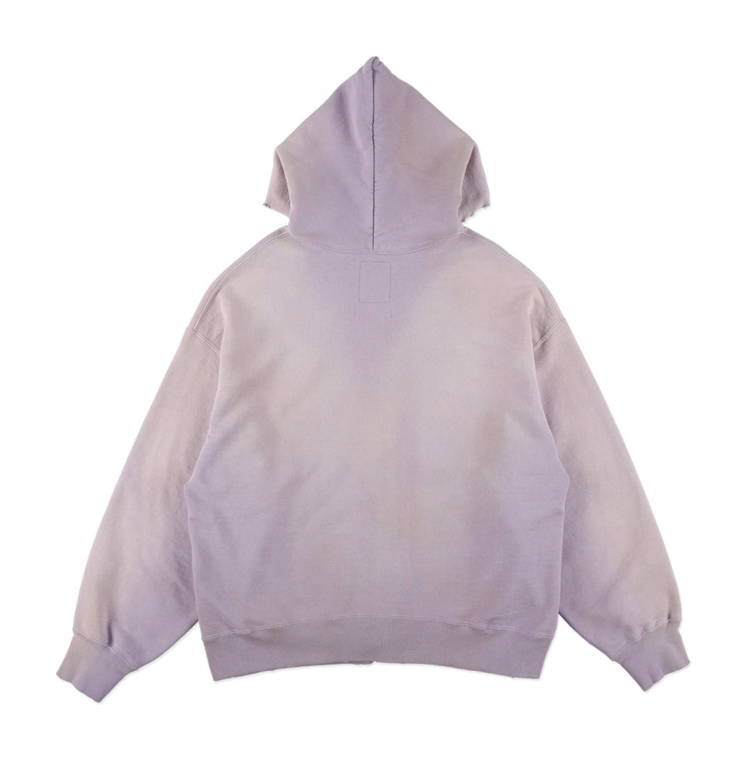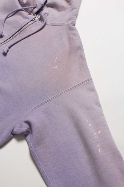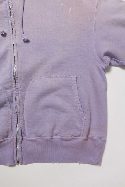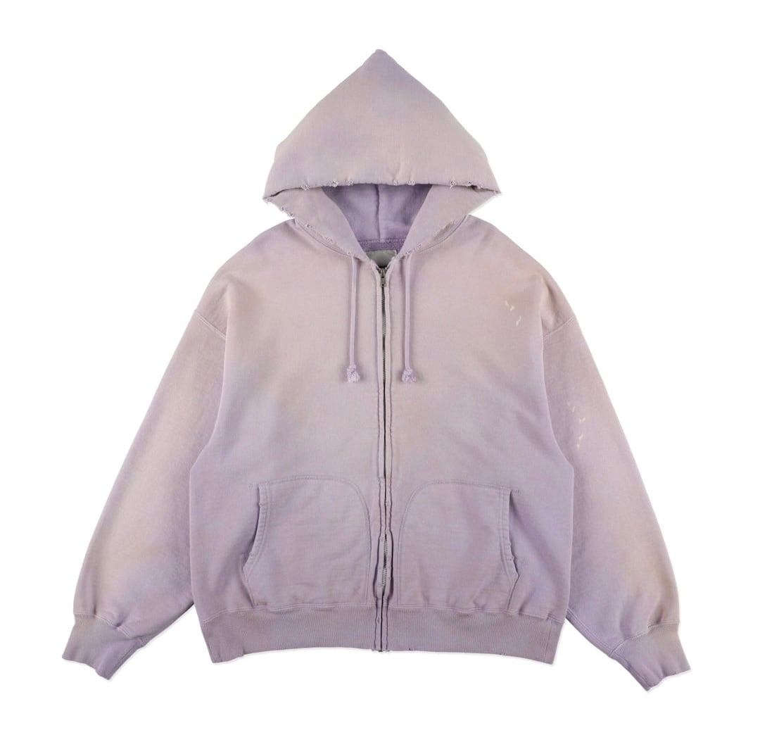 1990年代スウェットの中でも評価の高いラベンダーカラーを再現し、ブランドの真骨頂であるリアルな経年変化表現を重ねた一着。着用と洗いを繰り返してきたかのようなフェードや色ムラまで丁寧に作り込み、時間の積なりを感じさせる佇まいに仕上げている。 1950年代に見られるセパレートポケット仕様のジップパーカーを背景に、当時の構造とバランスを踏まえた設計。ビンテージらしいシルエットと縫製の表情を活かしている。 起毛無しの厚地裏毛を使用し、特別な編み機によるヴィンテージの質感を残した仕上がり。ラフさの中に芯のある表情を持たせている。