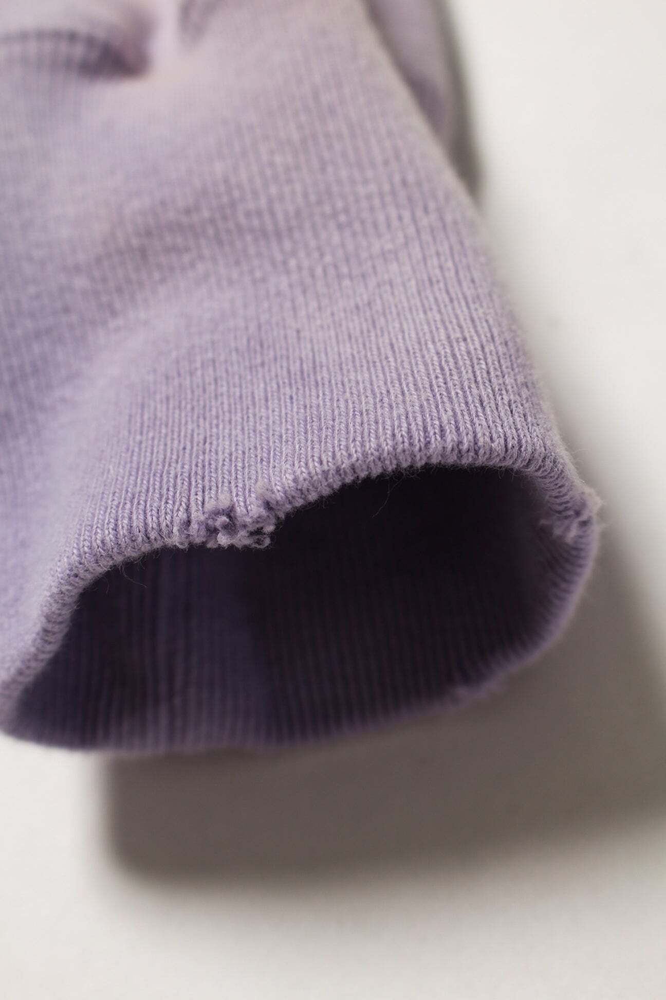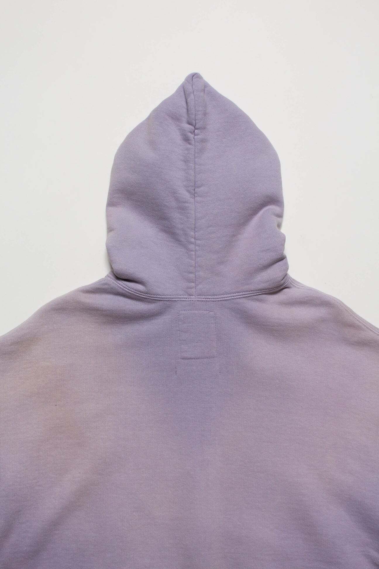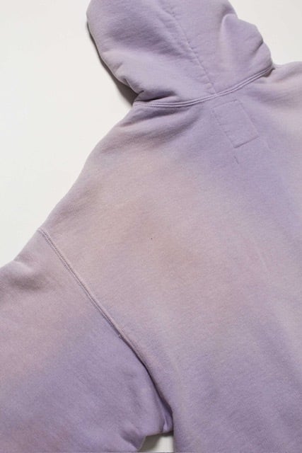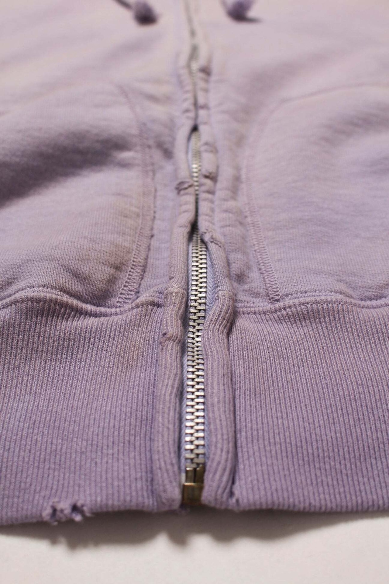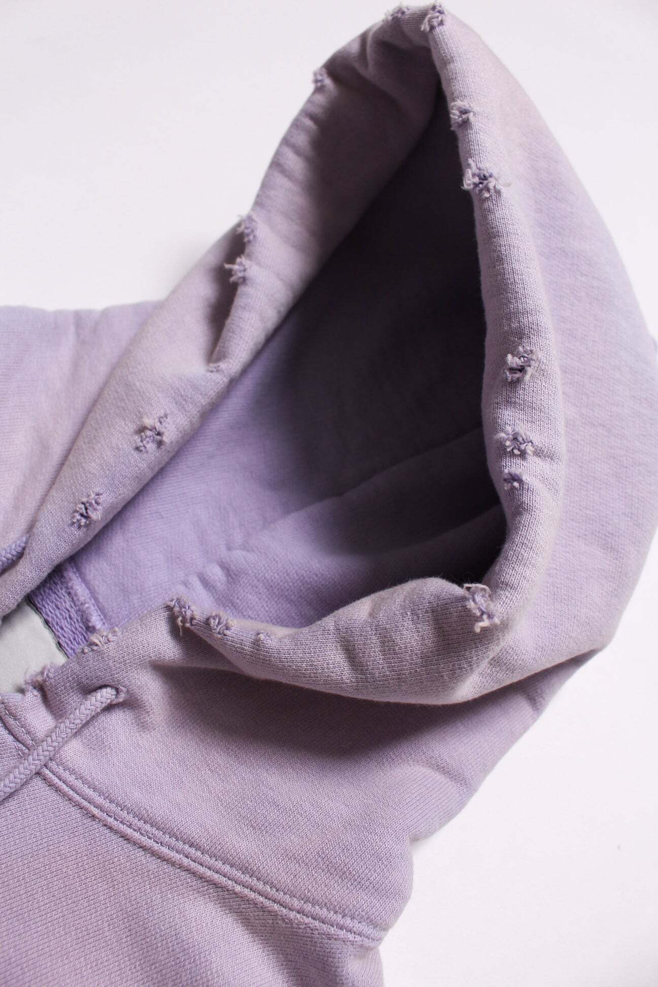 1990年代スウェットの中でも評価の高いラベンダーカラーを再現し、ブランドの真骨頂であるリアルな経年変化表現を重ねた一着。着用と洗いを繰り返してきたかのようなフェードや色ムラまで丁寧に作り込み、時間の積なりを感じさせる佇まいに仕上げている。 1950年代に見られるセパレートポケット仕様のジップパーカーを背景に、当時の構造とバランスを踏まえた設計。ビンテージらしいシルエットと縫製の表情を活かしている。 起毛無しの厚地裏毛を使用し、特別な編み機によるヴィンテージの質感を残した仕上がり。ラフさの中に芯のある表情を持たせている。