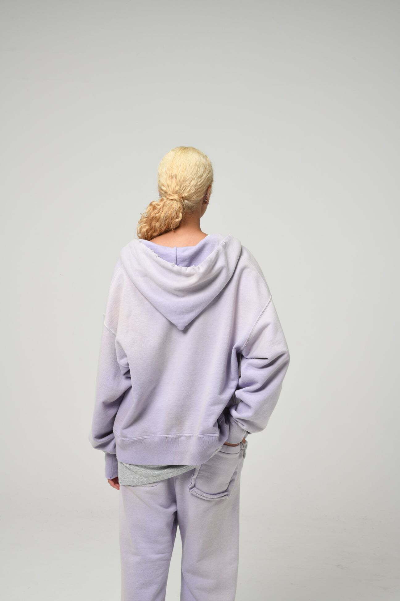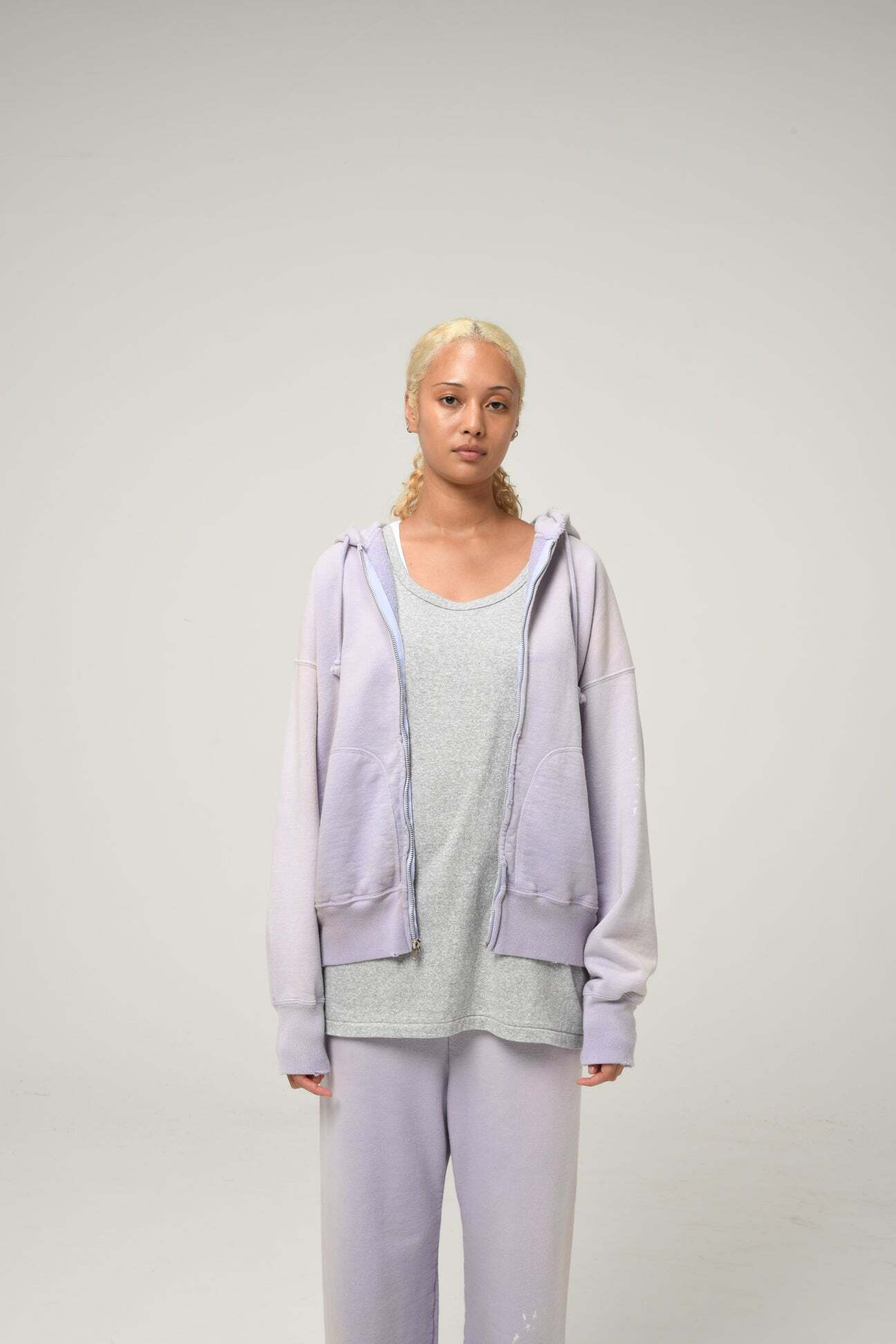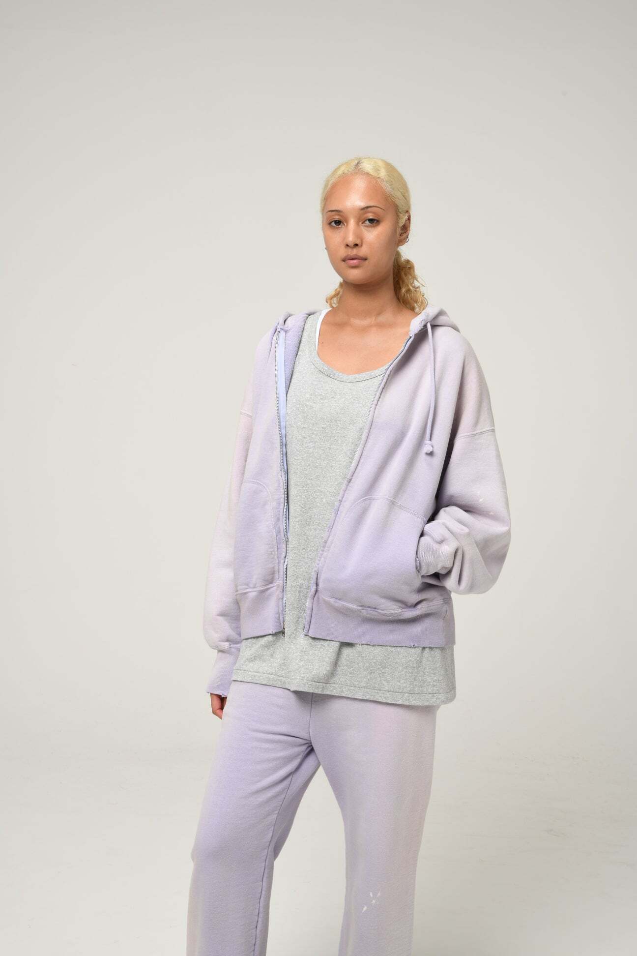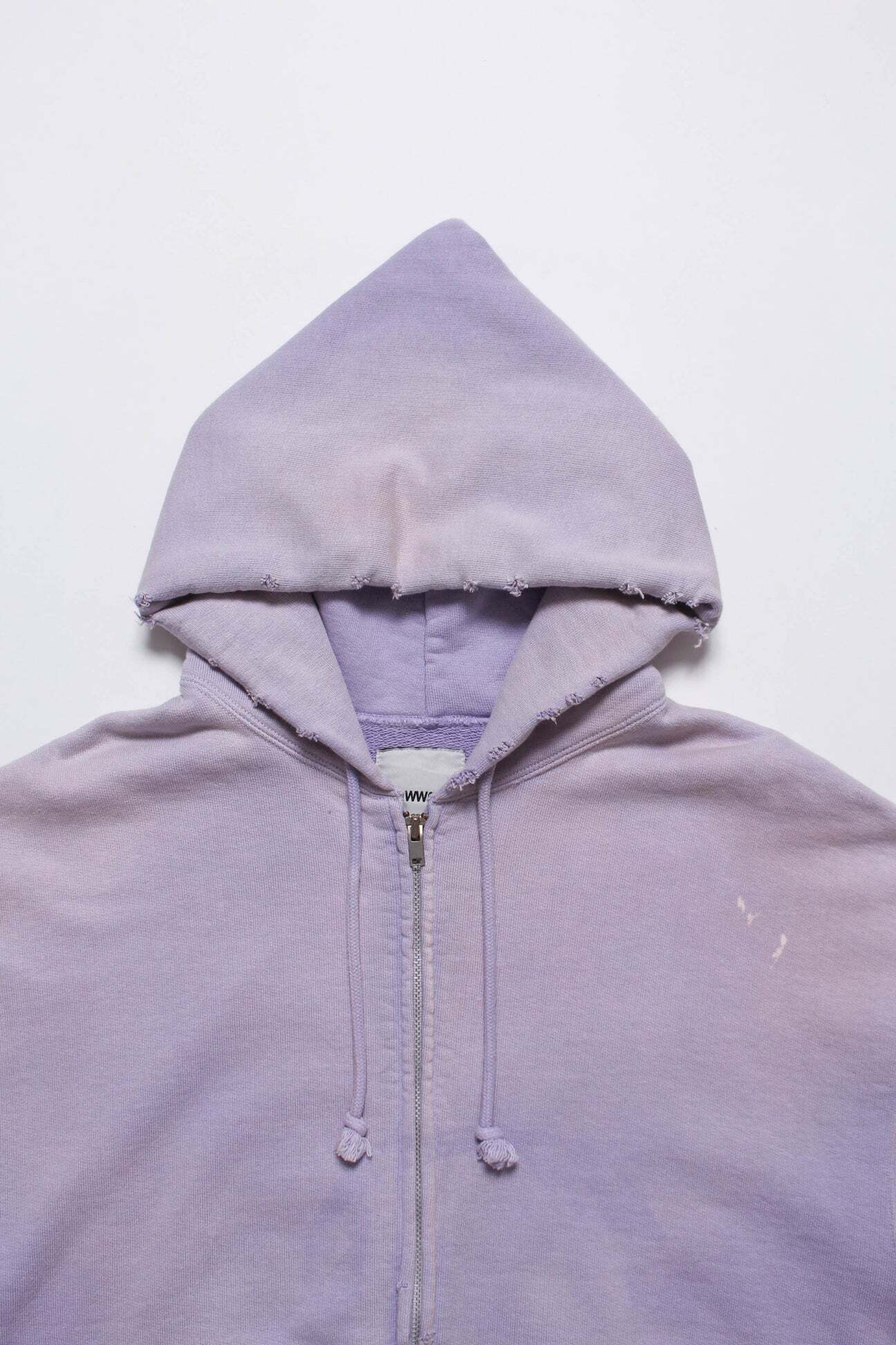 1990年代スウェットの中でも評価の高いラベンダーカラーを再現し、ブランドの真骨頂であるリアルな経年変化表現を重ねた一着。着用と洗いを繰り返してきたかのようなフェードや色ムラまで丁寧に作り込み、時間の積なりを感じさせる佇まいに仕上げている。 1950年代に見られるセパレートポケット仕様のジップパーカーを背景に、当時の構造とバランスを踏まえた設計。ビンテージらしいシルエットと縫製の表情を活かしている。 起毛無しの厚地裏毛を使用し、特別な編み機によるヴィンテージの質感を残した仕上がり。ラフさの中に芯のある表情を持たせている。