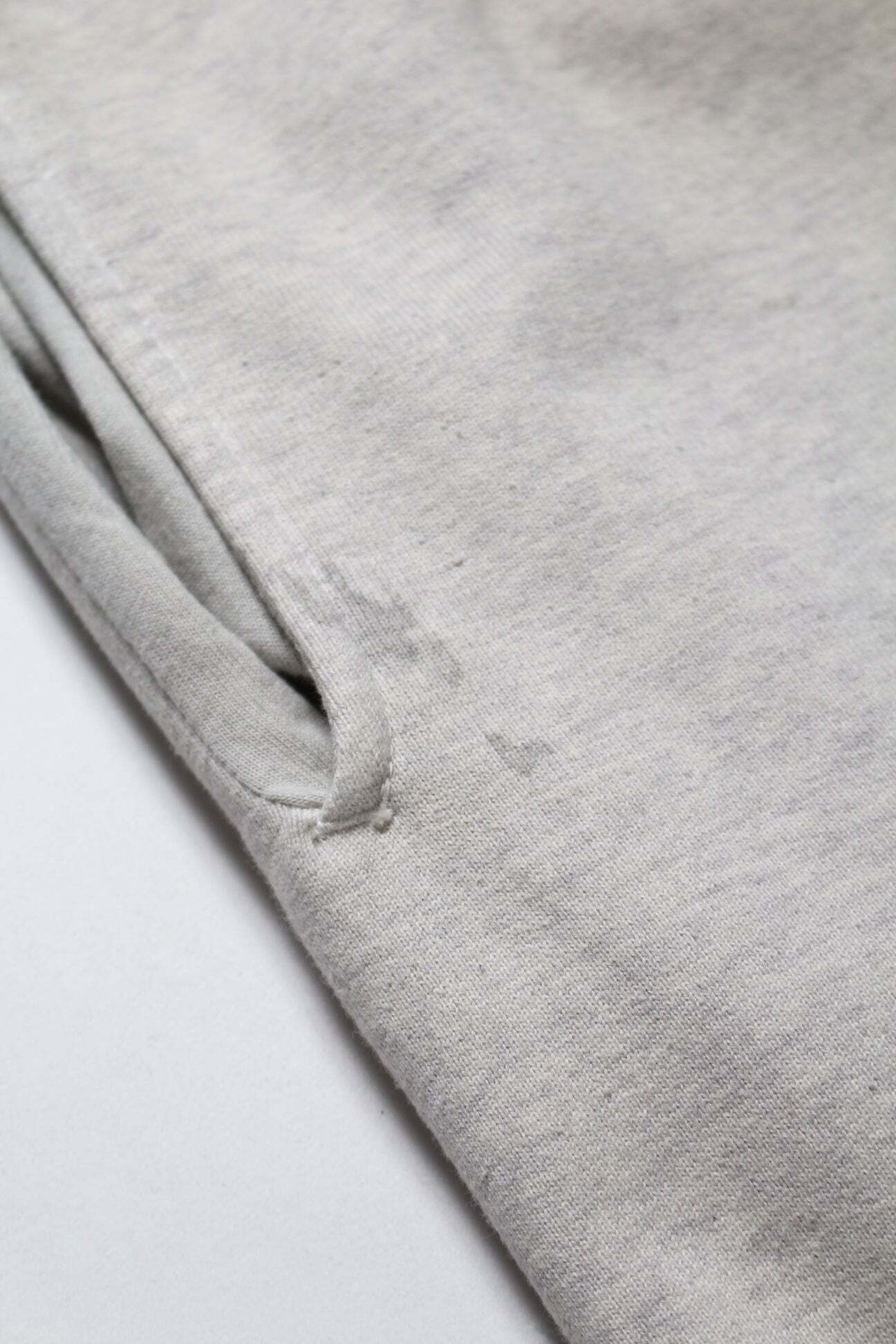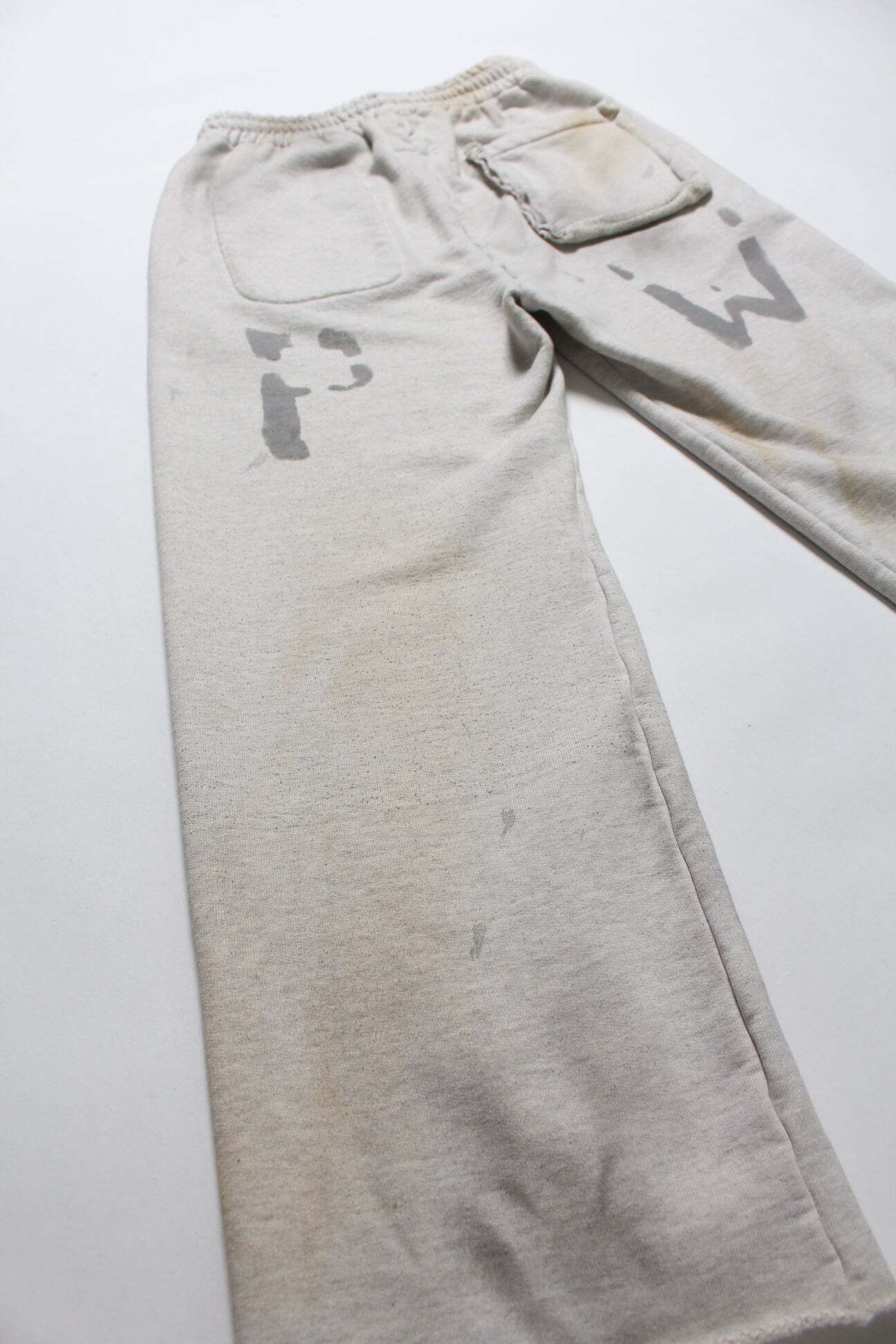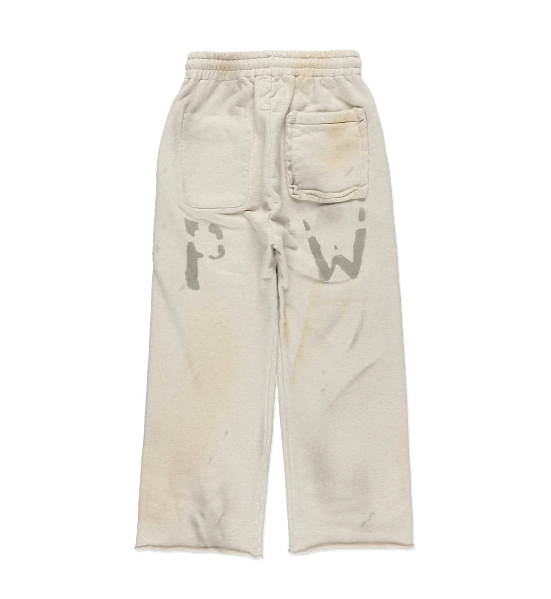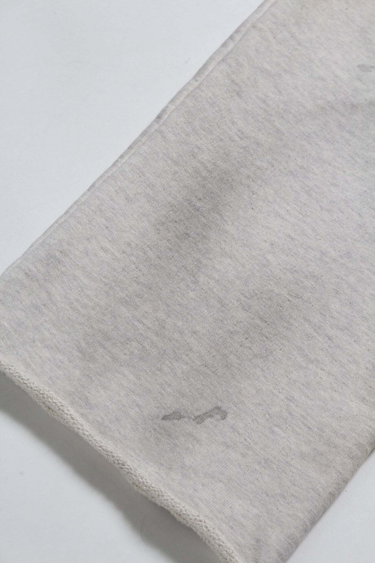 PWの文字を、戦時中に支給品へ直接記されていた識別表示のような感覚で配置し、戦争捕虜が着用していた衣類の空気感をそのまま写し取るイメージで構成している。無機質で乾いた表情を残し、上半身と同じ緊張感を足元まで繋げている。 起毛無しのオールシーズン対応厚地裏毛を使用し、特別な編み機が生み出すヴィンテージの質感を活かした仕上がり。ラフさの中に芯のある表情を残している。 股上を深く取り、スラックスのようなラインを意識したシルエットで設計。スウェットでありながら、だらしなく見えないバランスにしている。 裾は切りっ放し仕様とし、未完成感と荒さをあえて残すことで、古いスウェット特有の空気感と違和感を表現している。