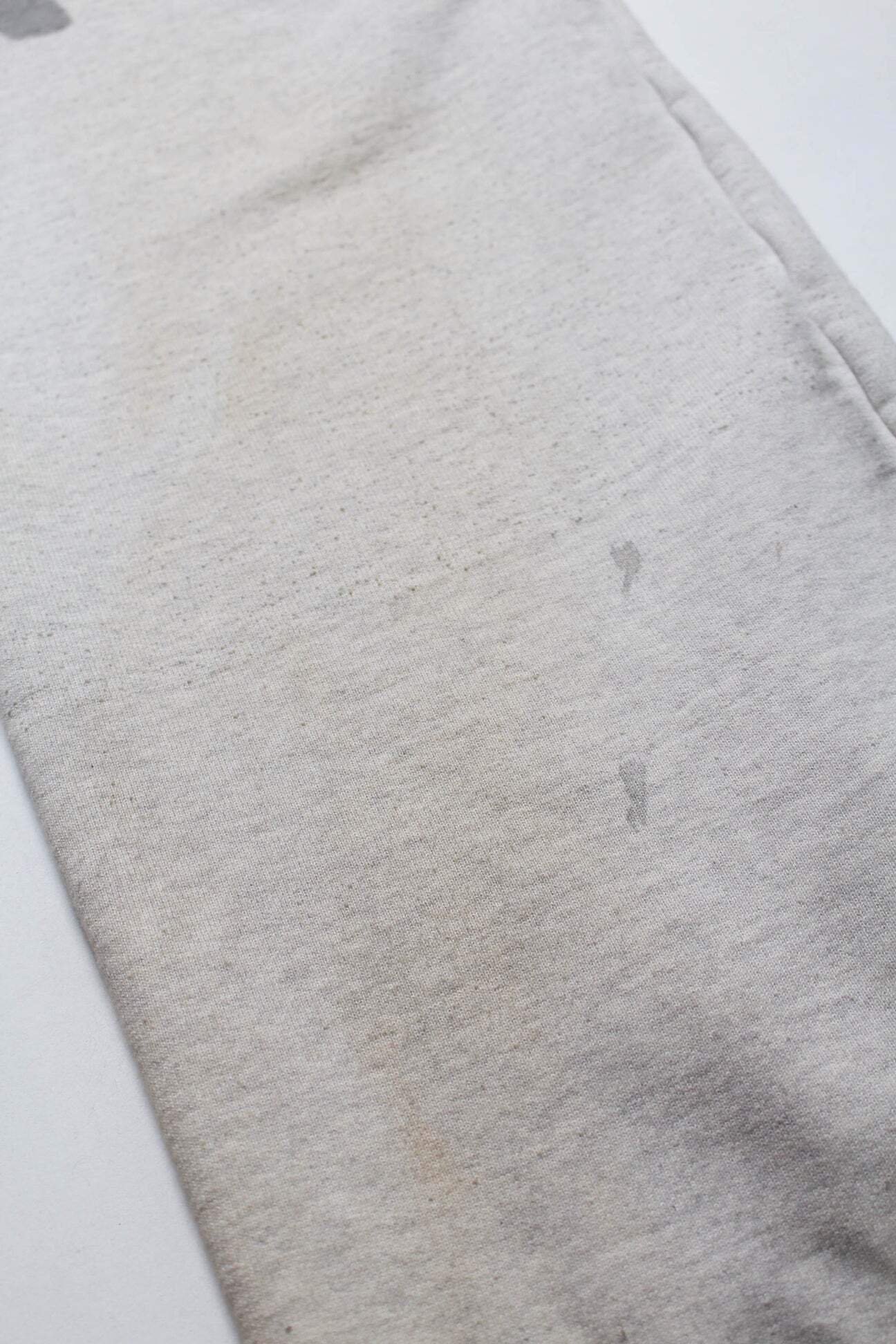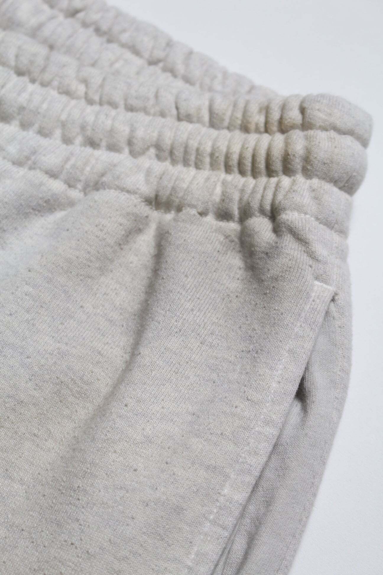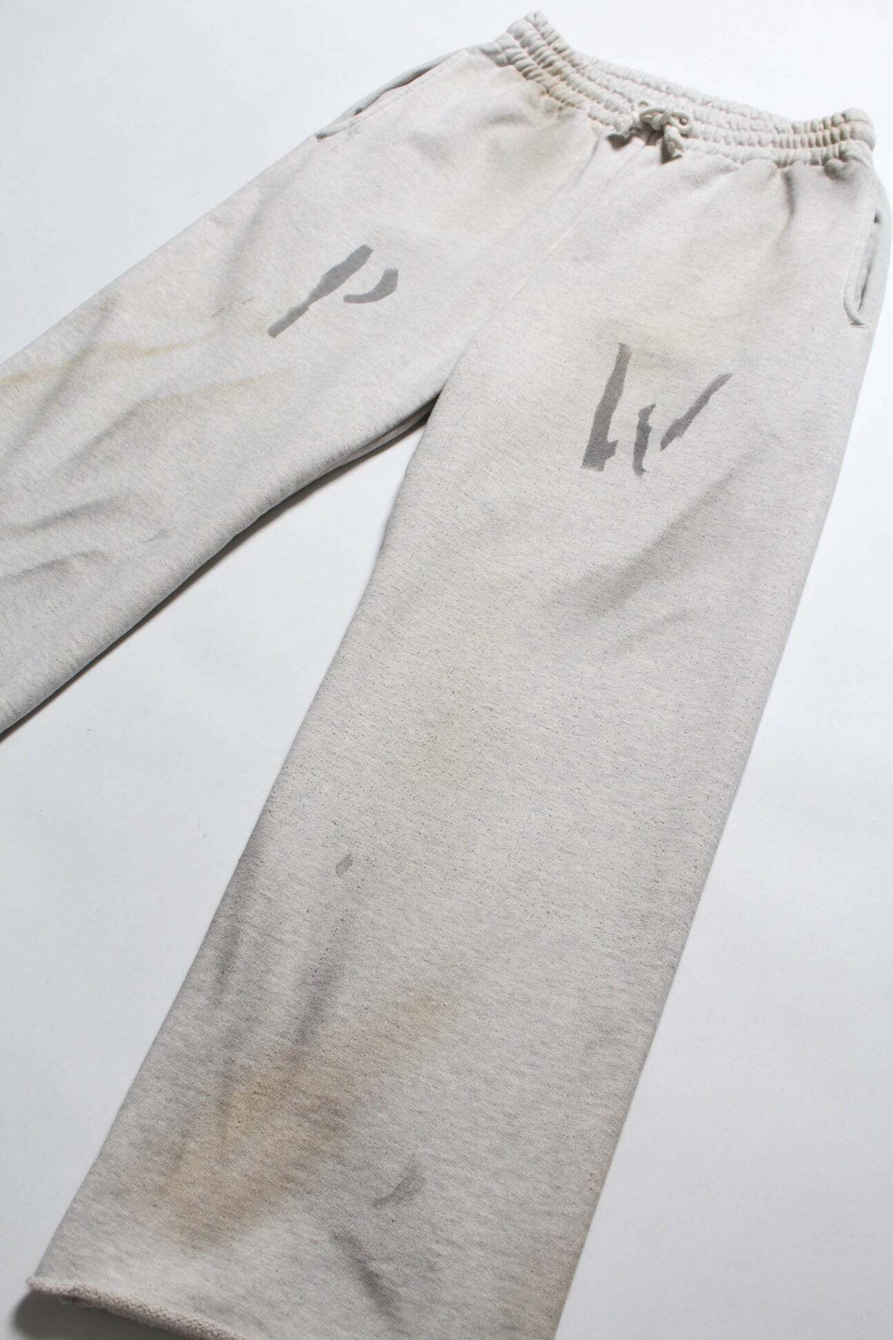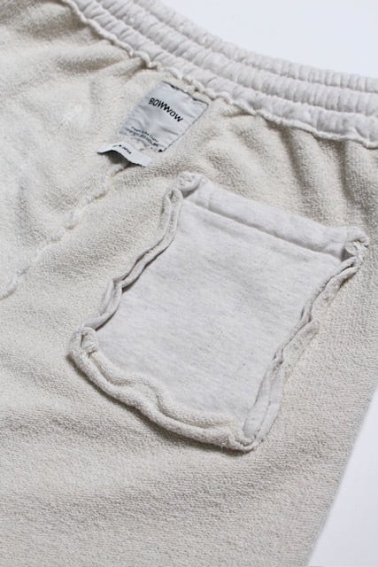 PWの文字を、戦時中に支給品へ直接記されていた識別表示のような感覚で配置し、戦争捕虜が着用していた衣類の空気感をそのまま写し取るイメージで構成している。無機質で乾いた表情を残し、上半身と同じ緊張感を足元まで繋げている。 起毛無しのオールシーズン対応厚地裏毛を使用し、特別な編み機が生み出すヴィンテージの質感を活かした仕上がり。ラフさの中に芯のある表情を残している。 股上を深く取り、スラックスのようなラインを意識したシルエットで設計。スウェットでありながら、だらしなく見えないバランスにしている。 裾は切りっ放し仕様とし、未完成感と荒さをあえて残すことで、古いスウェット特有の空気感と違和感を表現している。