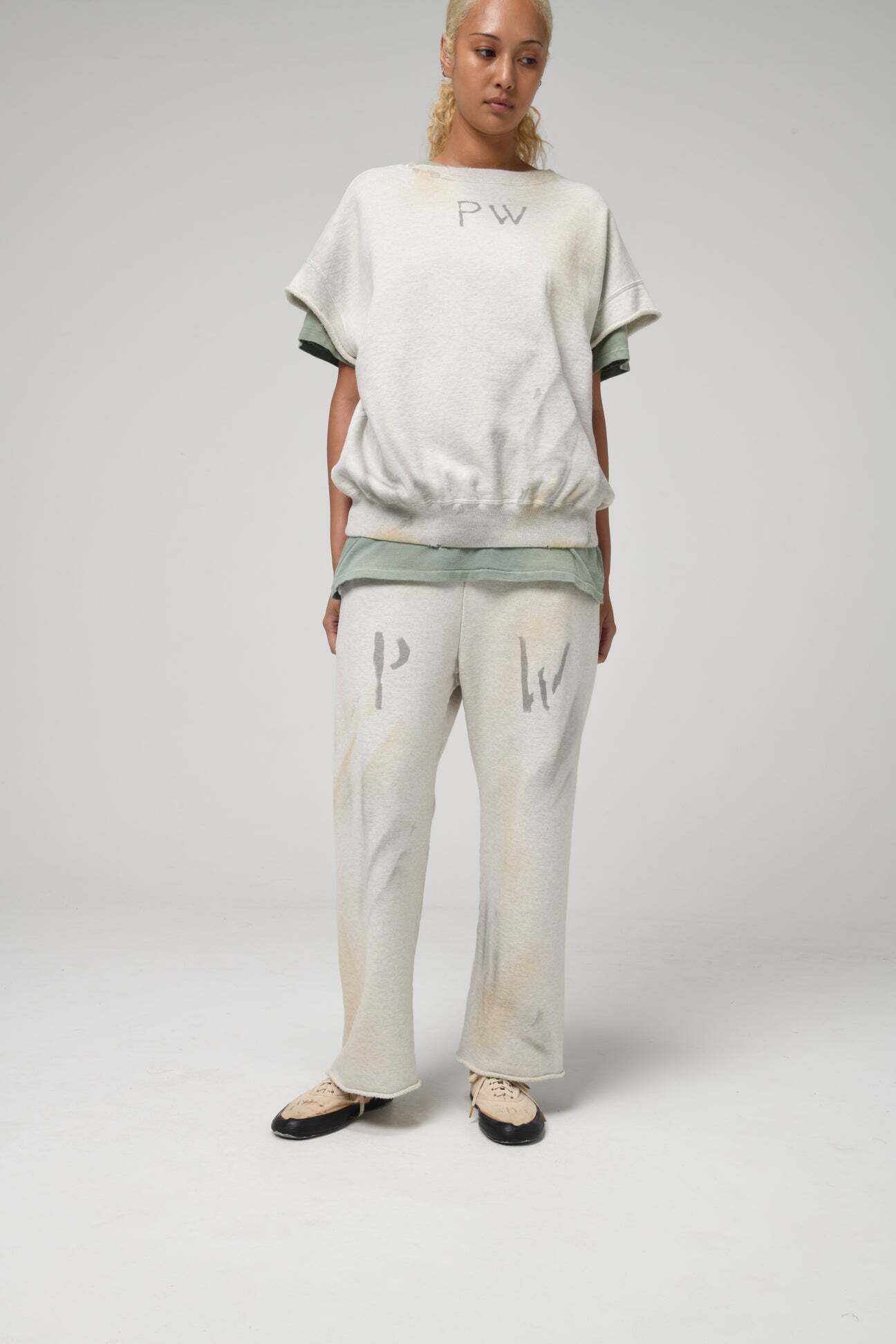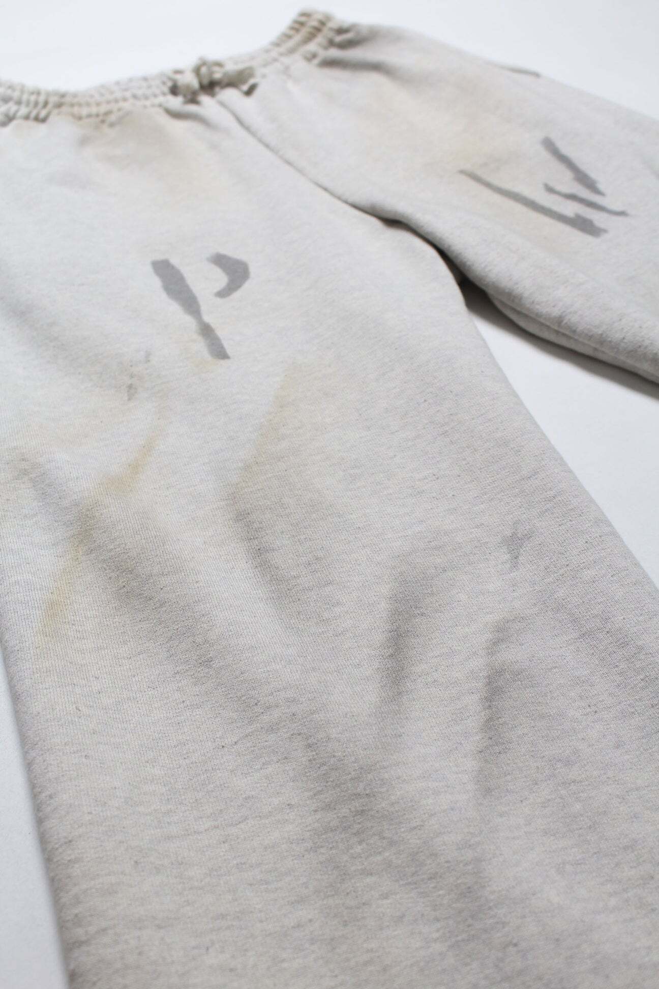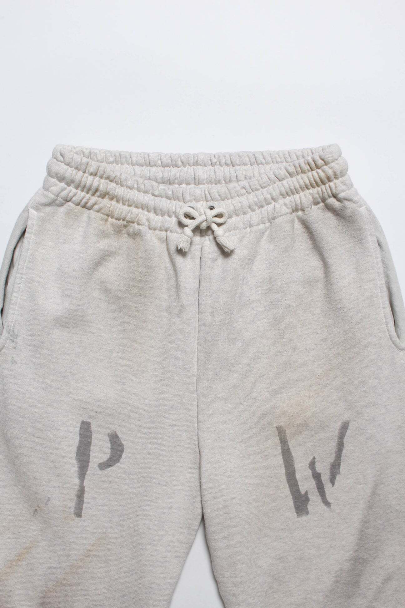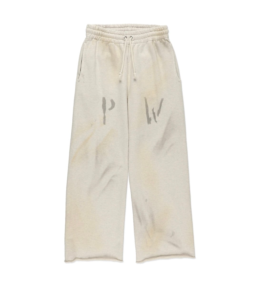 PW marking is applied with the same wartime identification sensibility, extending the dry, inorganic tension down to the legs. Made from heavy, non-brushed, all-season French terry with a vintage-textured surface from a special knitting machine. Designed with a deep rise and slacks-like line to avoid a sloppy look. Finished with raw-cut hems to keep a deliberately rough, vintage-leaning imbalance.