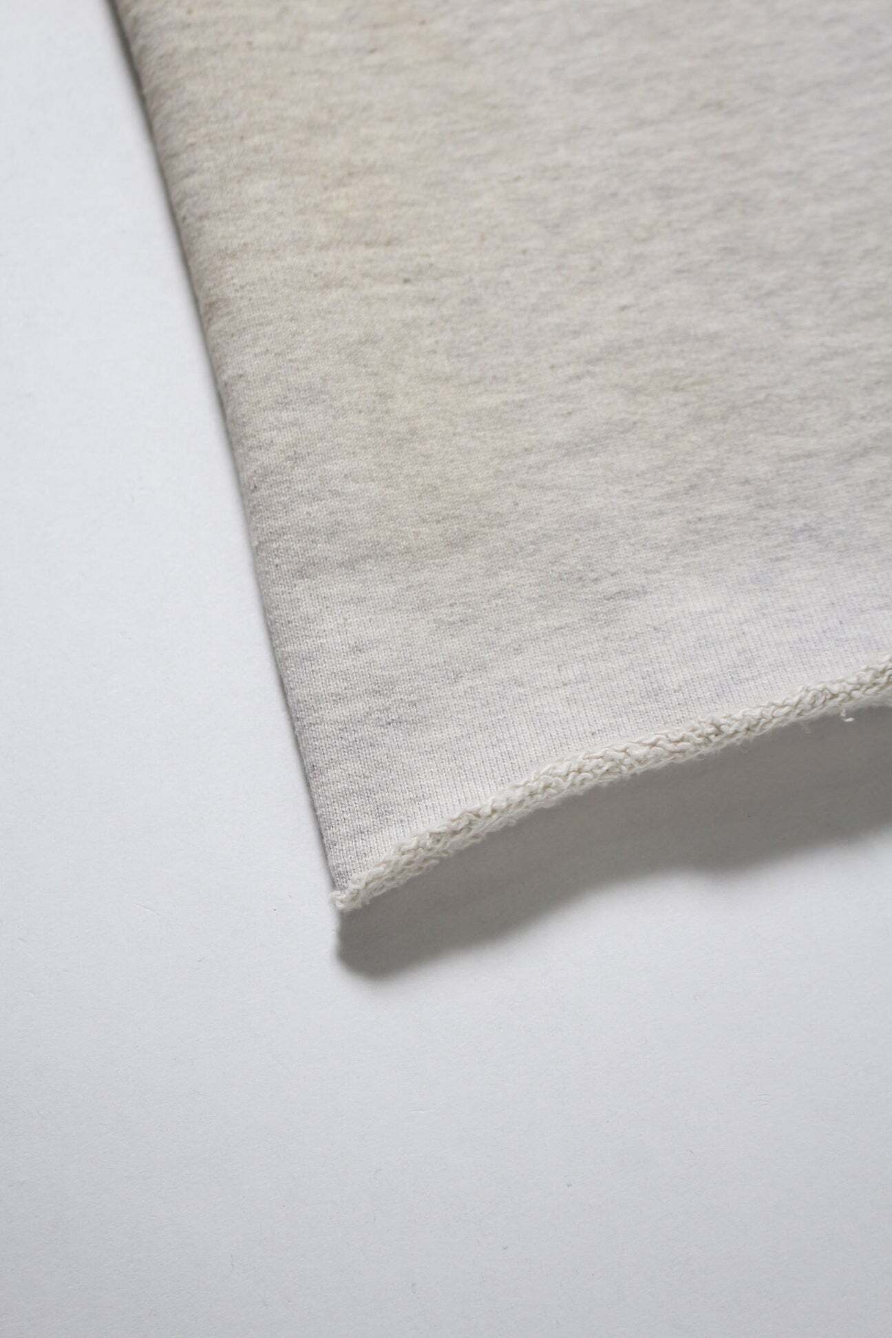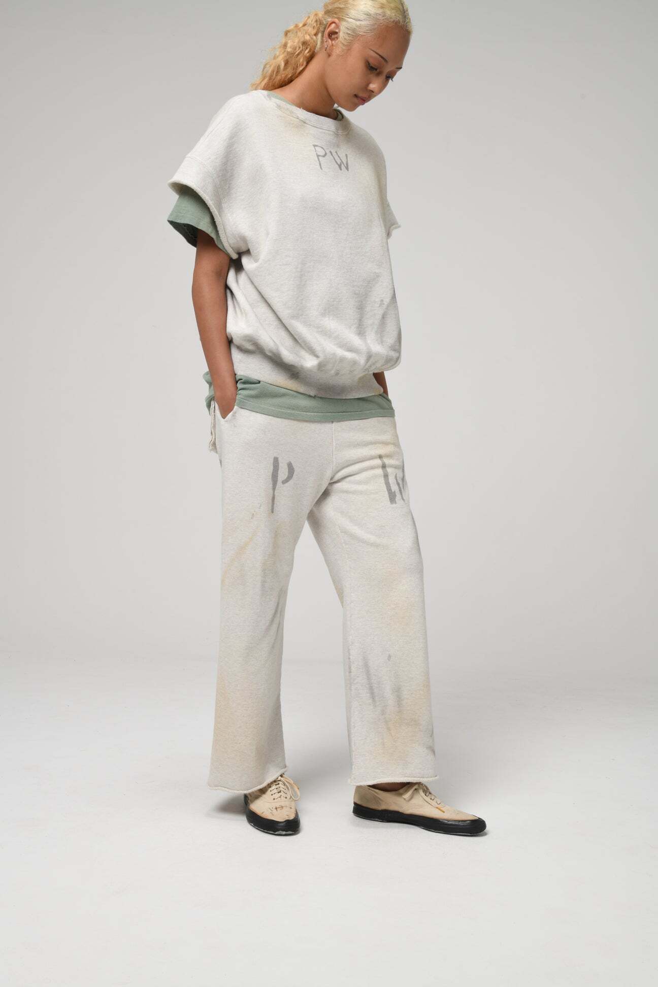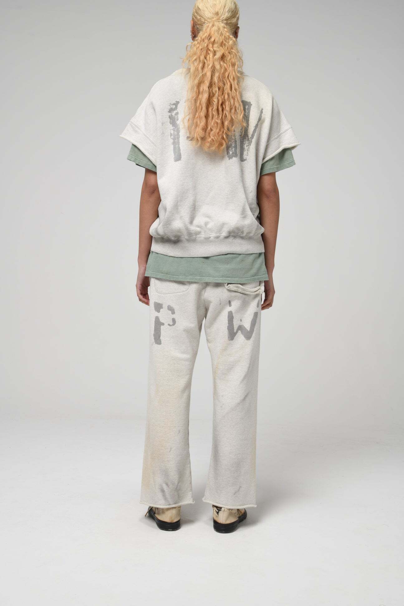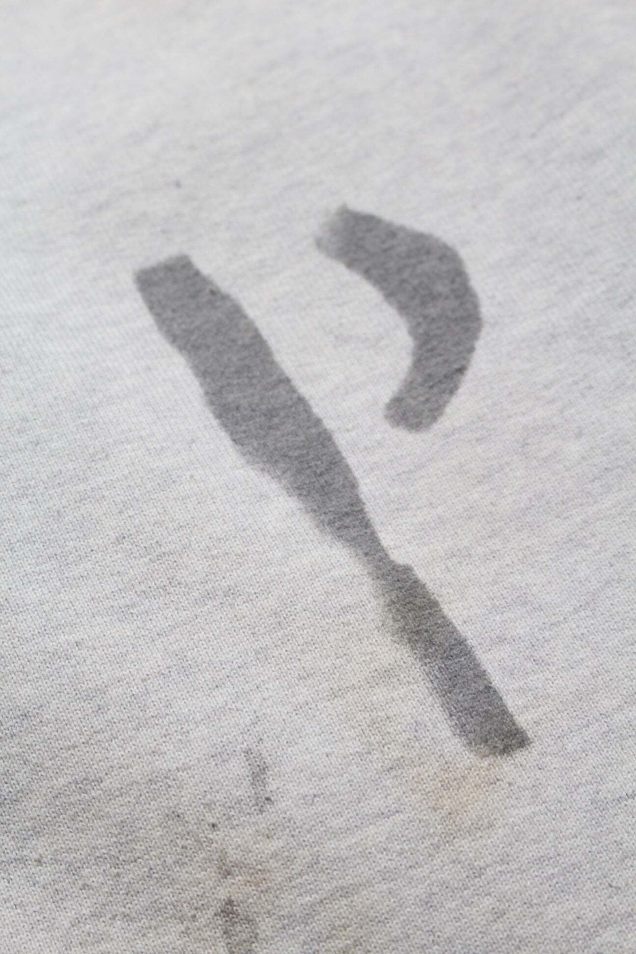 PW marking is applied with the same wartime identification sensibility, extending the dry, inorganic tension down to the legs. Made from heavy, non-brushed, all-season French terry with a vintage-textured surface from a special knitting machine. Designed with a deep rise and slacks-like line to avoid a sloppy look. Finished with raw-cut hems to keep a deliberately rough, vintage-leaning imbalance.