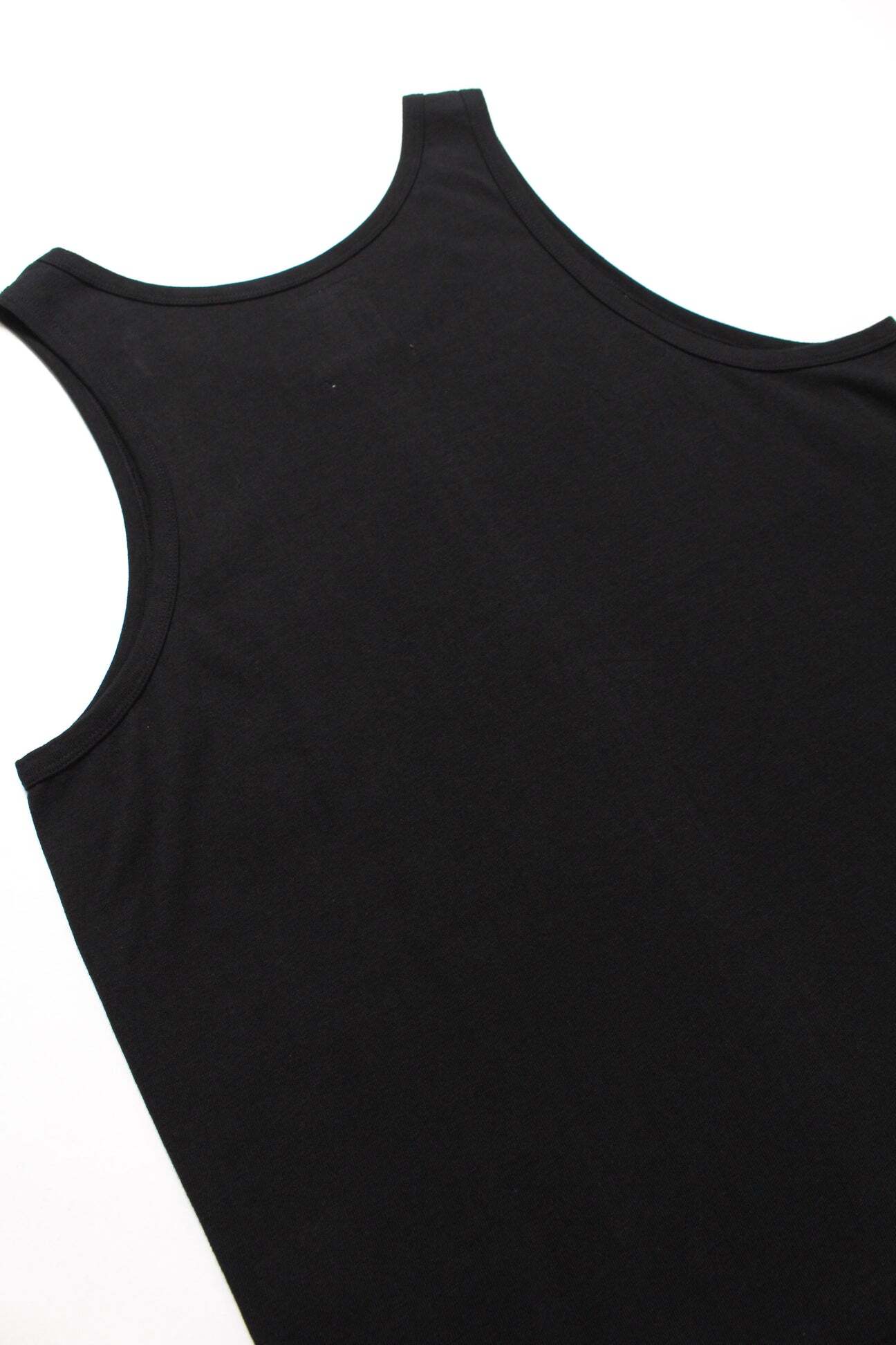 1980年代に生まれたレーヨン12%・コットン88%混のタンクトップを背景に、その年代に重視されていた着心地の良さ、落ち感、ドレープ感、軽さといった要素を意識して設計された丸胴ボディタンクトップ。レーヨン混ならではの上質で都会的な空気感を、現代のプロダクトとして表現している。 60cmにも及ぶ丸胴寸は、現在の日本では量産が極めて難しいサイズ感であり、そのボリュームバランス自体がプロダクトの個性にもなっている。このプロダクトが追求してきた理想のシルエットと着心地は、完成形をむかえている。