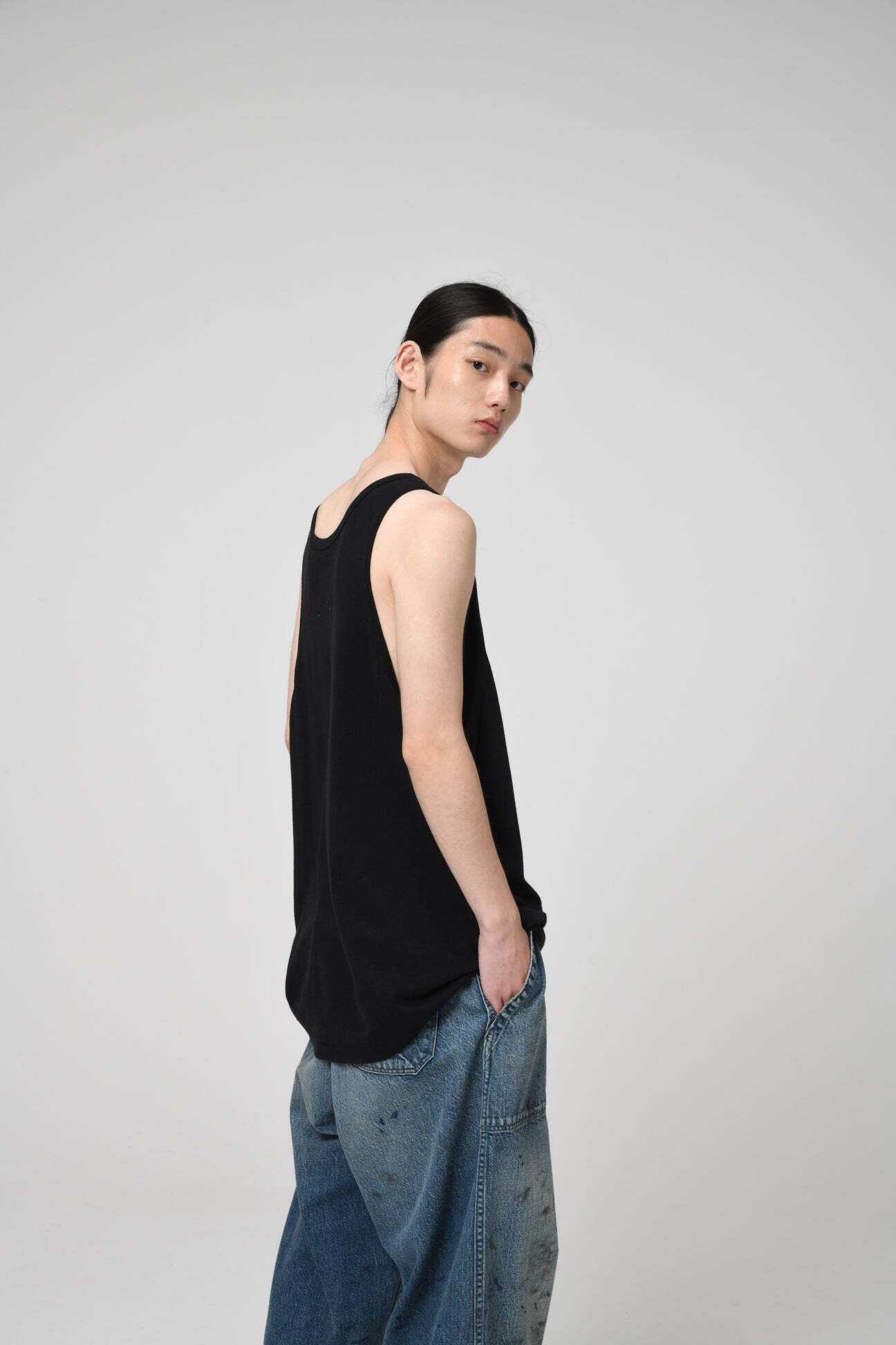 A tubular-body tank top designed from the reference of an 1980s 12% rayon / 88% cotton tank, reflecting the era’s priorities—comfort, drape, lightness, and fluidity. The refined, urban mood unique to rayon blends is expressed as a modern product. A tubular body circumference reaching 60 cm is extremely difficult to mass-produce in Japan today, and that volume balance itself becomes part of the product’s character. The ideal silhouette and comfort pursued by this product have reached a finished form.
