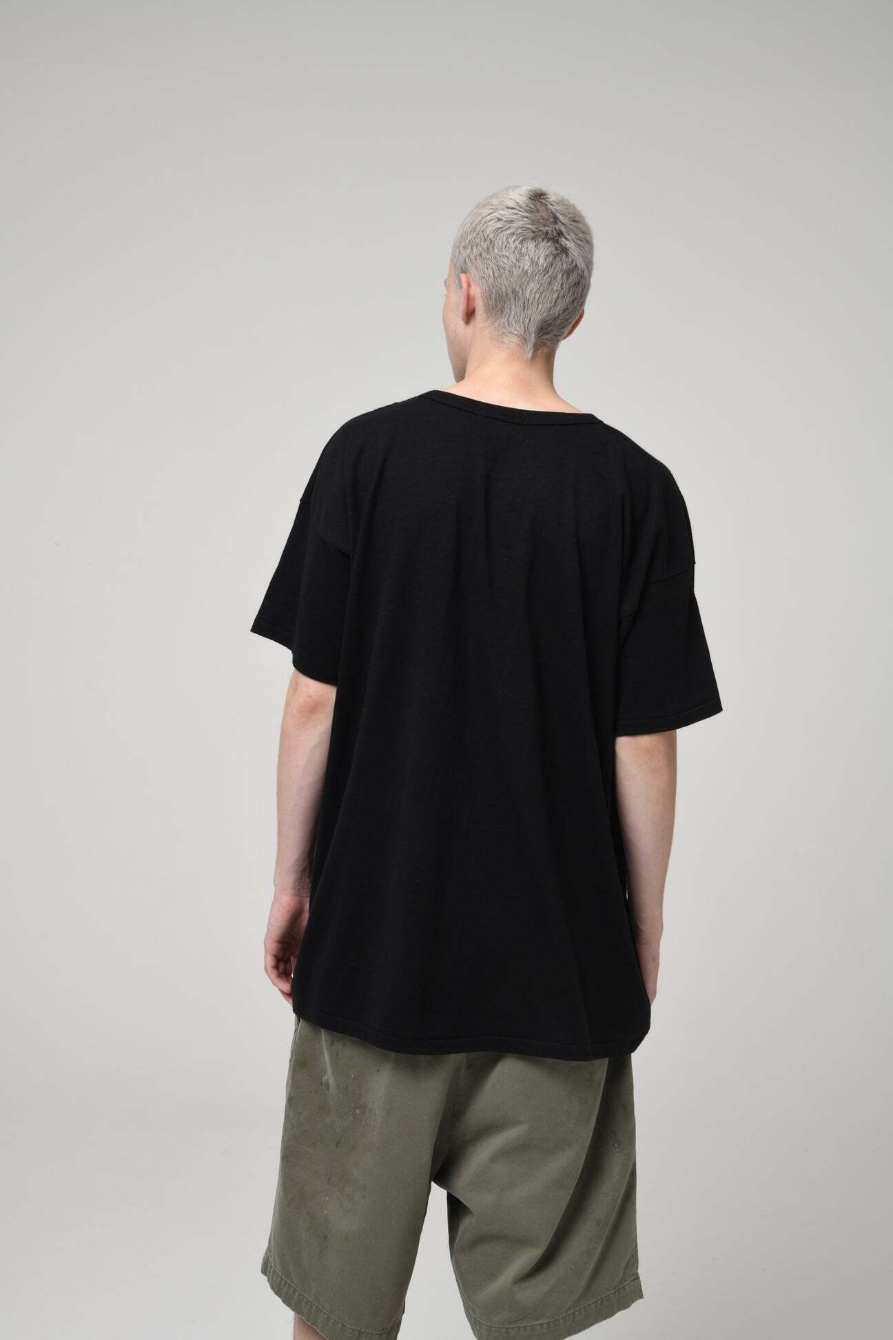 1980年代に生まれたレーヨン12%・コットン88%混の半袖Tシャツを背景に、その年代に重視されていた着心地の良さ、落ち感、ドレープ感、軽さといった要素を意識して設計された丸胴ボディ。レーヨン混ならではの上質で都会的な空気感を、現代のプロダクトとして表現している。 60cmにも及ぶ丸胴寸は、現在の日本では量産が極めて難しいサイズ感であり、そのボリュームバランス自体がプロダクトの個性にもなっている。このプロダクトが追求してきた理想のシルエットと着心地は、完成形をむかえている。 生地、縫製、パターンは、効率よりも完成度を優先した、拘りの積み重ねによって成立している。