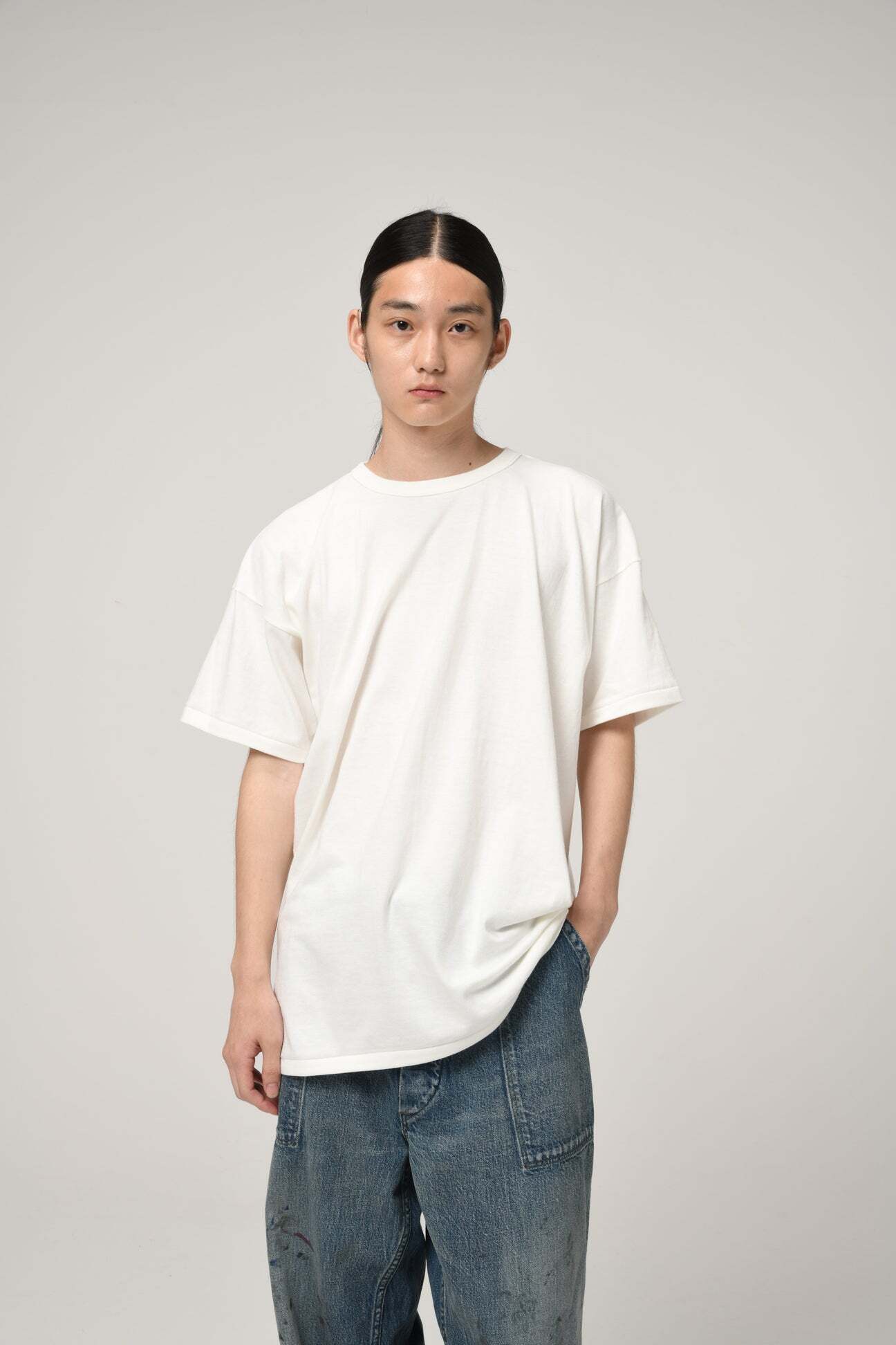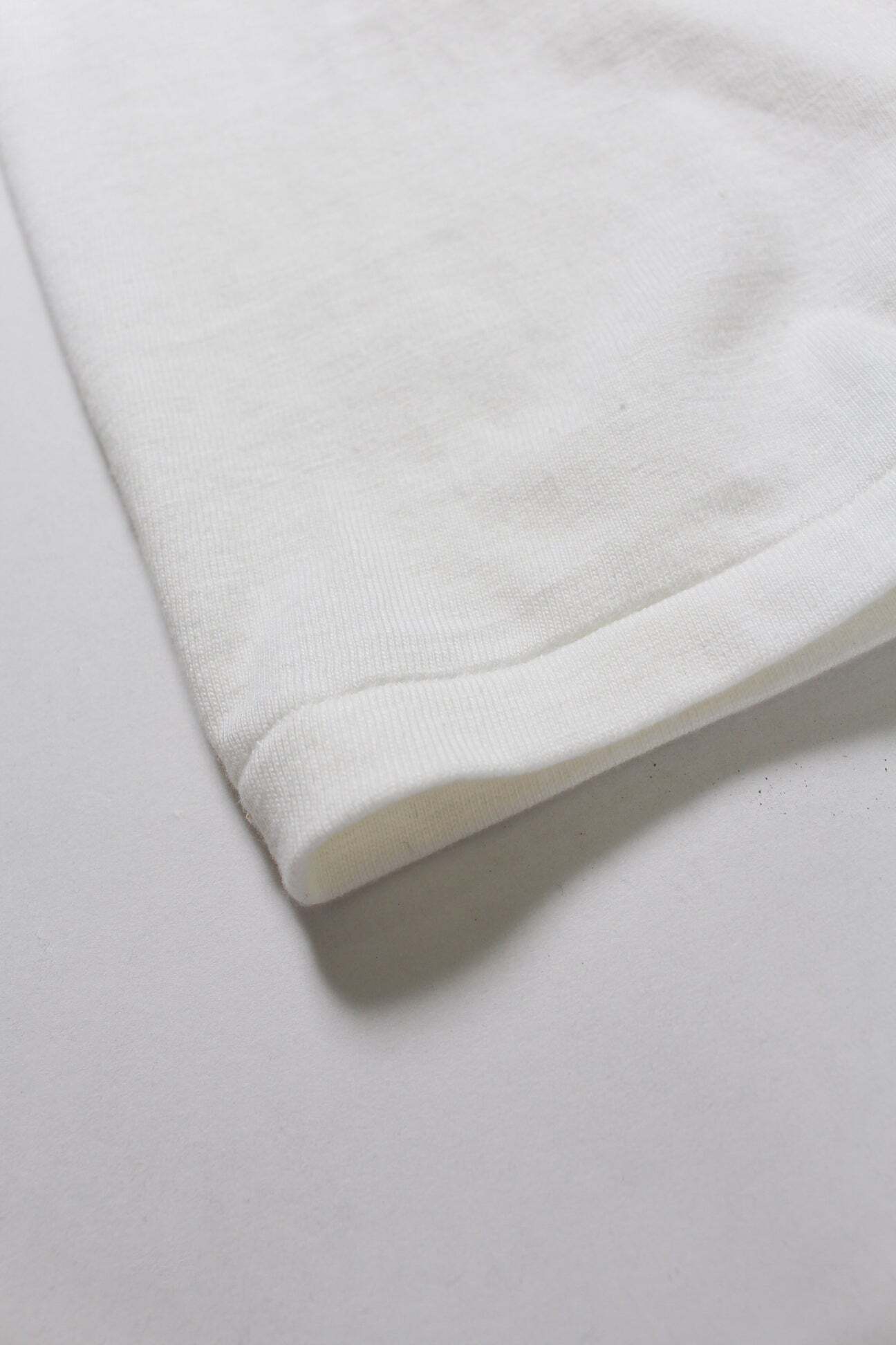 Designed from the reference of an 1980s 12% rayon / 88% cotton short-sleeve T-shirt, reflecting the era’s priorities—comfort, drape, lightness, and fluidity—through a tubular-body construction. The refined, urban mood unique to rayon blends is expressed as a modern product. A tubular body circumference reaching 60 cm is extremely difficult to mass-produce in Japan today, and that volume balance itself becomes part of the product’s character. The ideal silhouette and comfort pursued by this product have reached a finished form. Fabric, sewing, and pattern are built through accumulated dedication that prioritizes completeness over efficiency.