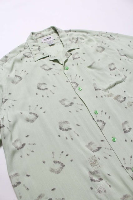 ヴィンテージで稀に見つかる手形モチーフは、古着好きの心を掴んで離さない存在。その印象的なグラフィックを、1950年代のヴィンテージで確認されたレーヨンのセットアップ生地をもとに再現している。 アメリカらしいユーモアとプリミティブな空気感をそのまま残し、レーヨン100%の素材感と相まって、当時のムードを色濃く感じさせる仕上がりに。 生地の風合いや落ち感、プリントの滲み方まで含め、ヴィンテージさながらの再現度も見どころになっている。 開襟仕様ならではの抜け感と、手形プリントのインパクトが自然に重なり、軽やかさの中に強さのある佇まいを持たせている。