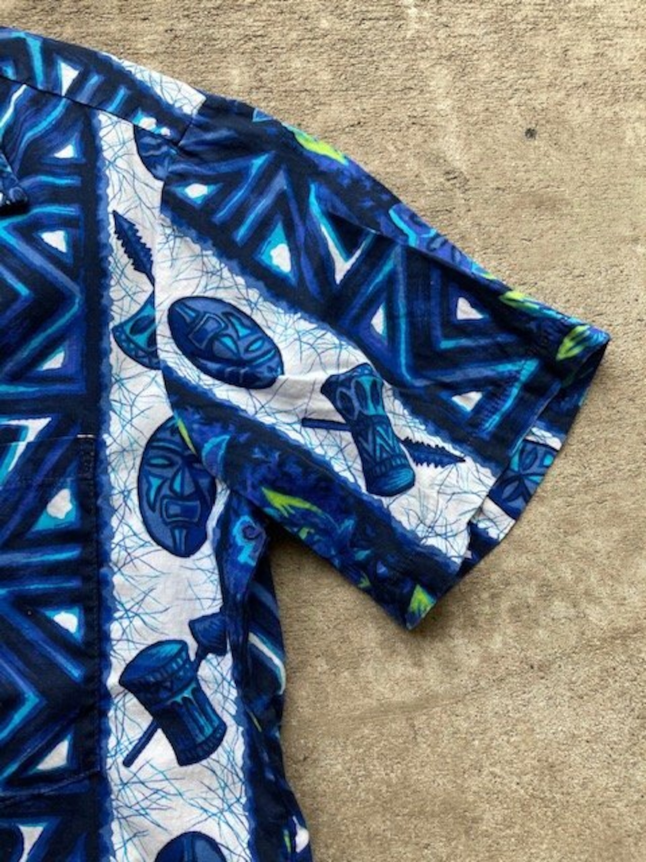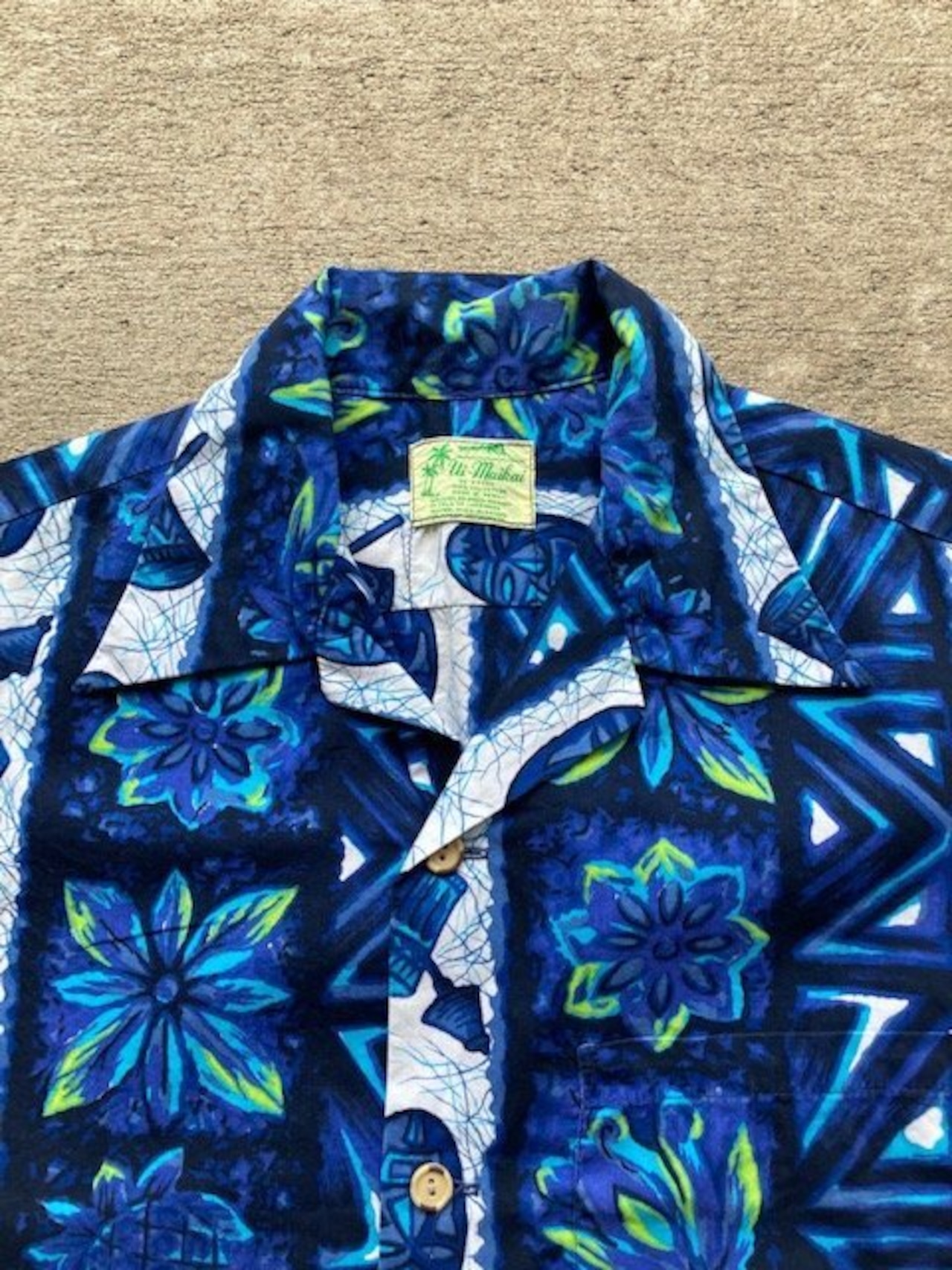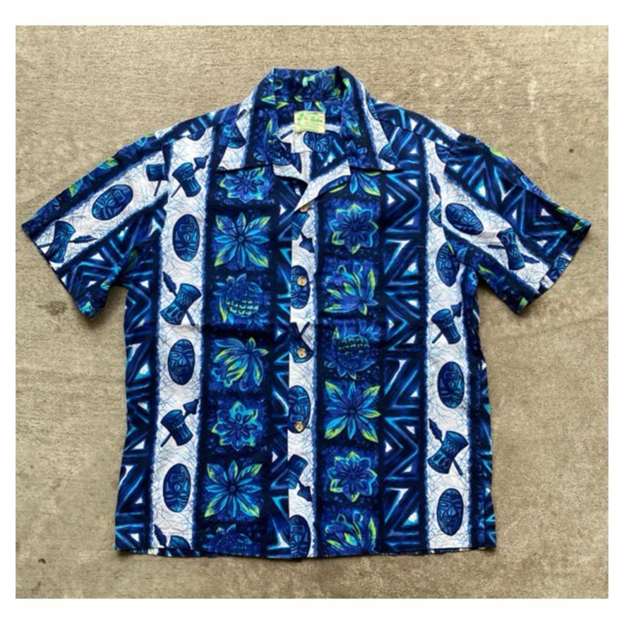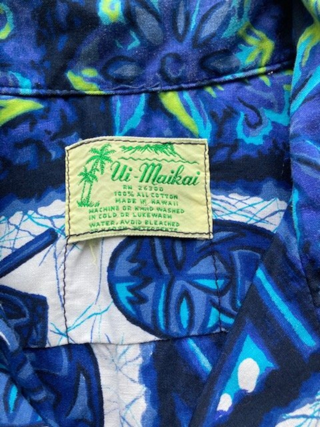 60年代のUi-maikaiのアロハシャツです。ハワイを象徴するアイコンがボーダー状で配されています。トライバル風なデザインは好印象の1枚です。左胸にパチポケも付き、柄合わせもしっかりしています。コットン製で扱いやすさもポイントの高いところです。