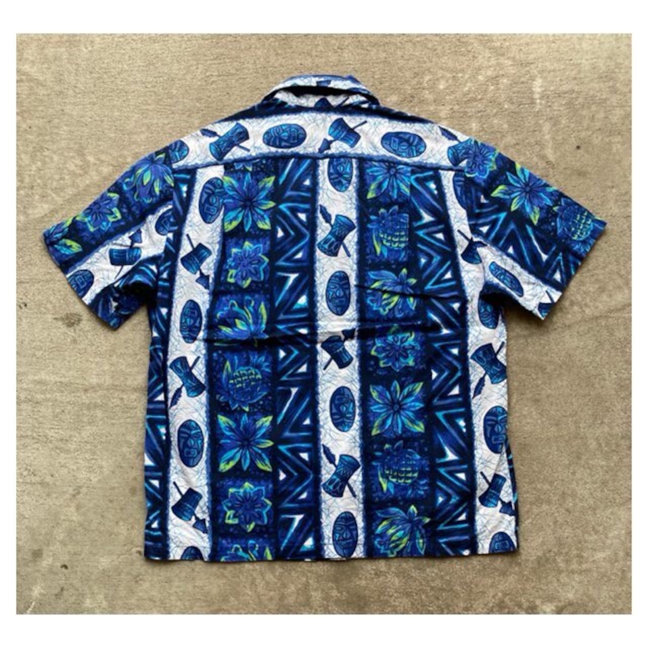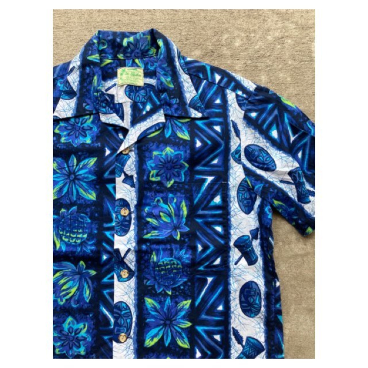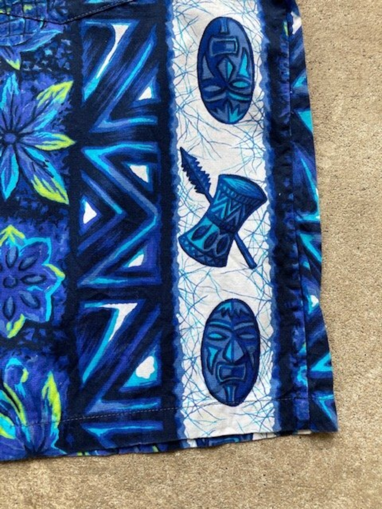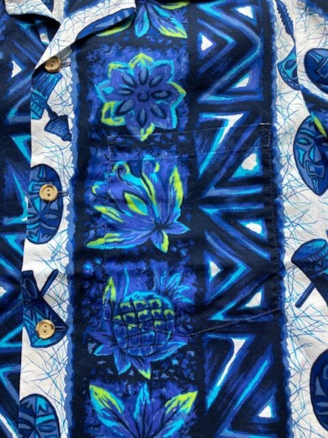 60年代のUi-maikaiのアロハシャツです。ハワイを象徴するアイコンがボーダー状で配されています。トライバル風なデザインは好印象の1枚です。左胸にパチポケも付き、柄合わせもしっかりしています。コットン製で扱いやすさもポイントの高いところです。