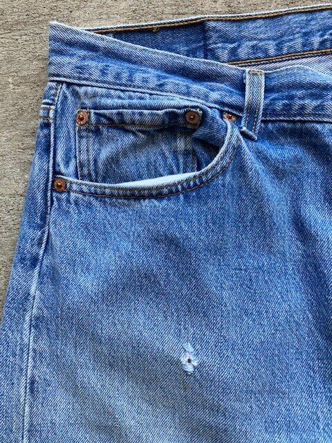 フェード感が強いですが、春夏シーズンにはピッタリな色合いかと思います。ヒゲも僅かですが見られ、当時ならではの色合いが楽しめます。右モモ付け根部分にダメージ、左膝裏辺りにペンキ飛びが見られますが、穿くには全く問題ありません。