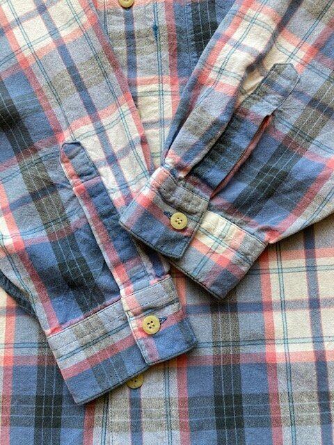 カルバンクラインのチェックシャツです。清涼感ある配色のチェックが特徴です。またポケットの作りが独特でカバーオール?HBT ジャケット?のようなポケットのディテールが秀逸です。着丈は長く、袖はやや短めの作りも現代には見られない作り。