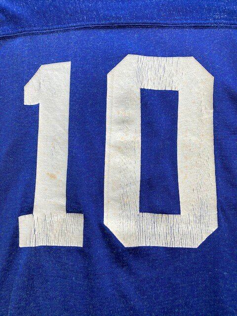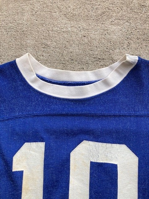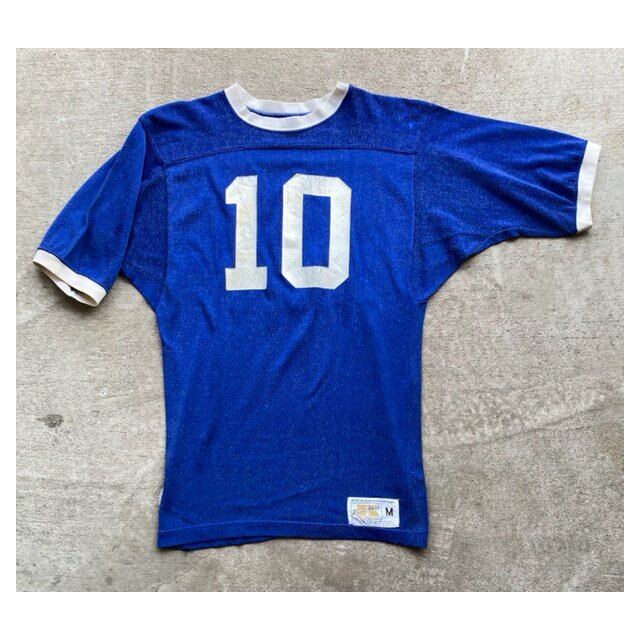 ラッセルアスレチックのレーヨンフットボールTシャツ。金タグの70年代のものとなります。レーヨン素材独特のドレープ感ある生地感が特徴です。両面に”10”とナンバリング。リンガータイプ。色目もロイヤルブルー系の色合いが好印象です。