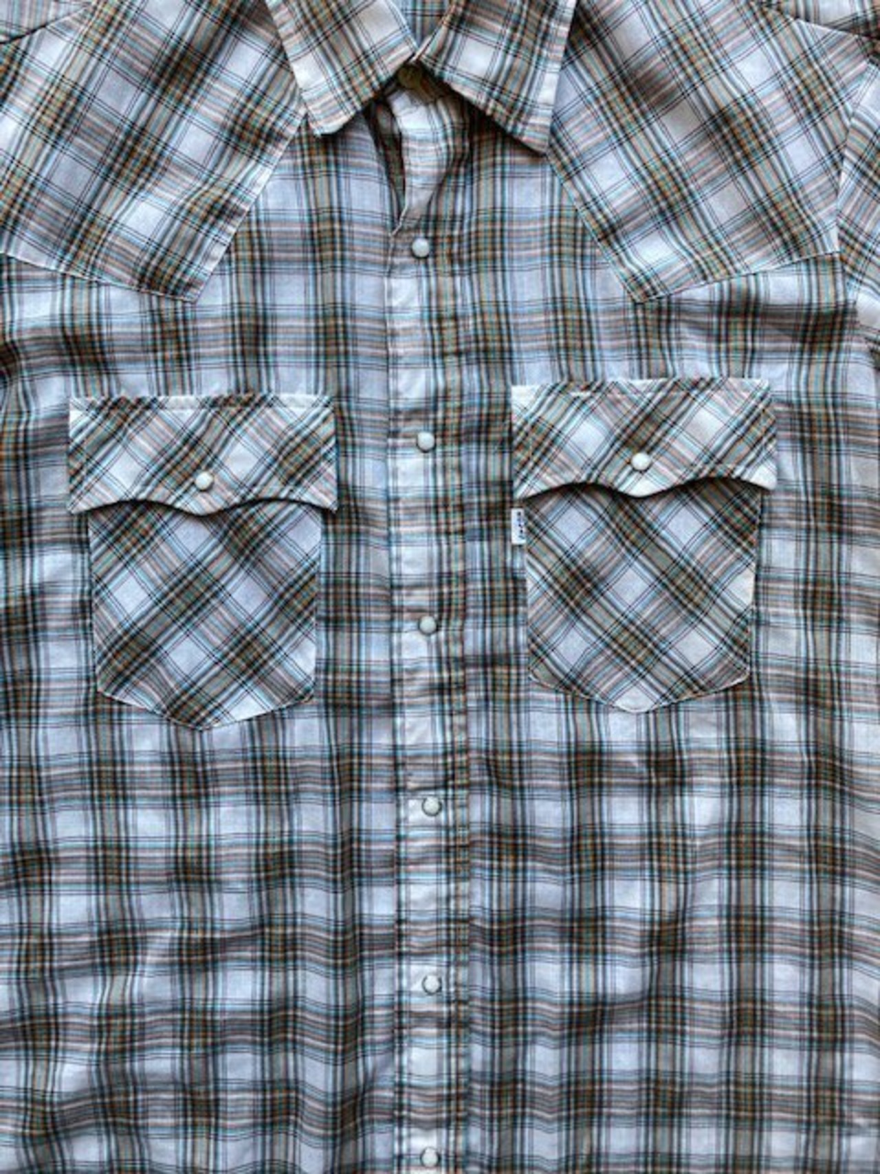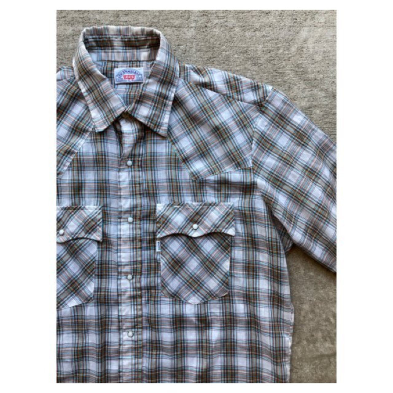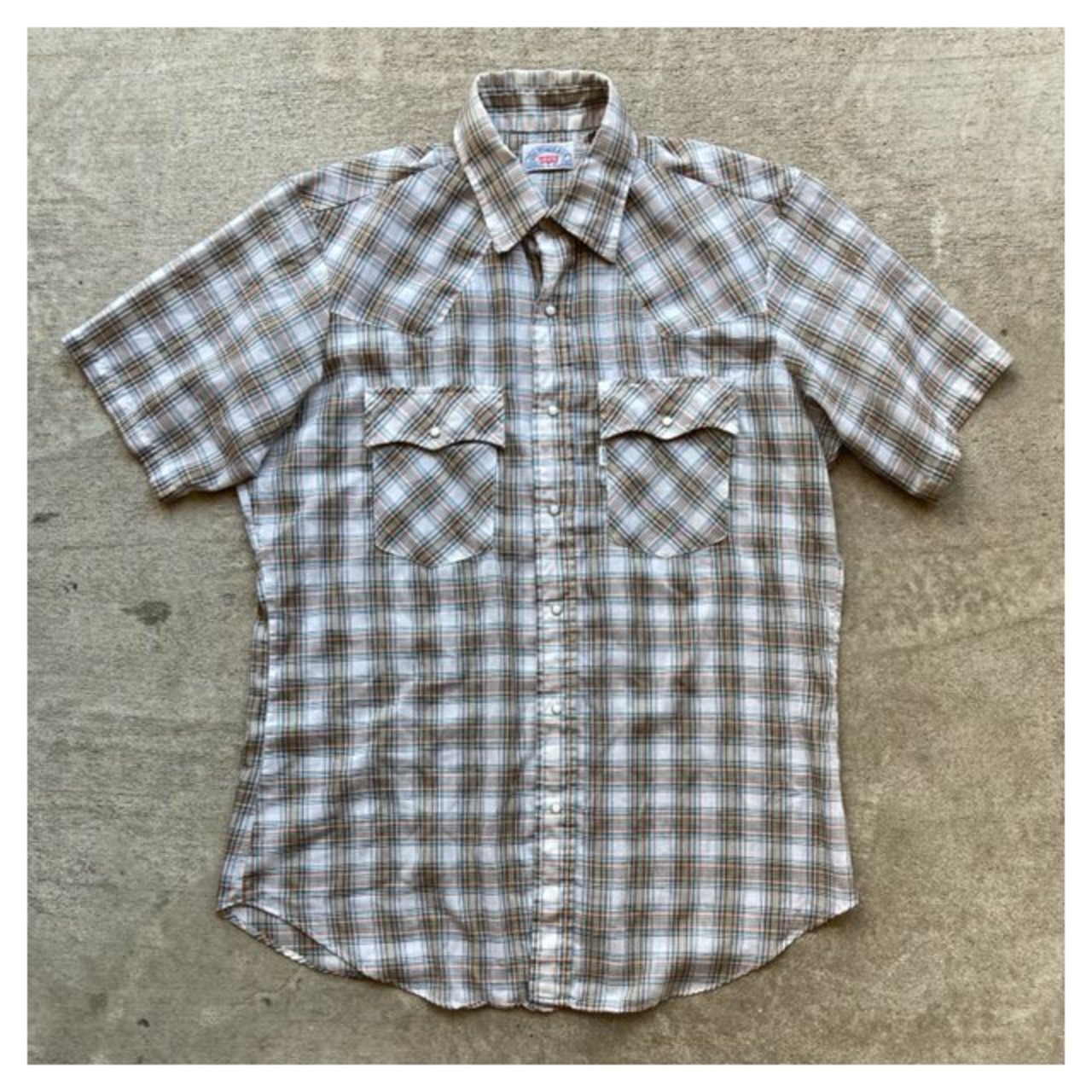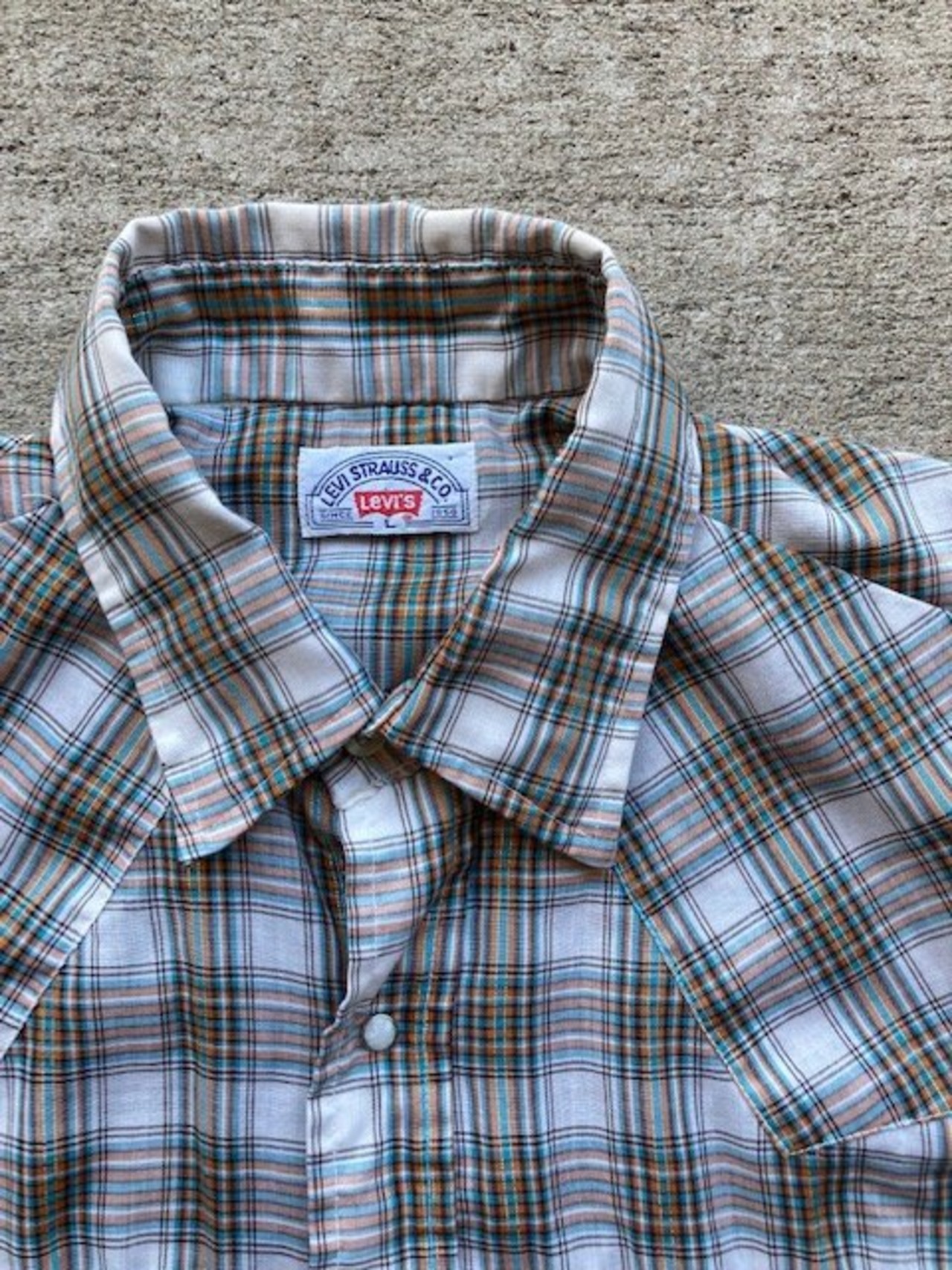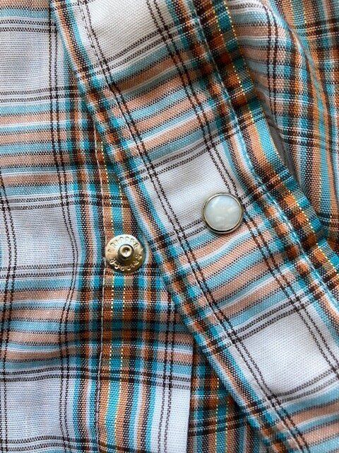 リーバイスの半袖チェックウエスタンシャツです。詳しい年代は不明ですが、スナップはスコービル社のグリッパースナップ、襟芯入りの1枚となっています。チェックのラインにさりげないラメのラインが特徴の1枚です。