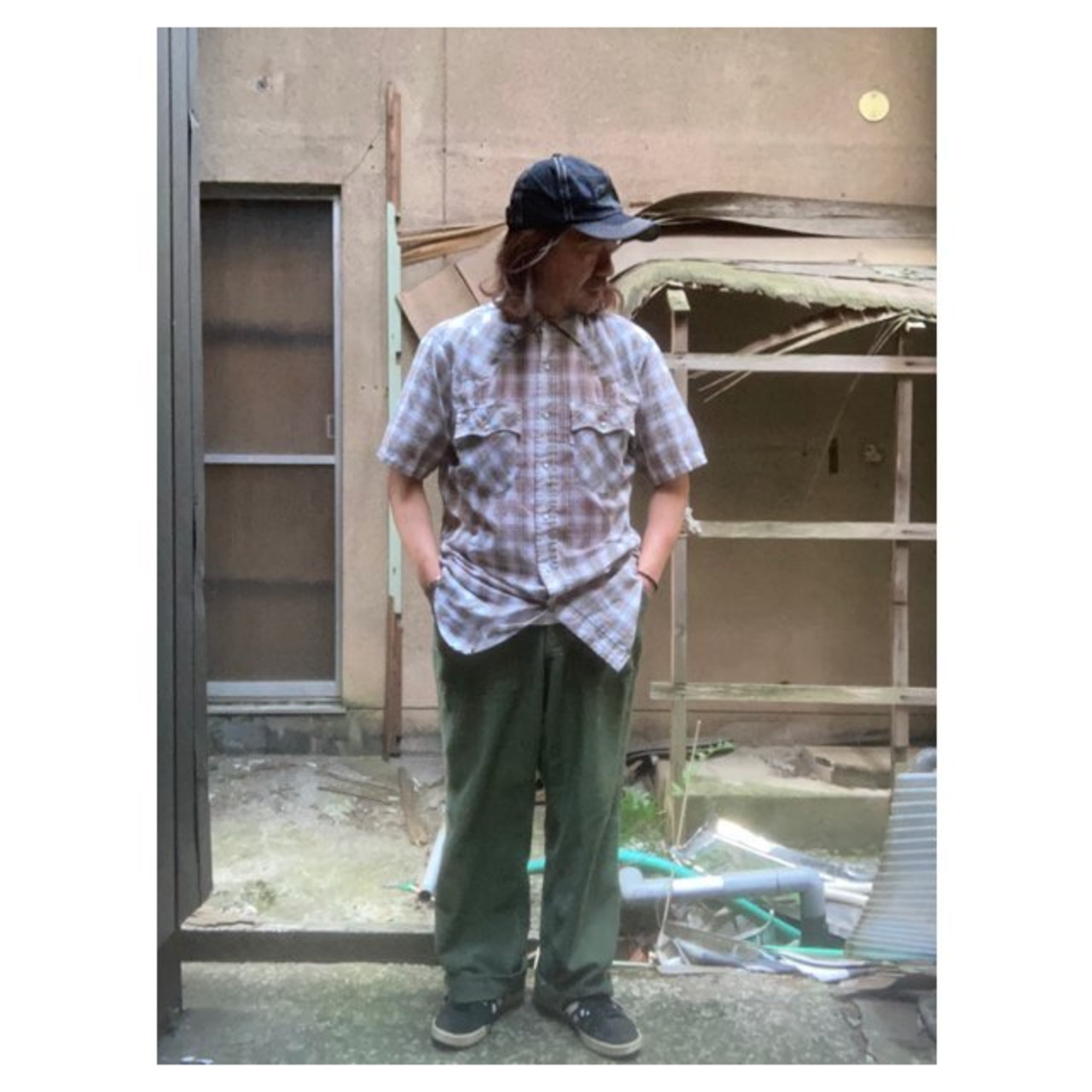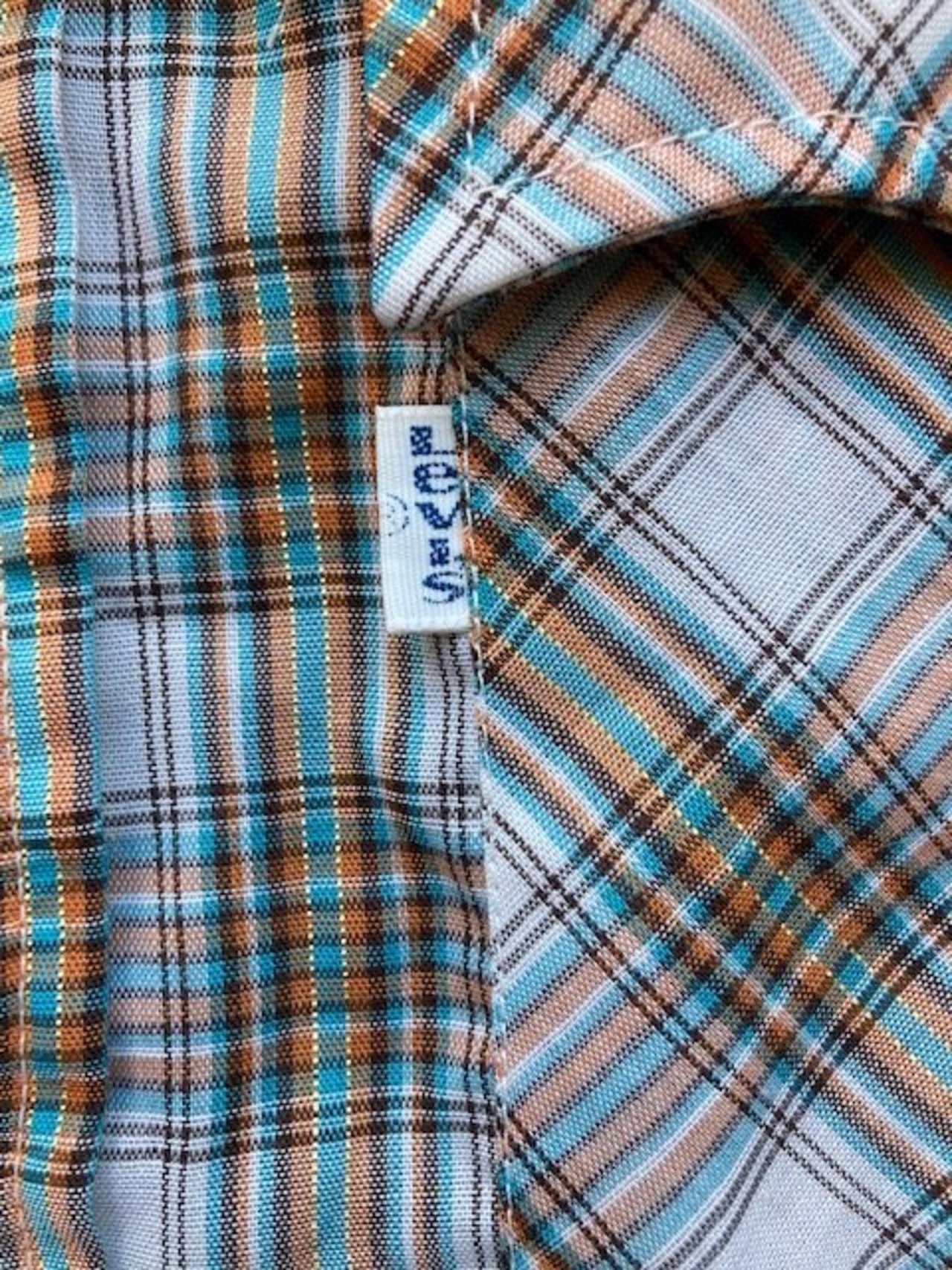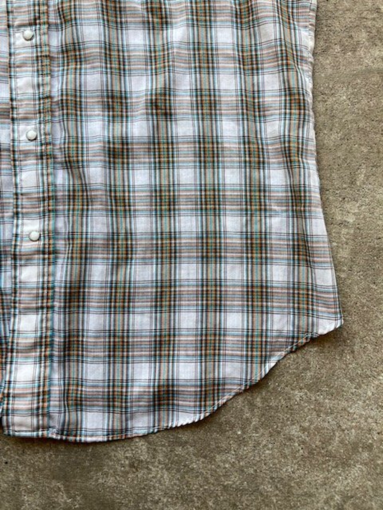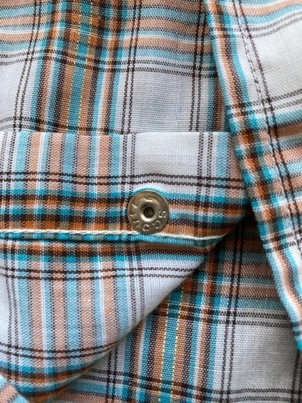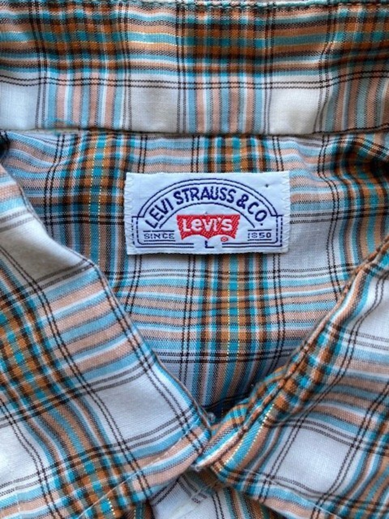 リーバイスの半袖チェックウエスタンシャツです。詳しい年代は不明ですが、スナップはスコービル社のグリッパースナップ、襟芯入りの1枚となっています。チェックのラインにさりげないラメのラインが特徴の1枚です。