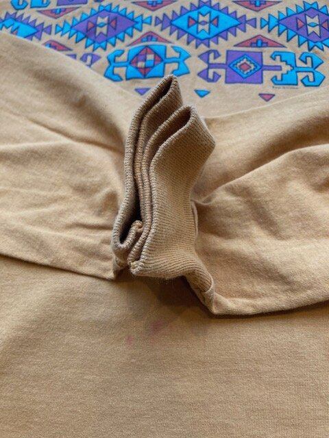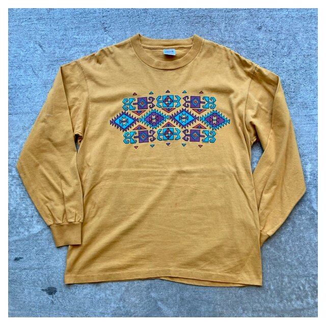 90年代のアンビルボディのアートプリントTシャツです。フロントに多色でネイティブパターンのプリントを配した1枚です。