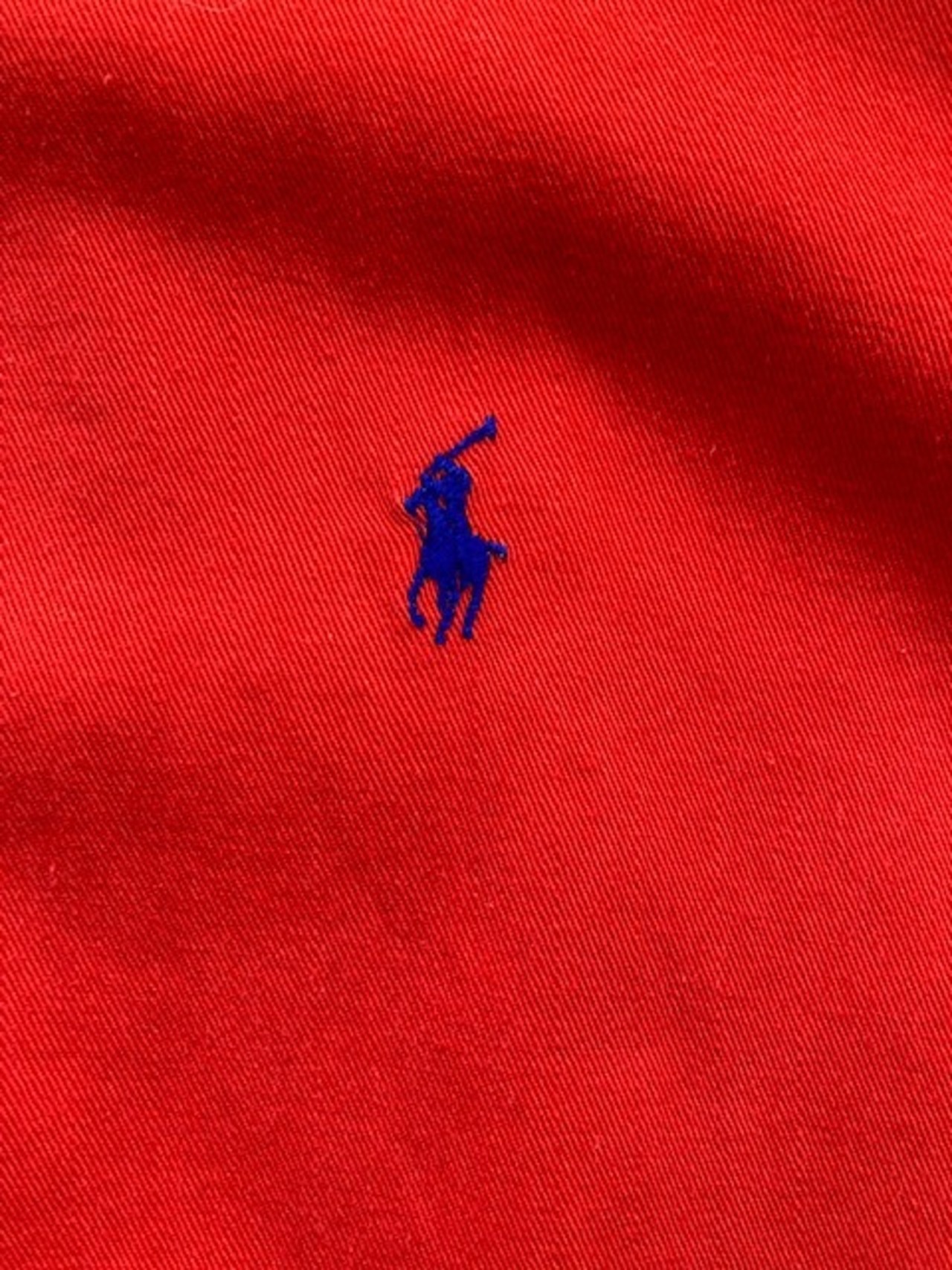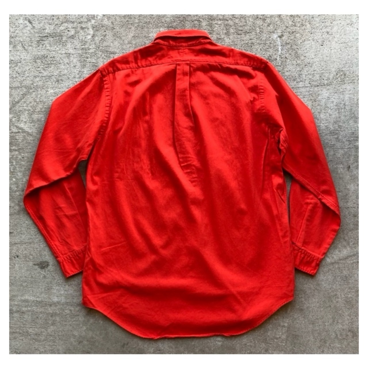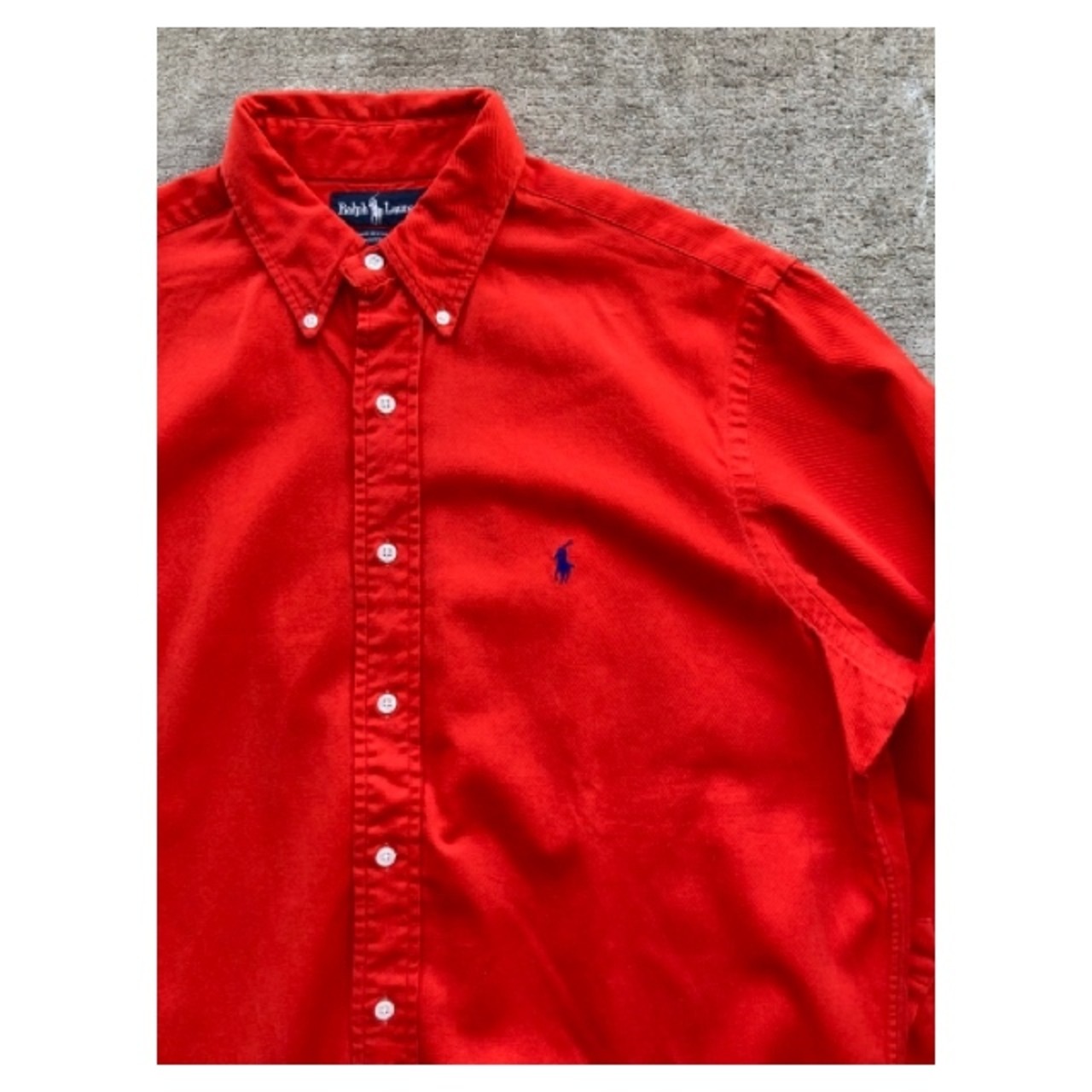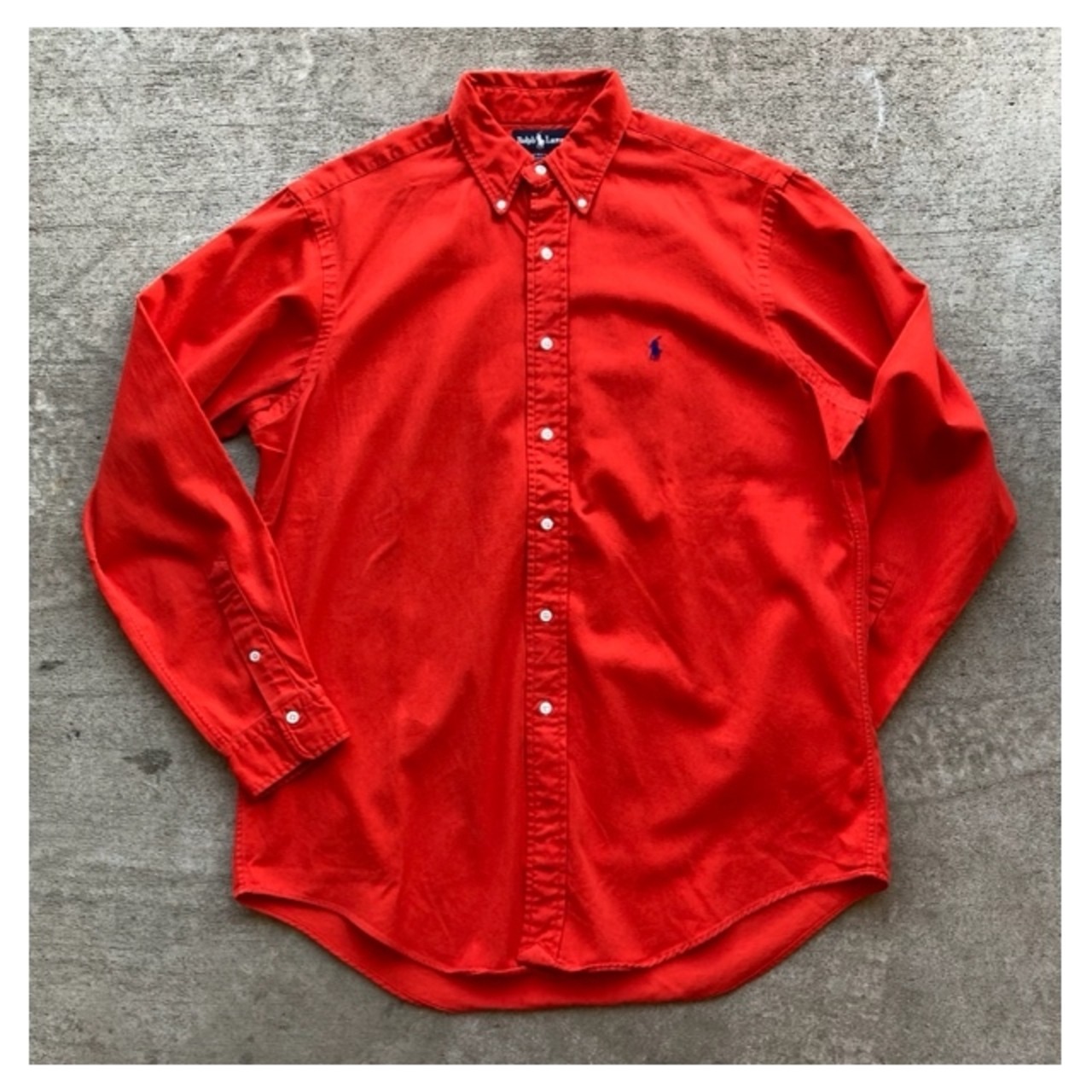 ラルフローレンのボタンダウンシャツです。コシのあるオックスフォード生地で褐色感のあるレッドカラーが非常に良い雰囲気の1枚です。朱色に近い感じでしょうか?仕様は定番のポロプレイヤーロゴが刺繍されています。嬉しいアメリカ製です。