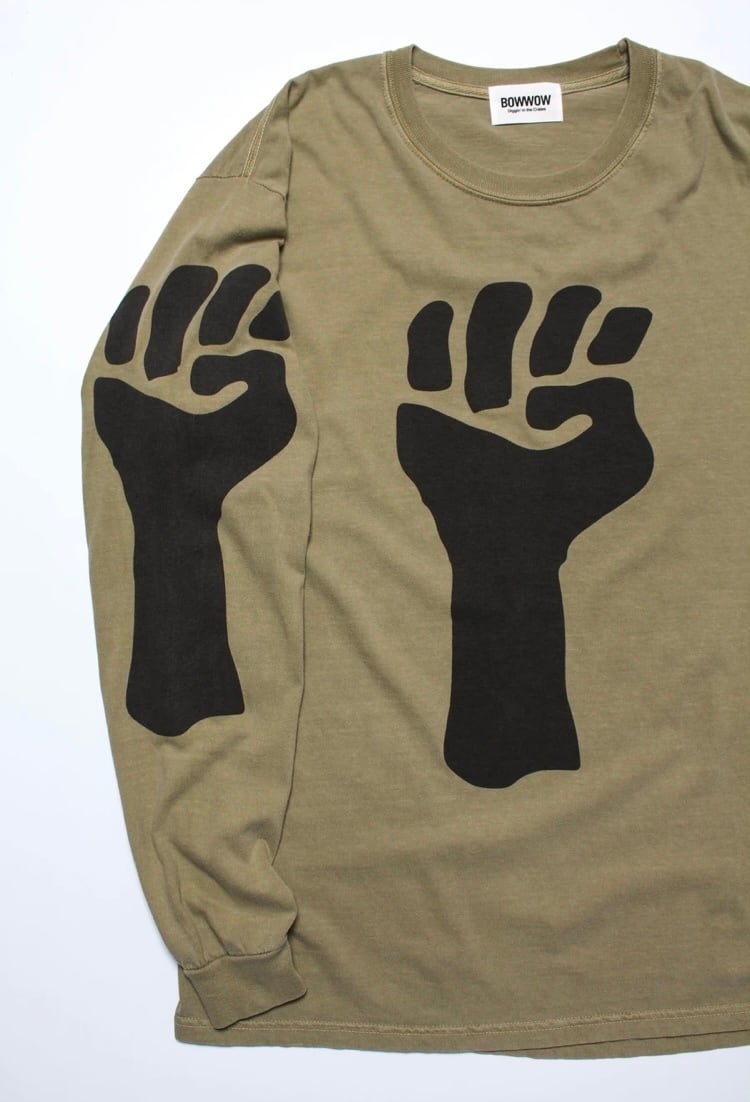 コットン100%のロングスリーブTシャツで、デザイナー自身心から伝えたいメッセージ「POWER TO THE PEOPLE」。力強い拳、真上へと突き上げる様が如何なるものかと語りかける様に。