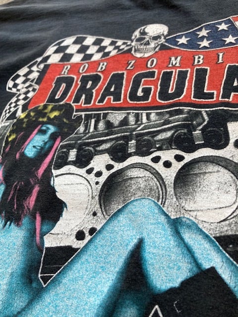 90年代ロブゾンビ”DRAGULA”プリントTシャツです。1985年の”ホワイトゾンビ”でデビューし、98年にはソロ名義で”ROB ZOBIE”としてデビュー。同年にアルバム”HELLBILLY DELUXIE”を発売。そのアルバムに収録されている”DRAGULA”。こちらはロブゾンビの代表曲の1曲でもあります。バックにコピーライト付き。袖、裾ともにダブルステッチ。