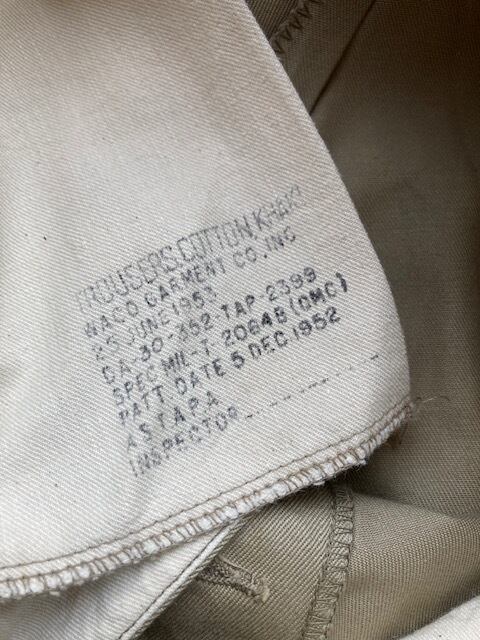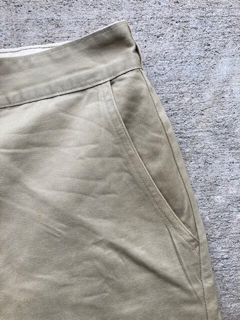 1950年代チノトラウザーです。Mil-T-2064Bになり、1952年12月5日に制式採用され、その後1954年までの約2年採用されたモデル。こちらは1953年6月25日製造の1本。Mil-T-2064Bからウエストバンドが独立した生地の作りとなり、ベルトループは短いものが取り付けられています。ボタンフライ仕様なのはもちろん、バックポケットにも尿素ボタンが付属されています。斜めに入るフロントポケットに、コインポケットは玉縁仕様ではなくなります。シルエットは50年代らしい太さを持った1本です。
