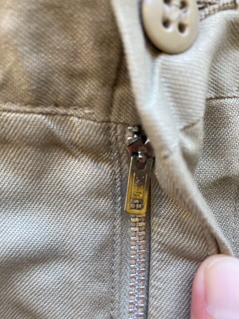 1950年代U.S.A.Fトロピカルトラウザーです。Mil-T-4995になり、1956年10月12日製造の1本。アーミートラウザーとは異なり、トロピカルと謳っており、やや薄手のツイル生地を採用しており、実際には夏仕様とされていたパンツです。50年代ではありますがジッパーフライ仕様となり、ジッパーはRAPIDを採用。ベルトループはアーミーとは異なり長めのものが採用されていますので、ベルトも選びません。左バックポケットのみボタンが付属されています。フロントは斜めに入るフロントポケットになります。シルエットはU.S.ARMY以上に太さのある1本です。